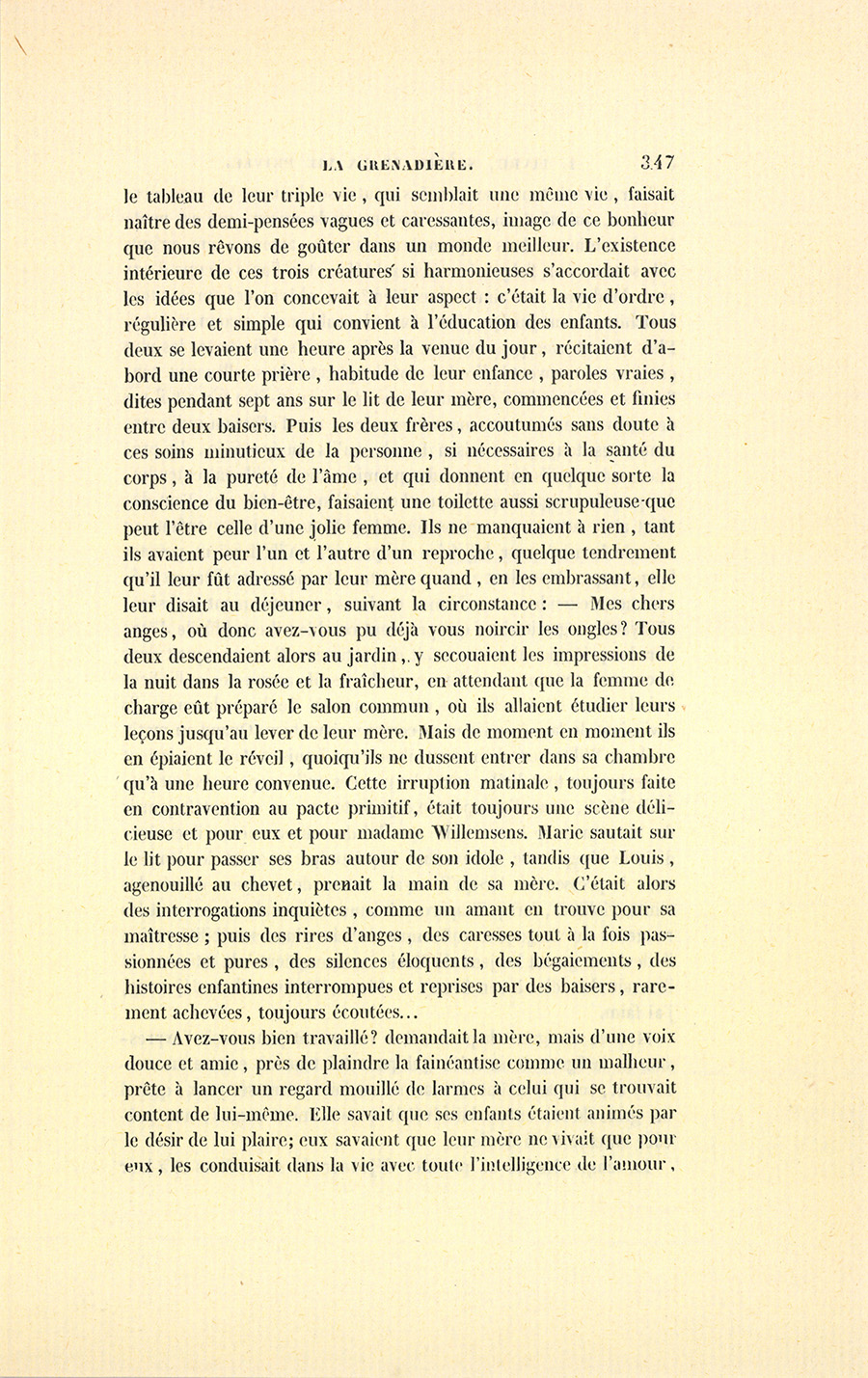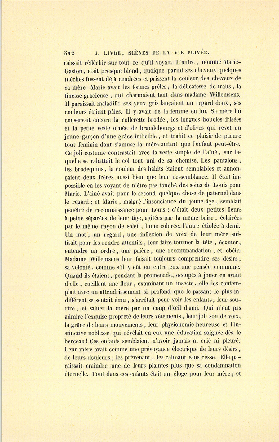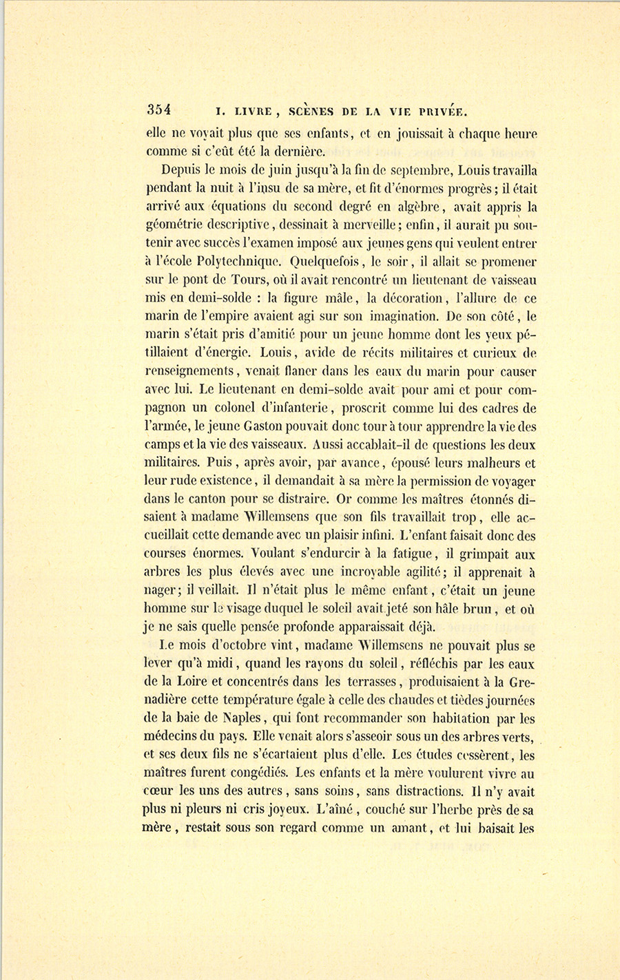 Depuis ce jour où madame Willemsens, prévoyant sa mort prochaine, avait parlé à son fils aîné de son sort à venir, Louis, qui avait achevé sa quatorzième année, devint moins distrait, plus appliqué, moins disposé à jouer qu’auparavant. Soit qu’il sût persuader à Marie de lire au lieu de se livrer à des distractions bruyantes, les deux enfants firent moins de tapage à travers les chemins creux, les jardins, les terrasses étagées de la Grenadière. Ils conformèrent leur vie à la pensée mélancolique de leur mère dont le teint pâlissait {p. 353} de jour en jour, en prenant des teintes jaunes, dont le front se creusait aux tempes, dont les rides devenaient plus profondes de nuit en nuit.