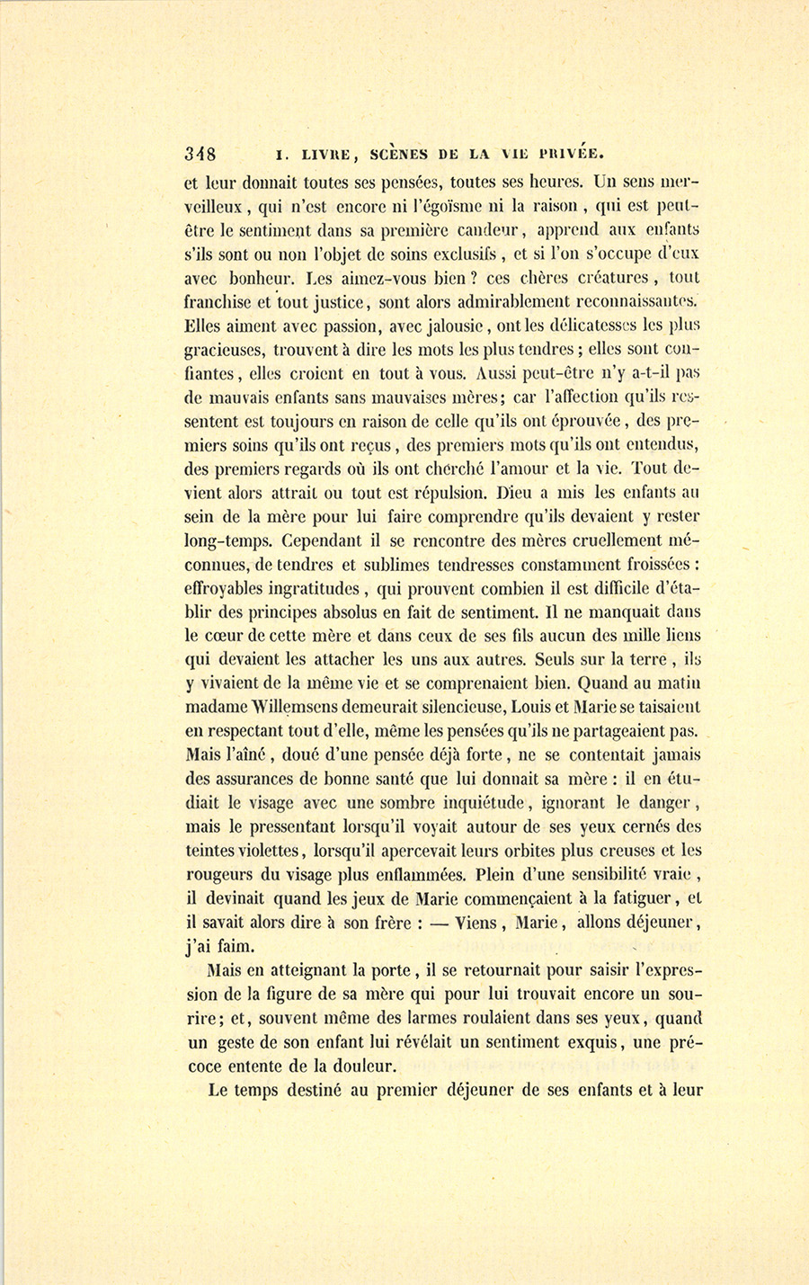 – Mon fils, répondit-elle, nous devons ensevelir nos peines aux yeux des étrangers, leur montrer un visage riant, ne jamais leur parler de nous, nous occuper d’eux : ces maximes pratiquées en famille y sont une des causes du bonheur. Tu auras à souffrir beaucoup un jour ! Eh ! bien, souviens-toi de ta pauvre mère qui se mourait devant toi en te souriant toujours, et te cachait ses douleurs ; tu te trouveras alors du courage pour supporter les maux de la vie.