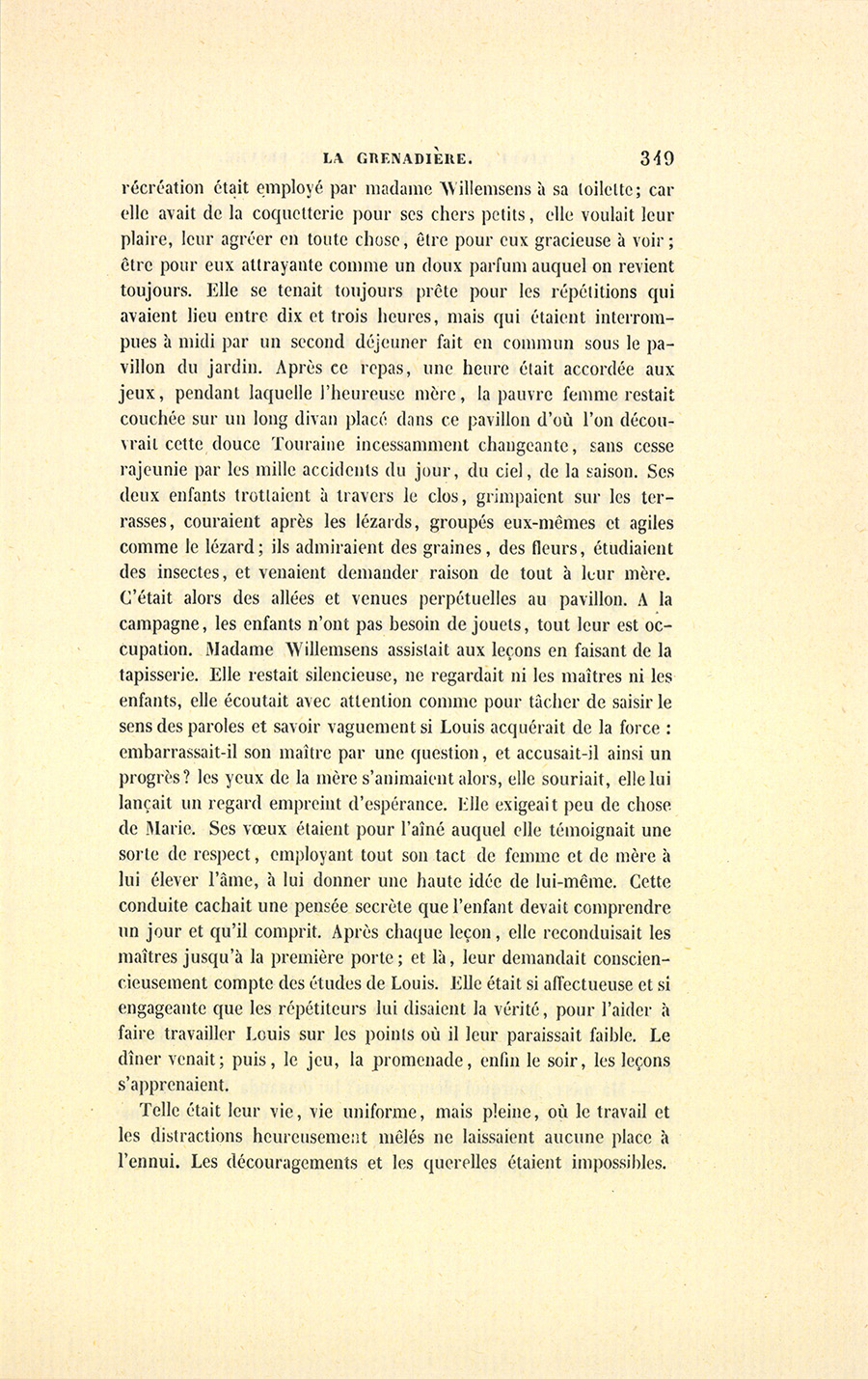Le temps destiné au premier déjeuner de ses enfants et à leur {p. 349} récréation était employé par madame Willemsens à sa toilette ; car elle avait de la coquetterie pour ses chers petits, elle voulait leur plaire, leur agréer en toute chose, être pour eux gracieuse à voir ; être pour eux attrayante comme un doux parfum auquel on revient toujours. Elle se tenait toujours prête pour les répétitions qui avaient lieu entre dix et trois heures, mais qui étaient interrompues à midi par un second déjeuner fait en commun sous le pavillon du jardin. Après ce repas, une heure était accordée aux jeux, pendant laquelle l’heureuse mère, la pauvre femme restait couchée sur un long divan placé dans ce pavillon d’où l’on découvrait cette douce Touraine incessamment changeante, sans cesse rajeunie par les mille accidents du jour, du ciel, de la saison. Ses deux enfants trottaient à travers le clos, grimpaient sur les terrasses, couraient après les lézards, groupés eux-mêmes et agiles comme le lézard ; ils admiraient des graines, des fleurs, étudiaient des insectes, et venaient demander raison de tout à leur mère. C’était alors des allées et venues perpétuelles au pavillon. À la campagne, les enfants n’ont pas besoin de jouets, tout leur est occupation. Madame Willemsens assistait aux leçons en faisant de la tapisserie. Elle restait silencieuse, ne regardait ni les maîtres ni les enfants, elle écoutait avec attention comme pour tâcher de saisir le sens des paroles et savoir vaguement si Louis acquérait de la force : embarrassait-il son maître par une question, et accusait-il ainsi un progrès ? les yeux de la mère s’animaient alors, elle souriait, elle lui lançait un regard empreint d’espérance. Elle exigeait peu de chose de Marie. Ses vœux étaient pour l’aîné auquel elle témoignait une sorte de respect, employant tout son tact de femme et de mère à lui élever l’âme, à lui donner une haute idée de lui-même. Cette conduite cachait une pensée secrète que l’enfant devait comprendre un jour et qu’il comprit. Après chaque leçon, elle reconduisait les maîtres jusqu’à la première porte ; et là, leur demandait consciencieusement compte des études de Louis. Elle était si affectueuse et si engageante que les répétiteurs lui disaient la vérité, pour l’aider à faire travailler Louis sur les points où il leur paraissait faible. Le dîner venait ; puis, le jeu, la promenade, enfin le soir, les leçons s’apprenaient.