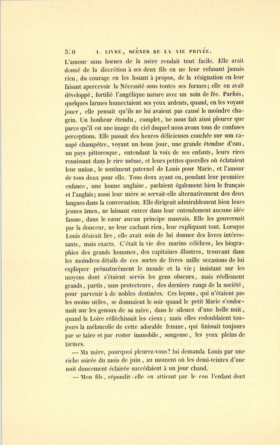 – Ma mère, pourquoi pleurez-vous ? lui demanda Louis par une riche soirée du mois de juin, au moment où les demi-teintes d’une nuit doucement éclairée succédaient à un jour chaud.