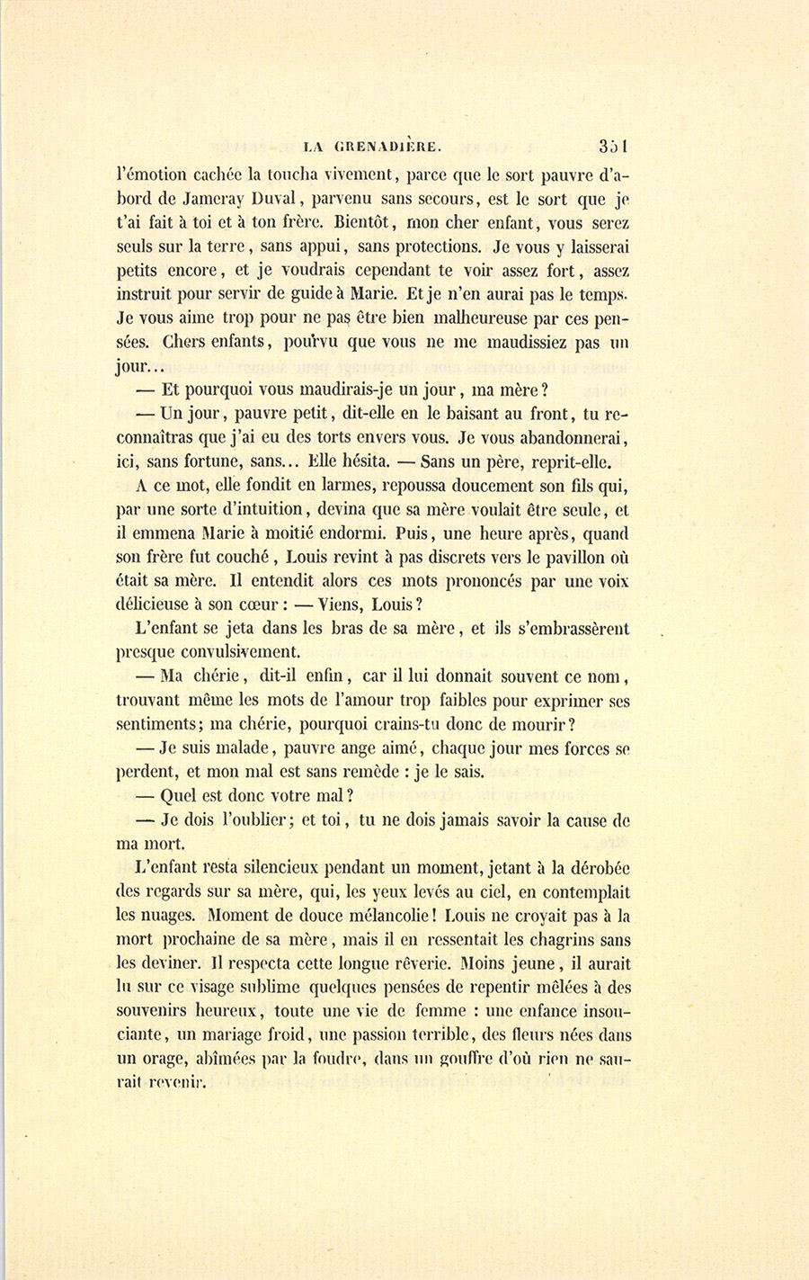 – Mon fils, répondit-elle en attirant par le cou l’enfant dont {p. 351} l’émotion cachée la toucha vivement, parce que le sort pauvre d’abord de Jameray Duval, parvenu sans secours, est le sort que je t’ai fait à toi et à ton frère. Bientôt, mon cher enfant, vous serez seuls sur la terre, sans appui, sans protections. Je vous y laisserai petits encore, et je voudrais cependant te voir assez fort, assez instruit pour servir de guide à Marie. Et je n’en aurai pas le temps. Je vous aime trop pour ne pas être bien malheureuse par ces pensées. Chers enfants, pourvu que vous ne me maudissiez pas un jour…