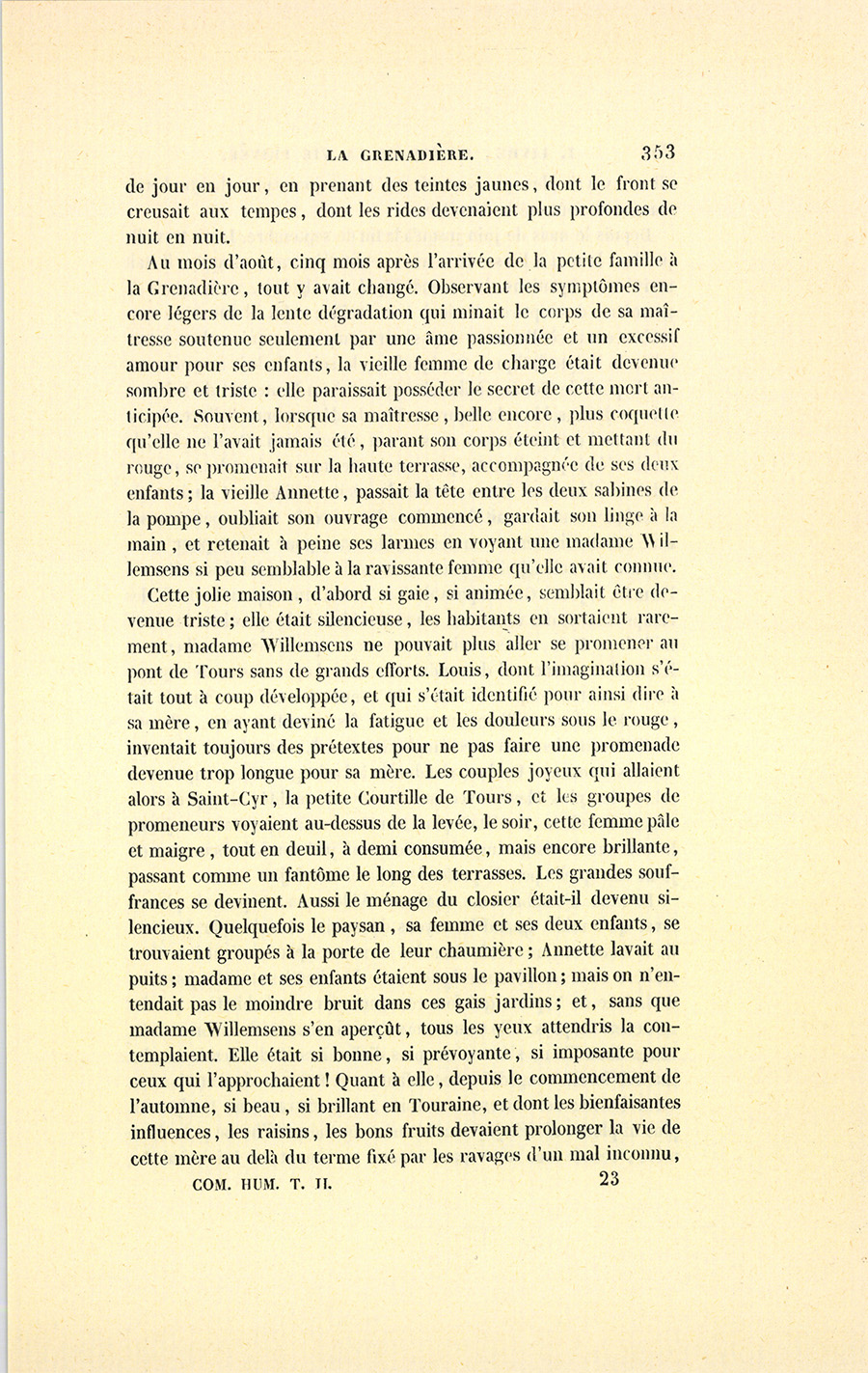Le mois d’octobre vint, madame Willemsens ne pouvait plus se lever qu’à midi, quand les rayons du soleil, réfléchis par les eaux de la Loire et concentrés dans les terrasses, produisaient à la Grenadière cette température égale à celle des chaudes et tièdes journées de la baie de Naples, qui font recommander son habitation par les médecins du pays. Elle venait alors s’asseoir sous un des arbres verts, et ses deux fils ne s’écartaient plus d’elle. Les études cessèrent, les maîtres furent congédiés. Les enfants et la mère voulurent vivre au cœur les uns des autres, sans soins, sans distractions. Il n’y avait plus ni pleurs ni cris joyeux. L’aîné, couché sur l’herbe près de sa mère, restait sous son regard comme un amant, et lui baisait les {p. 355} pieds. Marie, inquiet, allait lui cueillir des fleurs, les lui apportait d’un air triste, et s’élevait sur la pointe des pieds pour prendre sur ses lèvres un baiser de jeune fille. Cette femme blanche, aux grands yeux noirs, tout abattue, lente dans ses mouvements, ne se plaignant jamais, souriant à ses deux enfants bien vivants, d’une belle santé, formaient un tableau sublime auquel ne manquaient ni les pompes mélancoliques de l’automne avec ses feuilles jaunies et ses arbres à demi dépouillés, ni la lueur adoucie du soleil et les nuages blancs du ciel de Touraine.