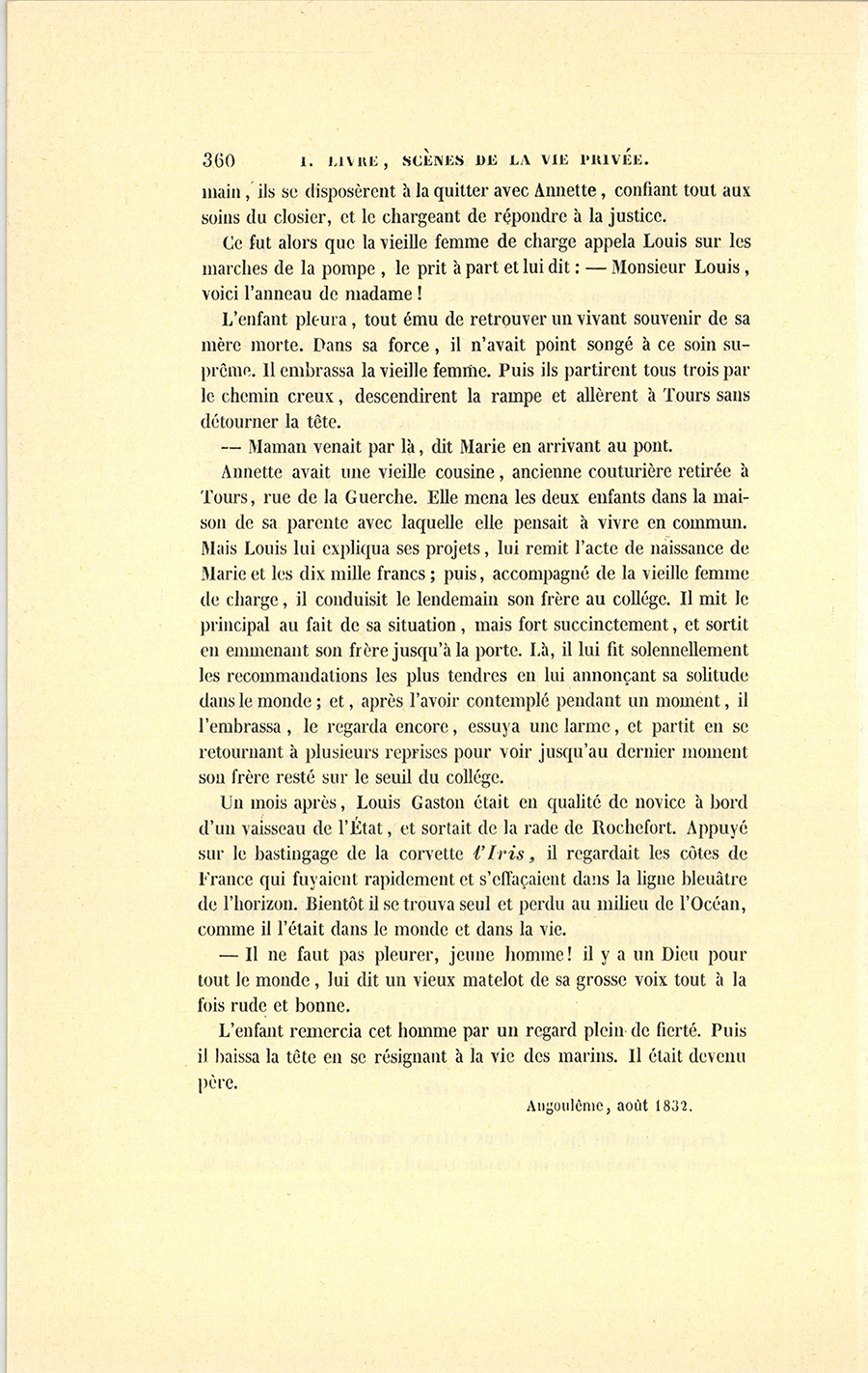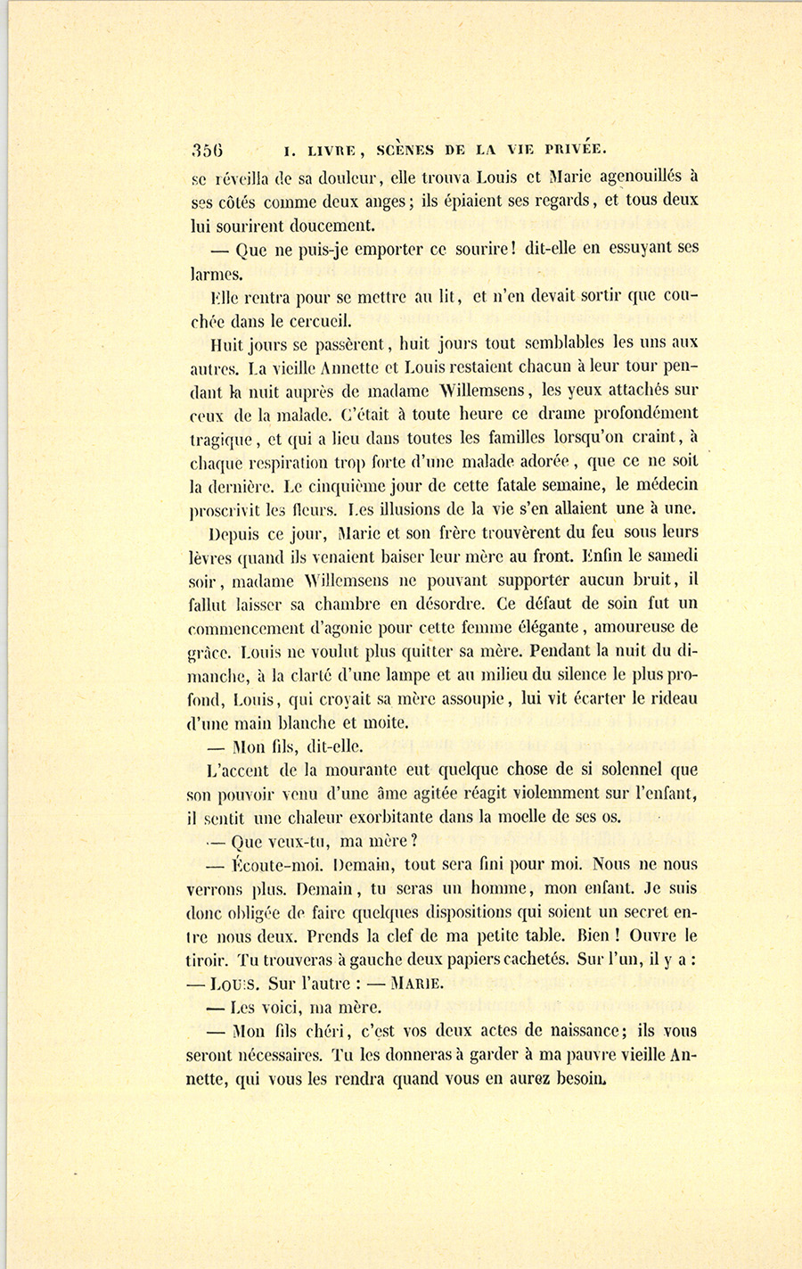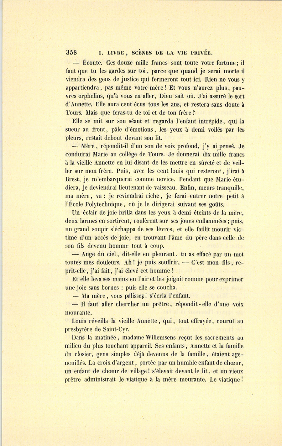 {p. 358} – Écoute. Ces douze mille francs sont toute votre fortune ; il faut que tu les gardes sur toi, parce que quand je serai morte il viendra des gens de justice qui fermeront tout ici. Rien ne vous y appartiendra, pas même votre mère ! Et vous n’aurez plus, pauvres orphelins, qu’à vous en aller, Dieu sait où. J’ai assuré le sort d’Annette. Elle aura cent écus tous les ans, et restera sans doute à Tours. Mais que feras-tu de toi et de ton frère ?