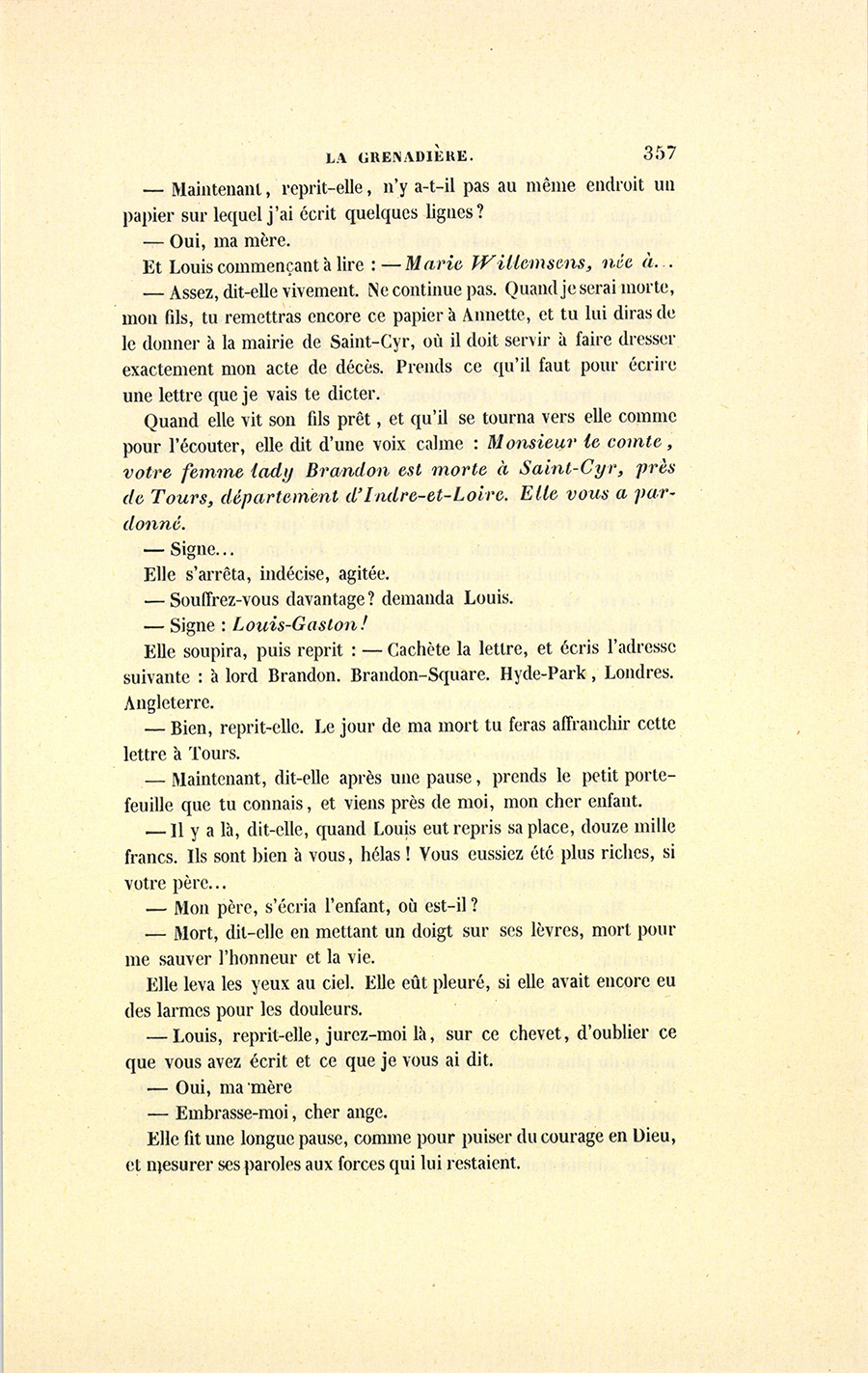 {p. 357} – Maintenant, reprit-elle, n’y a-t-il pas au même endroit un papier sur lequel j’ai écrit quelques lignes ?