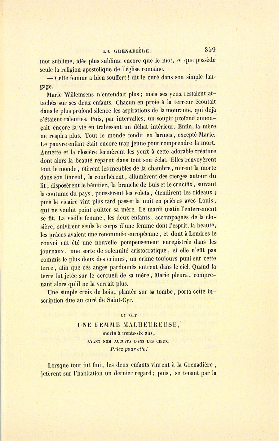 Dans la matinée, madame Willemsens reçut les sacrements au milieu du plus touchant appareil. Ses enfants, Annette et la famille du closier, gens simples déjà devenus de la famille, étaient agenouillés. La croix d’argent, portée par un humble enfant de chœur, un enfant de chœur de village ! s’élevait devant le lit, et un vieux prêtre administrait le viatique à la mère mourante. Le viatique ! {p. 359} mot sublime, idée plus sublime encore que le mot, et que possède seule la religion apostolique de l’église romaine.