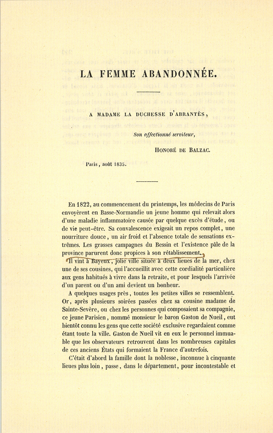 [ill.]En 1822, au commencement du printemps, les médecins de Paris envoyèrent en Basse-Normandie un jeune homme qui relevait alors d’une maladie inflammatoire causée par quelque excès d’étude, ou de vie peut-être. Sa convalescence exigeait un repos complet, une nourriture douce, un air froid et l’absence totale de sensations extrêmes. Les grasses campagnes du Bessin et l’existence pâle de la province parurent donc propices à son rétablissement. Il vint à Bayeux, jolie ville située à deux lieues de la mer, chez une de ses cousines, qui l’accueillit avec cette cordialité particulière aux gens habitués à vivre dans la retraite, et pour lesquels l’arrivée d’un parent ou d’un ami devient un bonheur.