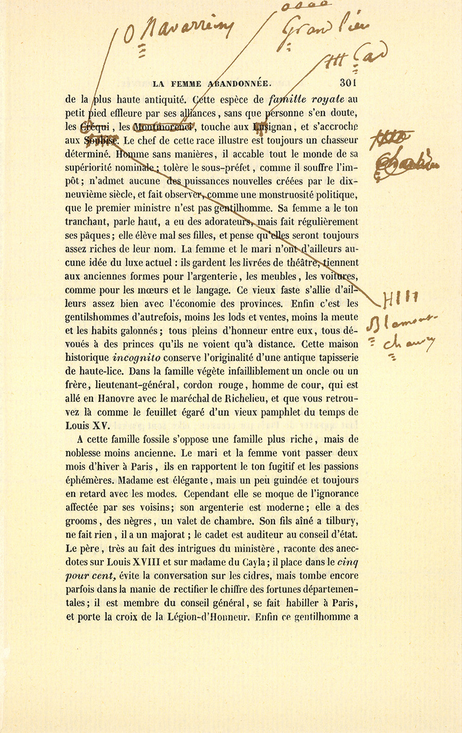C’était d’abord la famille dont la noblesse, inconnue à cinquante lieues plus loin, passe, dans le département, pour incontestable et {p. 301} de la plus haute antiquité. Cette espèce de famille royale au petit pied effleure par ses alliances, sans que personne s’en doute, les Navarreins, les Grandlieu, touche aux Cadignan, et s’accroche aux Blamont-Chauvry. Le chef de cette race illustre est toujours un chasseur déterminé. Homme sans manières, il accable tout le monde de sa supériorité nominale ; tolère le sous-préfet, comme il souffre l’impôt ; n’admet aucune des puissances nouvelles créées par le dix-neuvième siècle, et fait observer, comme une monstruosité politique, que le premier ministre n’est pas gentilhomme. Sa femme a le ton tranchant, parle haut, a eu des adorateurs, mais fait régulièrement ses pâques ; elle élève mal ses filles, et pense qu’elles seront toujours assez riches de leur nom. La femme et le mari n’ont d’ailleurs aucune idée du luxe actuel : ils gardent les livrées de théâtre, tiennent aux anciennes formes pour l’argenterie, les meubles, les voitures, comme pour les mœurs et le langage. Ce vieux faste s’allie d’ailleurs assez bien avec l’économie des provinces. Enfin c’est les gentilshommes d’autrefois, moins les lods et ventes, moins la meute et les habits galonnés ; tous pleins d’honneur entre eux, tous dévoués à des princes qu’ils ne voient qu’à distance. Cette maison historique incognito conserve l’originalité d’une antique tapisserie de haute-lice. Dans la famille végète infailliblement un oncle ou un frère, lieutenant-général, cordon rouge, homme de cour, qui est allé en Hanovre avec le maréchal de Richelieu, et que vous retrouvez là comme le feuillet égaré d’un vieux pamphlet du temps de Louis XV.