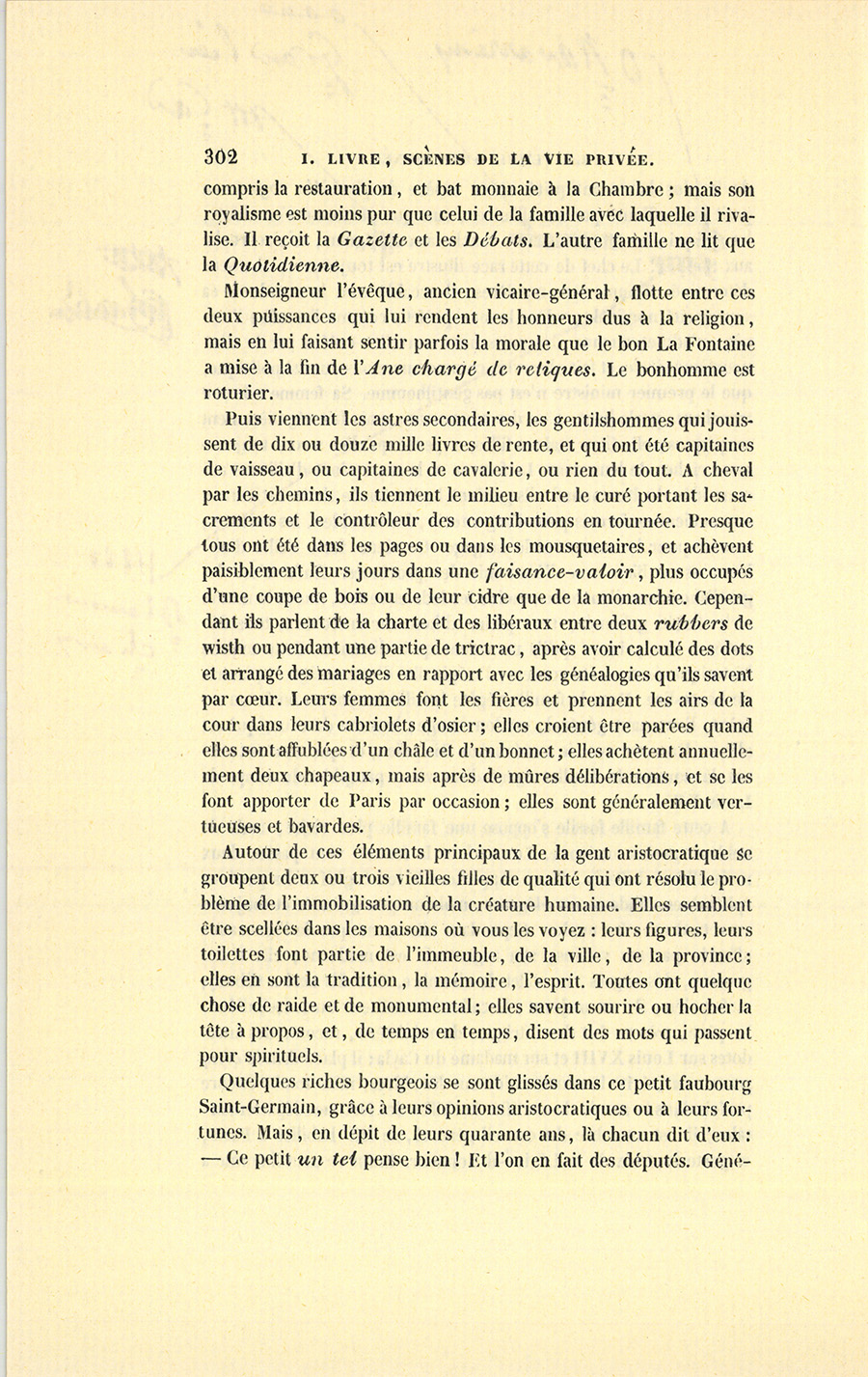 À cette famille fossile s’oppose une famille plus riche, mais de noblesse moins ancienne. Le mari et la femme vont passer deux mois d’hiver à Paris, ils en rapportent le ton fugitif et les passions éphémères. Madame est élégante, mais un peu guindée et toujours en retard avec les modes. Cependant elle se moque de l’ignorance affectée par ses voisins ; son argenterie est moderne ; elle a des grooms, des nègres, un valet de chambre. Son fils aîné a tilbury, ne fait rien, il a un majorat ; le cadet est auditeur au conseil d’état. Le père, très au fait des intrigues du ministère, raconte des anecdotes sur Louis XVIII et sur madame du Cayla ; il place dans le cinq pour cent, évite la conversation sur les cidres, mais tombe encore parfois dans la manie de rectifier le chiffre des fortunes départementales ; il est membre du conseil général, se fait habiller à Paris, et porte la croix de la Légion-d’Honneur. Enfin ce gentilhomme a {p. 302} compris la restauration, et bat monnaie à la Chambre ; mais son royalisme est moins pur que celui de la famille avec laquelle il rivalise. Il reçoit la Gazette et les Débats. L’autre famille ne lit que la Quotidienne.