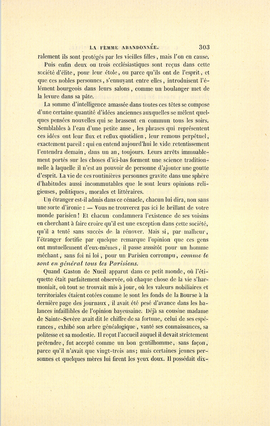 Un étranger est-il admis dans ce cénacle, chacun lui dira, non sans une sorte d’ironie : – Vous ne trouverez pas ici le brillant de votre monde parisien ! Et chacun condamnera l’existence de ses voisins en cherchant à faire croire qu’il est une exception dans cette société, qu’il a tenté sans succès de la rénover. Mais si, par malheur, l’étranger fortifie par quelque remarque l’opinion que ces gens ont mutuellement d’eux-mêmes, il passe aussitôt pour un homme méchant, sans foi ni loi, pour un Parisien corrompu, comme le sont en général tous les Parisiens.