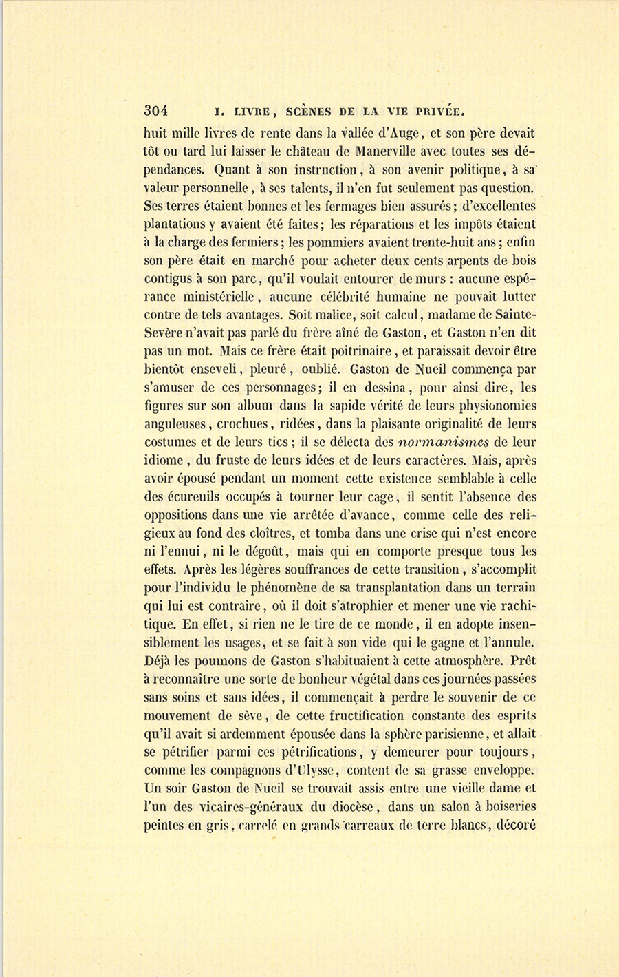 Quand Gaston de Nueil apparut dans ce petit monde, où l’étiquette était parfaitement observée, où chaque chose de la vie s’harmoniait, où tout se trouvait mis à jour, où les valeurs nobiliaires et territoriales étaient cotées comme le sont les fonds de la Bourse à la dernière page des journaux, il avait été pesé d’avance dans les balances infaillibles de l’opinion bayeusaine. Déjà sa cousine madame de Sainte-Sevère avait dit le chiffre de sa fortune, celui de ses espérances, exhibé son arbre généalogique, vanté ses connaissances, sa politesse et sa modestie. Il reçut l’accueil auquel il devait strictement prétendre, fut accepté comme un bon gentilhomme, sans façon, parce qu’il n’avait que vingt-trois ans ; mais certaines jeunes personnes et quelques mères lui firent les yeux doux. Il possédait {p. 304} dix-huit mille livres de rente dans la vallée d’Auge, et son père devait tôt ou tard lui laisser le château de Manerville avec toutes ses dépendances. Quant à son instruction, à son avenir politique, à sa valeur personnelle, à ses talents, il n’en fut seulement pas question. Ses terres étaient bonnes et les fermages bien assurés ; d’excellentes plantations y avaient été faites ; les réparations et les impôts étaient à la charge des fermiers ; les pommiers avaient trente-huit ans ; enfin son père était en marché pour acheter deux cents arpents de bois contigus à son parc, qu’il voulait entourer de murs : aucune espérance ministérielle, aucune célébrité humaine ne pouvait lutter contre de tels avantages. Soit malice, soit calcul, madame de Sainte-Sevère n’avait pas parlé du frère aîné de Gaston, et Gaston n’en dit pas un mot. Mais ce frère était poitrinaire, et paraissait devoir être bientôt enseveli, pleuré, oublié. Gaston de Nueil commença par s’amuser de ces personnages ; il en dessina, pour ainsi dire, les figures sur son album dans la sapide vérité de leurs physionomies anguleuses, crochues, ridées, dans la plaisante originalité de leurs costumes et de leurs tics ; il se délecta des normanismes de leur idiome, du fruste de leurs idées et de leurs caractères. Mais, après avoir épousé pendant un moment cette existence semblable à celle des écureuils occupés à tourner leur cage, il sentit l’absence des oppositions dans une vie arrêtée d’avance, comme celle des religieux au fond des cloîtres, et tomba dans une crise qui n’est encore ni l’ennui, ni le dégoût, mais qui en comporte presque tous les effets. Après les légères souffrances de cette transition, s’accomplit pour l’individu le phénomène de sa transplantation dans un terrain qui lui est contraire, où il doit s’atrophier et mener une vie rachitique. En effet, si rien ne le tire de ce monde, il en adopte insensiblement les usages, et se fait à son vide qui le gagne et l’annule. Déjà les poumons de Gaston s’habituaient à cette atmosphère. Prêt à reconnaître une sorte de bonheur végétal dans ces journées passées sans soins et sans idées, il commençait à perdre le souvenir de ce mouvement de sève, de cette fructification constante des esprits qu’il avait si ardemment épousée dans la sphère parisienne, et allait se pétrifier parmi ces pétrifications, y demeurer pour toujours, comme les compagnons d’Ulysse, content de sa grasse enveloppe. Un soir Gaston de Nueil se trouvait assis entre une vieille dame et l’un des vicaires-généraux du diocèse, dans un salon à boiseries peintes en gris, carrelé en grands carreaux de terre blancs, décoré {p. 305} de quelques portraits de famille, garni de quatre tables de jeu, autour desquelles seize personnes babillaient en jouant au wisth. Là, ne pensant à rien, mais digérant un de ces dîners exquis, l’avenir de la journée en province, il se surprit à justifier les usages du pays. Il concevait pourquoi ces gens-là continuaient à se servir des cartes de la veille, à les battre sur des tapis usés, et comment ils arrivaient à ne plus s’habiller ni pour eux-mêmes ni pour les autres. Il devinait je ne sais quelle philosophie dans le mouvement uniforme de cette vie circulaire, dans le calme de ces habitudes logiques et dans l’ignorance des choses élégantes. Enfin il comprenait presque l’inutilité du luxe. La ville de Paris, avec ses passions, ses orages et ses plaisirs, n’était déjà plus dans son esprit que comme un souvenir d’enfance. Il admirait de bonne foi les mains rouges, l’air modeste et craintif d’une jeune personne dont, à la première vue, la figure lui avait paru niaise, les manières sans grâces, l’ensemble repoussant et la mine souverainement ridicule. C’en était fait de lui. Venu de la province à Paris, il allait retomber de l’existence inflammatoire de Paris dans la froide vie de province, sans une phrase qui frappa son oreille et lui apporta soudain une émotion semblable à celle que lui aurait causée quelque motif original parmi les accompagnements d’un opéra ennuyeux.