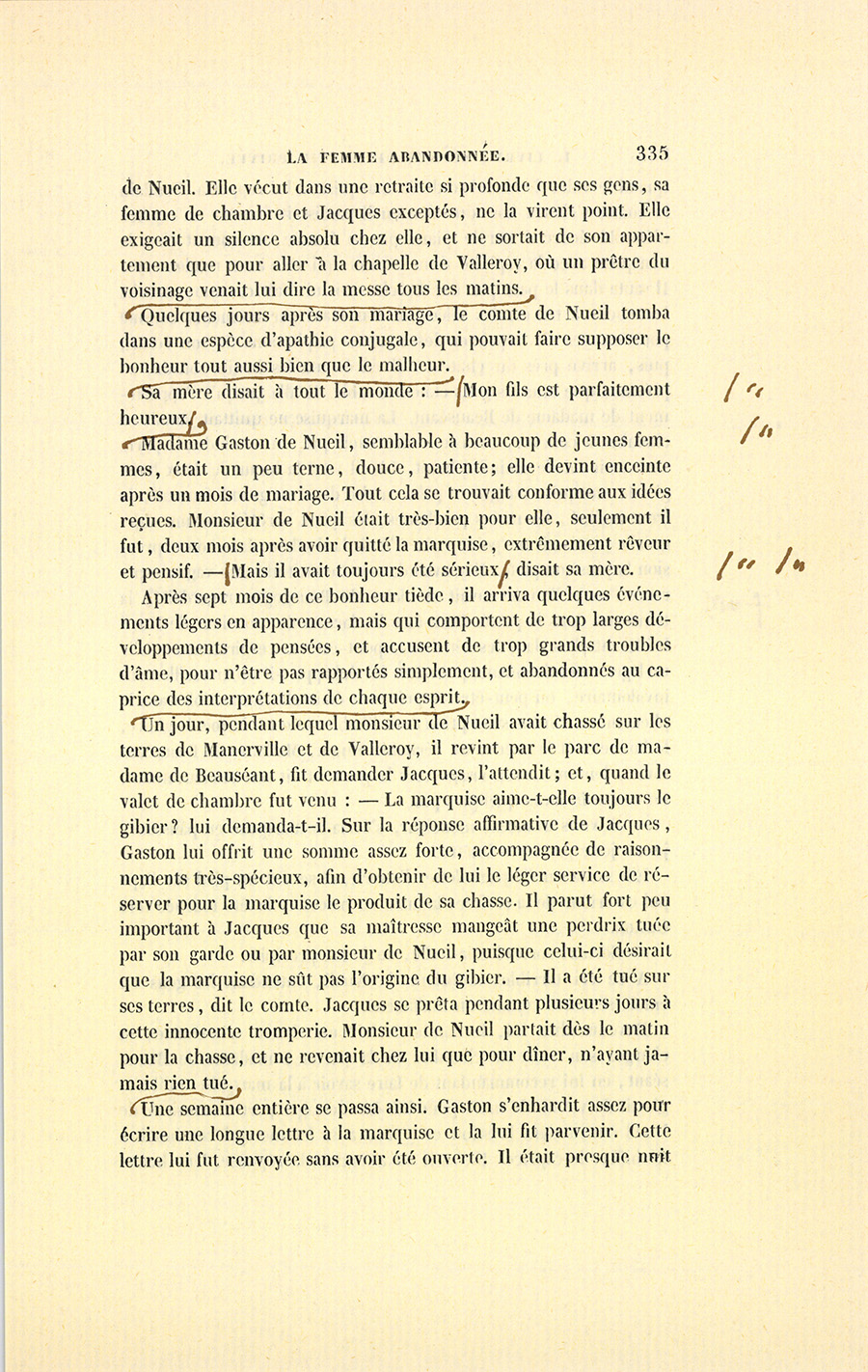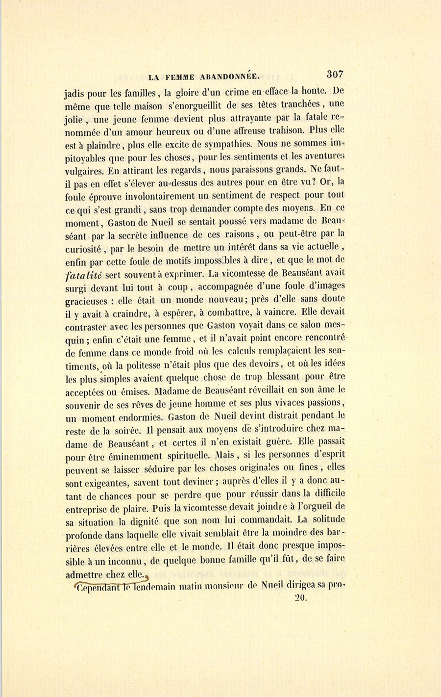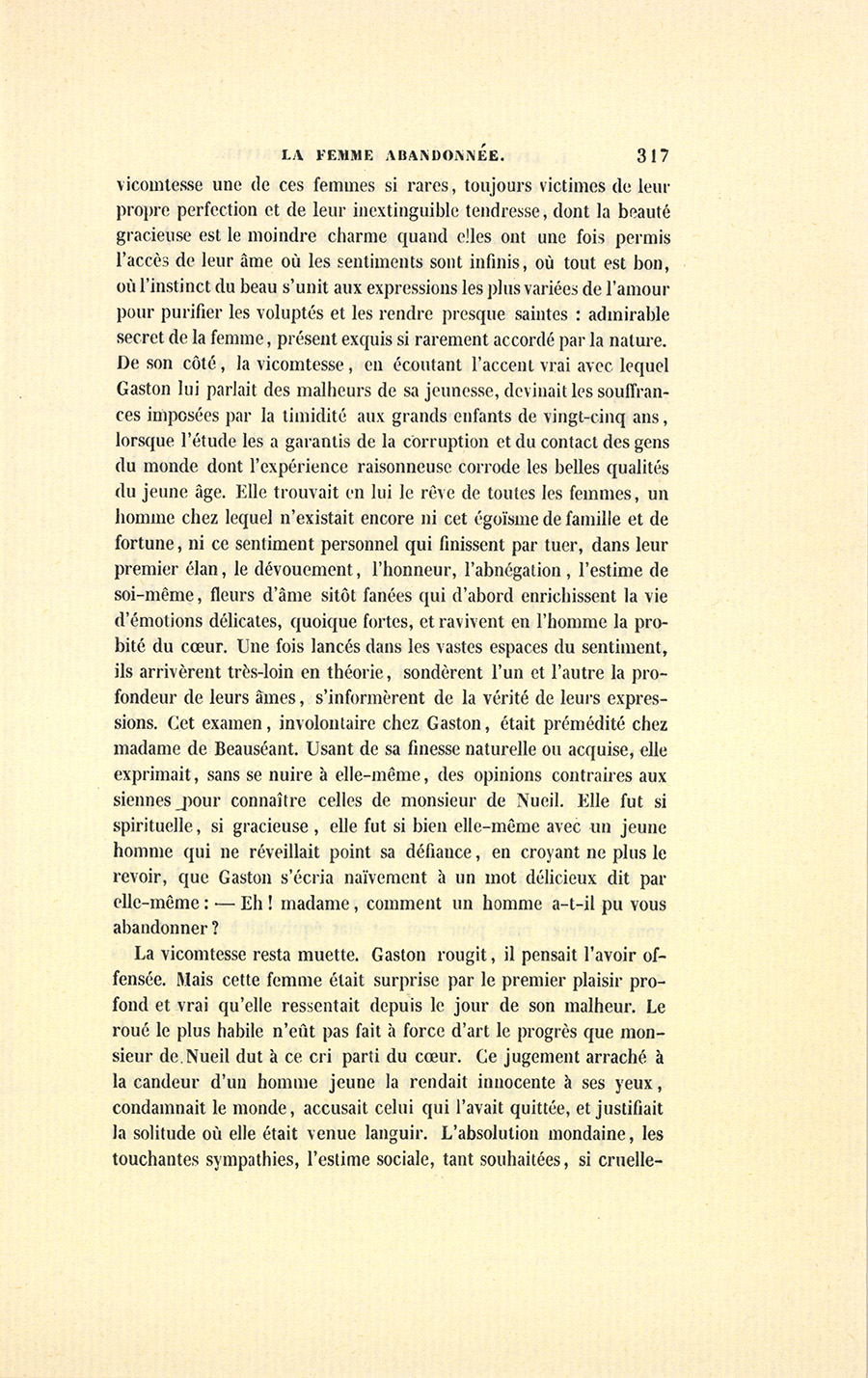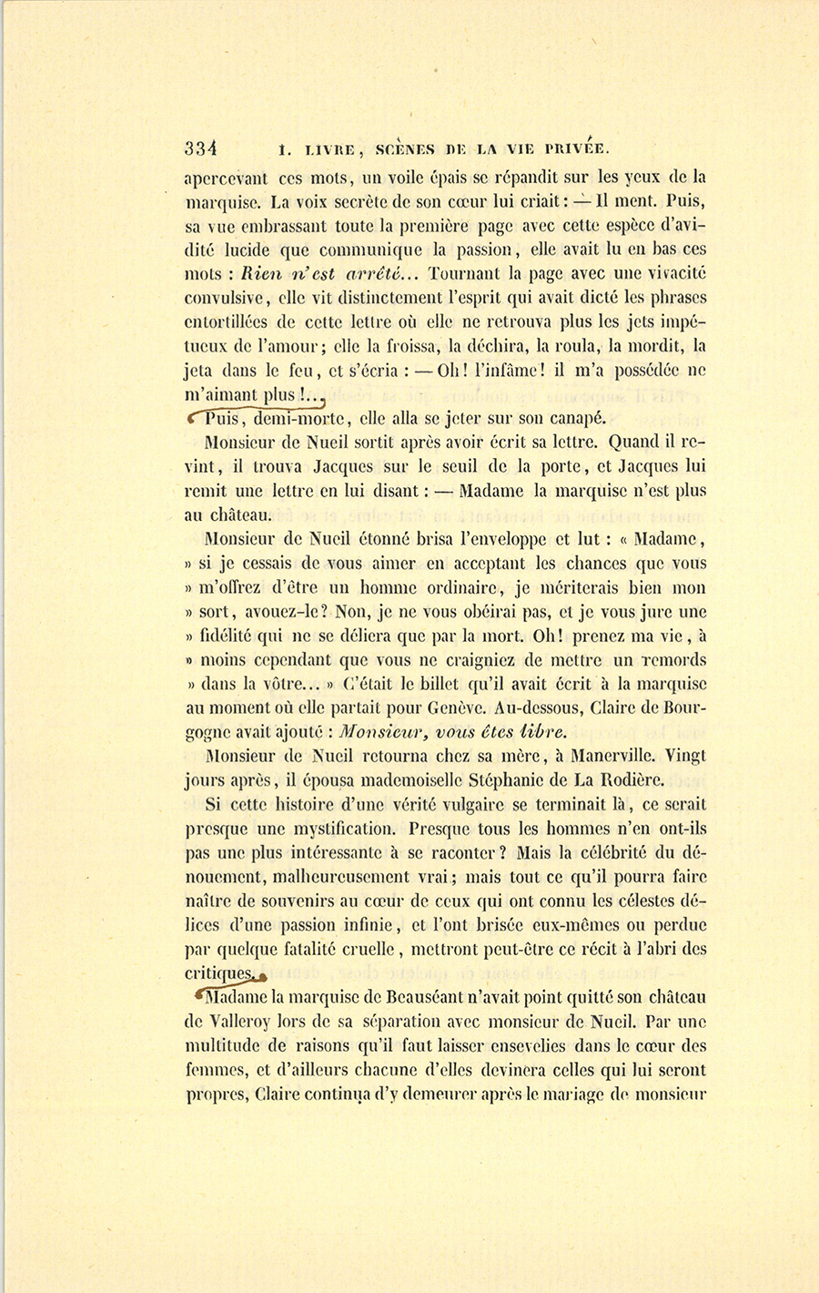 Si cette histoire d’une vérité vulgaire se terminait là, ce serait presque une mystification. Presque tous les hommes n’en ont-ils pas une plus intéressante à se raconter ? Mais la célébrité du dénouement, malheureusement vrai ; mais tout ce qu’il pourra faire naître de souvenirs au cœur de ceux qui ont connu les célestes délices d’une passion infinie, et l’ont brisée eux-mêmes ou perdue par quelque fatalité cruelle, mettront peut-être ce récit à l’abri des critiques. Madame la marquise de Beauséant n’avait point quitté son château de Valleroy lors de sa séparation avec monsieur de Nueil. Par une multitude de raisons qu’il faut laisser ensevelies dans le cœur des femmes, et d’ailleurs chacune d’elles devinera celles qui lui seront propres, Claire continua d’y demeurer après le mariage de monsieur {p. 335} de Nueil. Elle vécut dans une retraite si profonde que ses gens, sa femme de chambre et Jacques exceptés, ne la virent point. Elle exigeait un silence absolu chez elle, et ne sortait de son appartement que pour aller à la chapelle de Valleroy, où un prêtre du voisinage venait lui dire la messe tous les matins. Quelques jours après son mariage, le comte de Nueil tomba dans une espèce d’apathie conjugale, qui pouvait faire supposer le bonheur tout aussi bien que le malheur. Sa mère disait à tout le monde : – « Mon fils est parfaitement heureux. » Madame Gaston de Nueil, semblable à beaucoup de jeunes femmes, était un peu terne, douce, patiente ; elle devint enceinte après un mois de mariage. Tout cela se trouvait conforme aux idées reçues. Monsieur de Nueil était très-bien pour elle, seulement il fut, deux mois après avoir quitté la marquise, extrêmement rêveur et pensif. – « Mais il avait toujours été sérieux », disait sa mère.