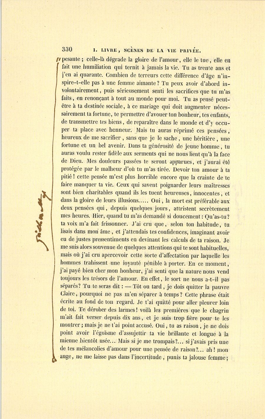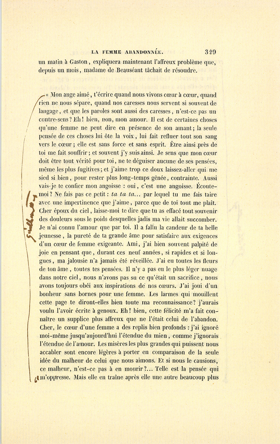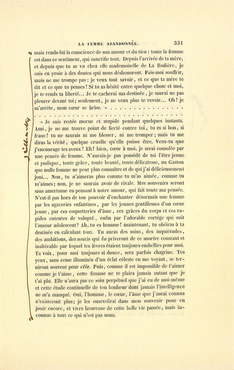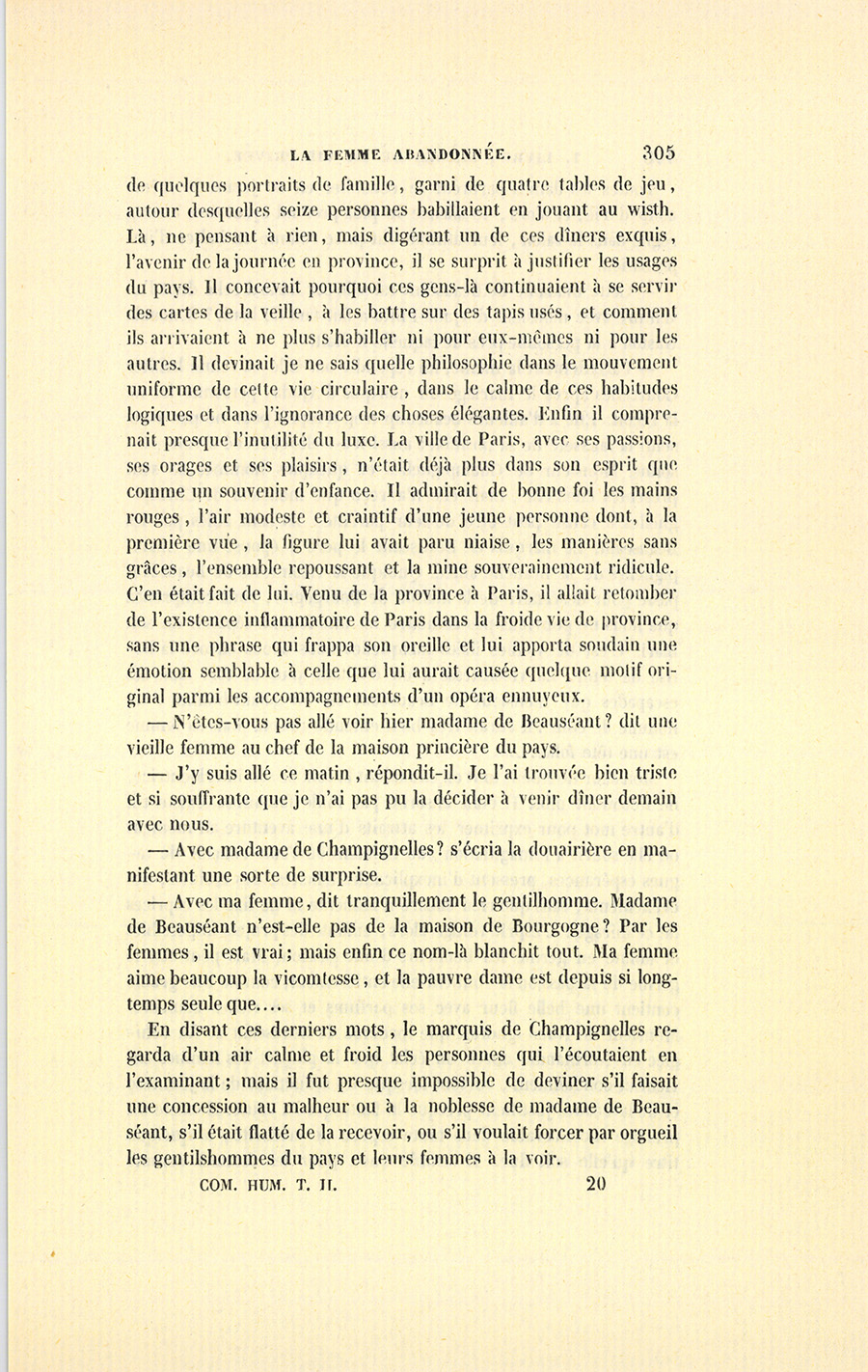 Si cette histoire d’une vérité vulgaire se terminait là, ce serait presque une mystification. Presque tous les hommes n’en ont-ils pas une plus intéressante à se raconter ? Mais la célébrité du dénouement, malheureusement vrai ; mais tout ce qu’il pourra faire naître de souvenirs au cœur de ceux qui ont connu les célestes délices d’une passion infinie, et l’ont brisée eux-mêmes ou perdue par quelque fatalité cruelle, mettront peut-être ce récit à l’abri des critiques. Madame la marquise de Beauséant n’avait point quitté son château de Valleroy lors de sa séparation avec monsieur de Nueil. Par une multitude de raisons qu’il faut laisser ensevelies dans le cœur des femmes, et d’ailleurs chacune d’elles devinera celles qui lui seront propres, Claire continua d’y demeurer après le mariage de monsieur {p. 335} de Nueil. Elle vécut dans une retraite si profonde que ses gens, sa femme de chambre et Jacques exceptés, ne la virent point. Elle exigeait un silence absolu chez elle, et ne sortait de son appartement que pour aller à la chapelle de Valleroy, où un prêtre du voisinage venait lui dire la messe tous les matins. Quelques jours après son mariage, le comte de Nueil tomba dans une espèce d’apathie conjugale, qui pouvait faire supposer le bonheur tout aussi bien que le malheur. Sa mère disait à tout le monde : – « Mon fils est parfaitement heureux. » Madame Gaston de Nueil, semblable à beaucoup de jeunes femmes, était un peu terne, douce, patiente ; elle devint enceinte après un mois de mariage. Tout cela se trouvait conforme aux idées reçues. Monsieur de Nueil était très-bien pour elle, seulement il fut, deux mois après avoir quitté la marquise, extrêmement rêveur et pensif. – « Mais il avait toujours été sérieux », disait sa mère.