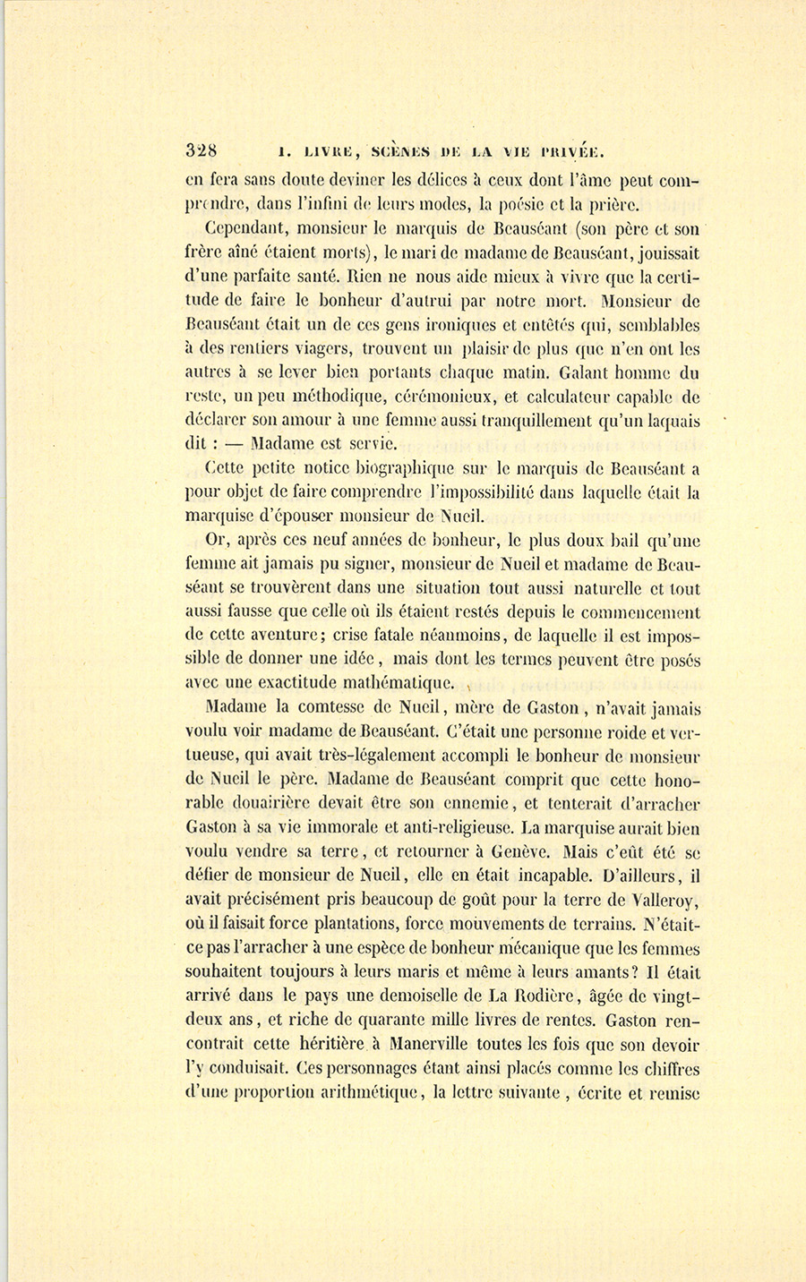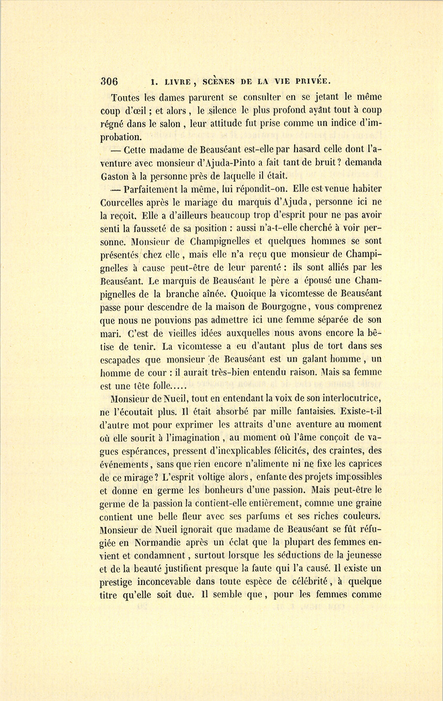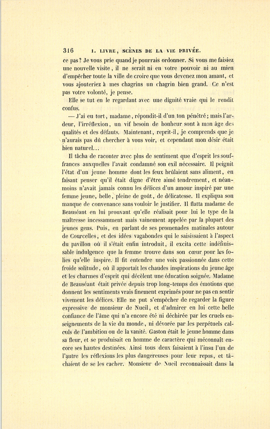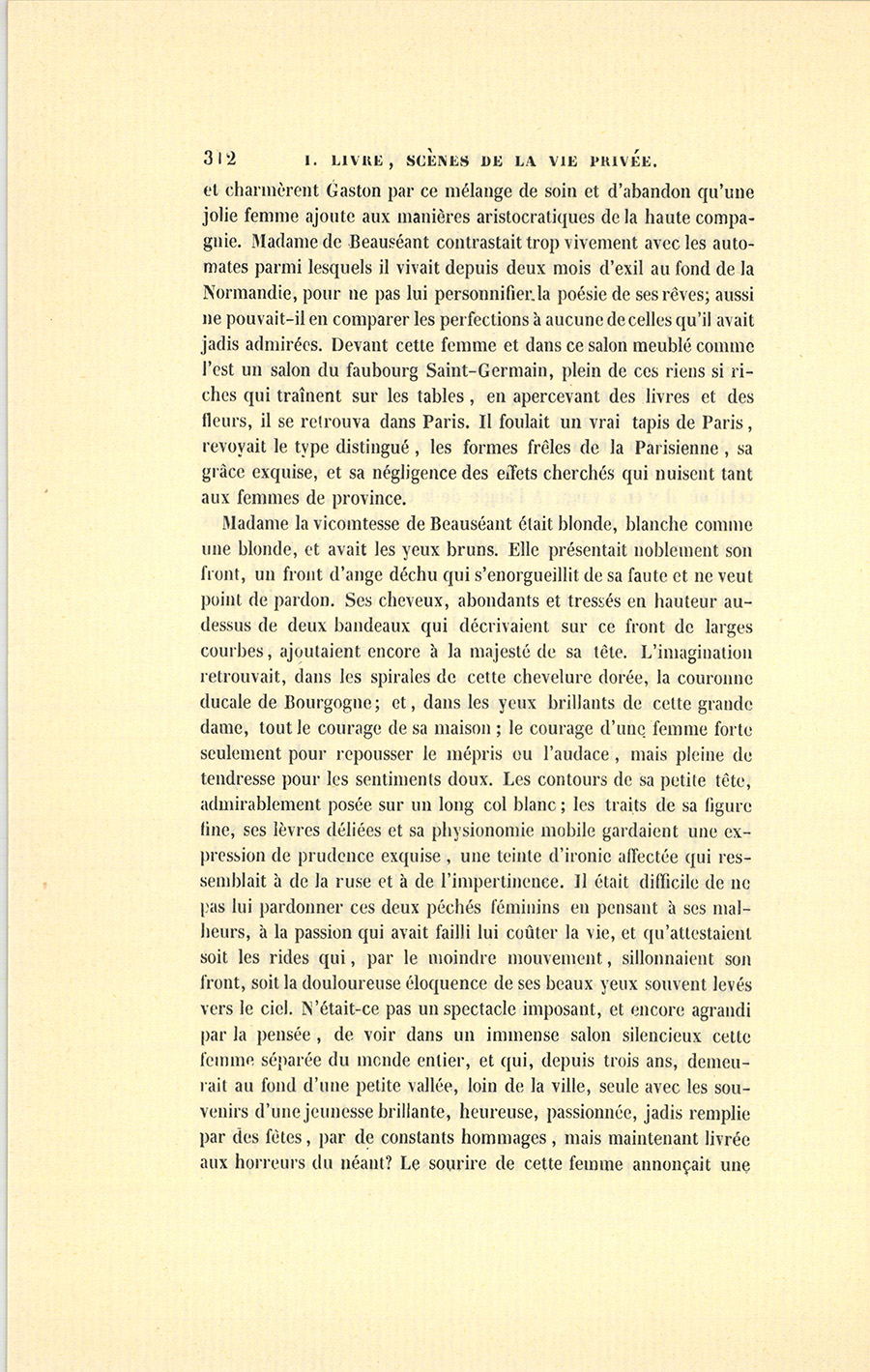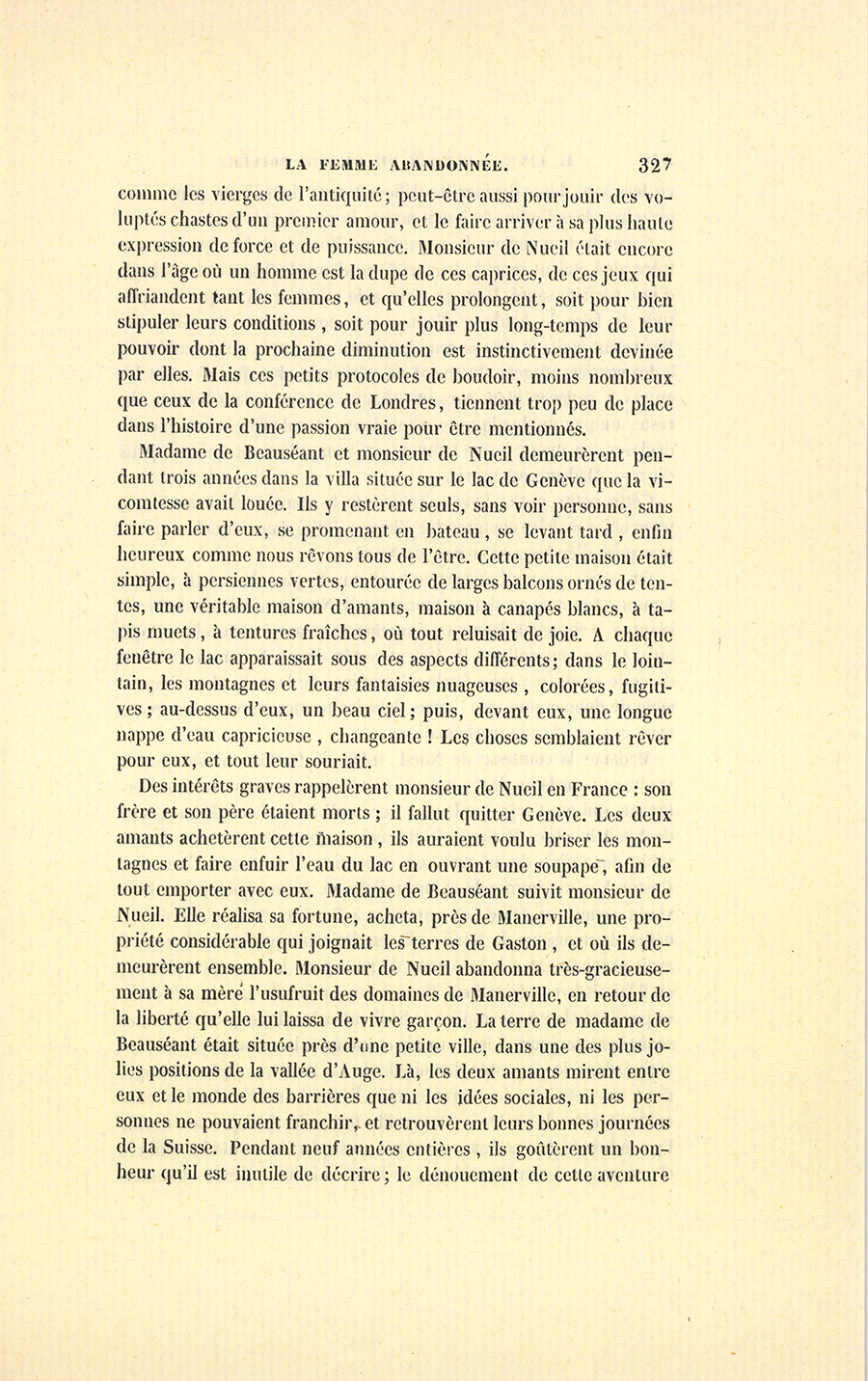 Des intérêts graves rappelèrent monsieur de Nueil en France : son frère et son père étaient morts ; il fallut quitter Genève. Les deux amants achetèrent cette maison, ils auraient voulu briser les montagnes et faire enfuir l’eau du lac en ouvrant une soupape, afin de tout emporter avec eux. Madame de Beauséant suivit monsieur de Nueil. Elle réalisa sa fortune, acheta, près de Manerville, une propriété considérable qui joignait les terres de Gaston, et où ils demeurèrent ensemble. Monsieur de Nueil abandonna très-gracieusement à sa mère l’usufruit des domaines de Manerville, en retour de la liberté qu’elle lui laissa de vivre garçon. La terre de madame de Beauséant était située près d’une petite ville, dans une des plus jolies positions de la vallée d’Auge. Là, les deux amants mirent entre eux et le monde des barrières que ni les idées sociales, ni les personnes ne pouvaient franchir, et retrouvèrent leurs bonnes journées de la Suisse. Pendant neuf années entières, ils goûtèrent un bonheur qu’il est inutile de décrire ; le dénouement de cette aventure {p. 328} en fera sans doute deviner les délices à ceux dont l’âme peut comprendre, dans l’infini de leurs modes, la poésie et la prière.