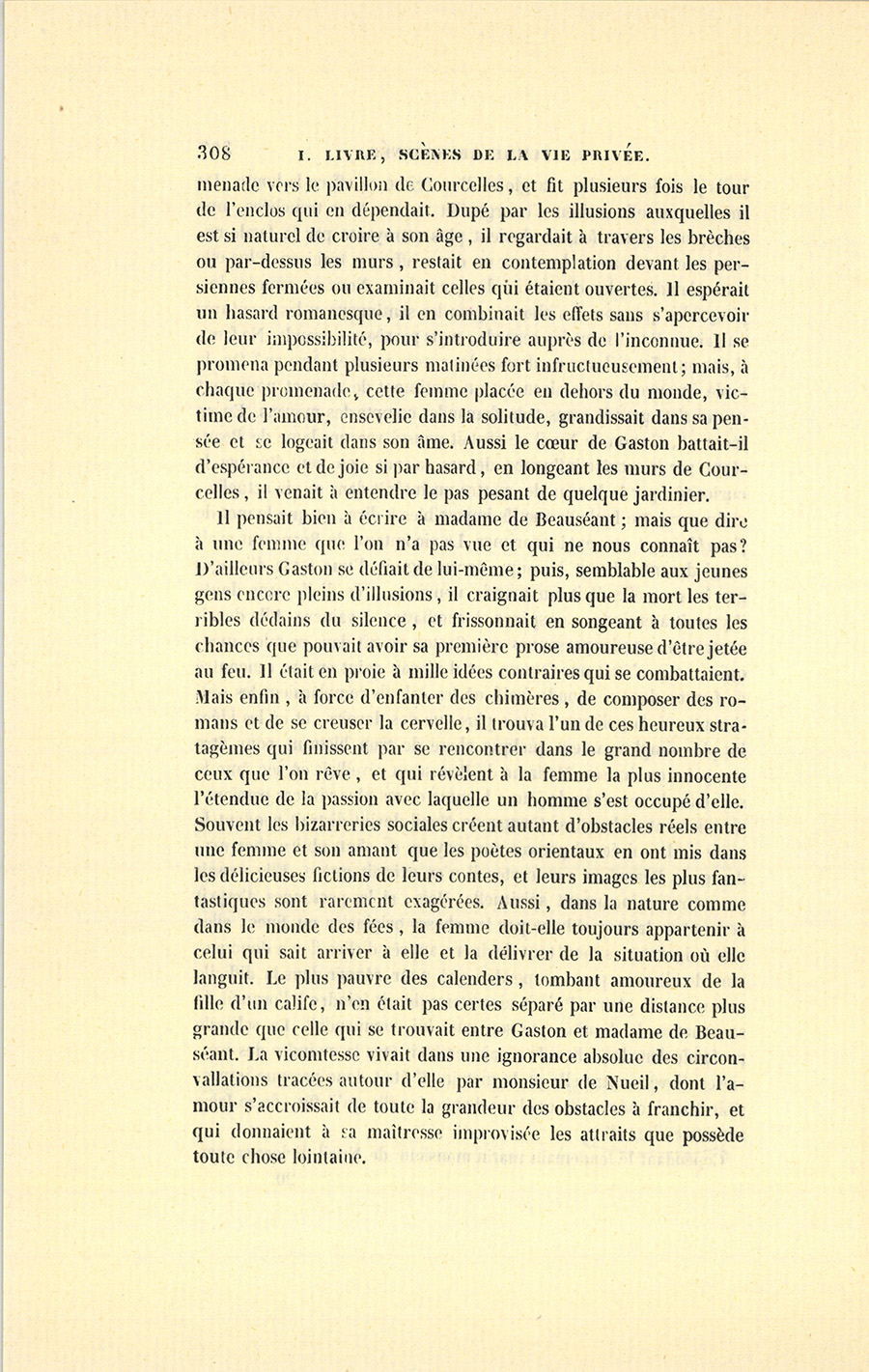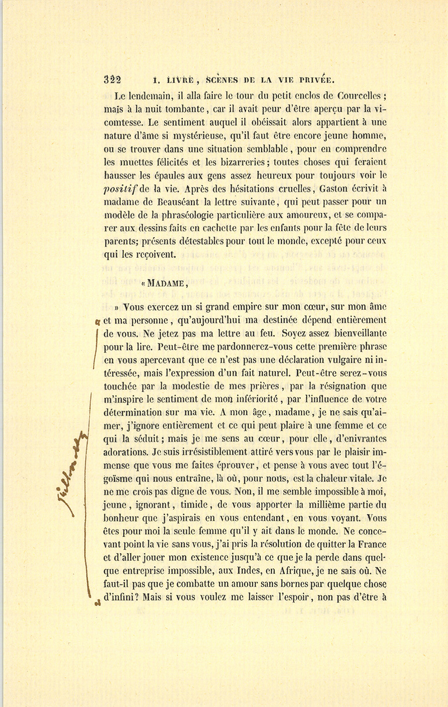 {p. 322} Le lendemain, il alla faire le tour du petit enclos de Courcelles ; mais à la nuit tombante, car il avait peur d’être aperçu par la vicomtesse. Le sentiment auquel il obéissait alors appartient à une nature d’âme si mystérieuse, qu’il faut être encore jeune homme, ou se trouver dans une situation semblable, pour en comprendre les muettes félicités et les bizarreries ; toutes choses qui feraient hausser les épaules aux gens assez heureux pour toujours voir le positif de la vie. Après des hésitations cruelles, Gaston écrivit à madame de Beauséant la lettre suivante, qui peut passer pour un modèle de la phraséologie particulière aux amoureux, et se comparer aux dessins faits en cachette par les enfants pour la fête de leurs parents ; présents détestables pour tout le monde, excepté pour ceux qui les reçoivent.