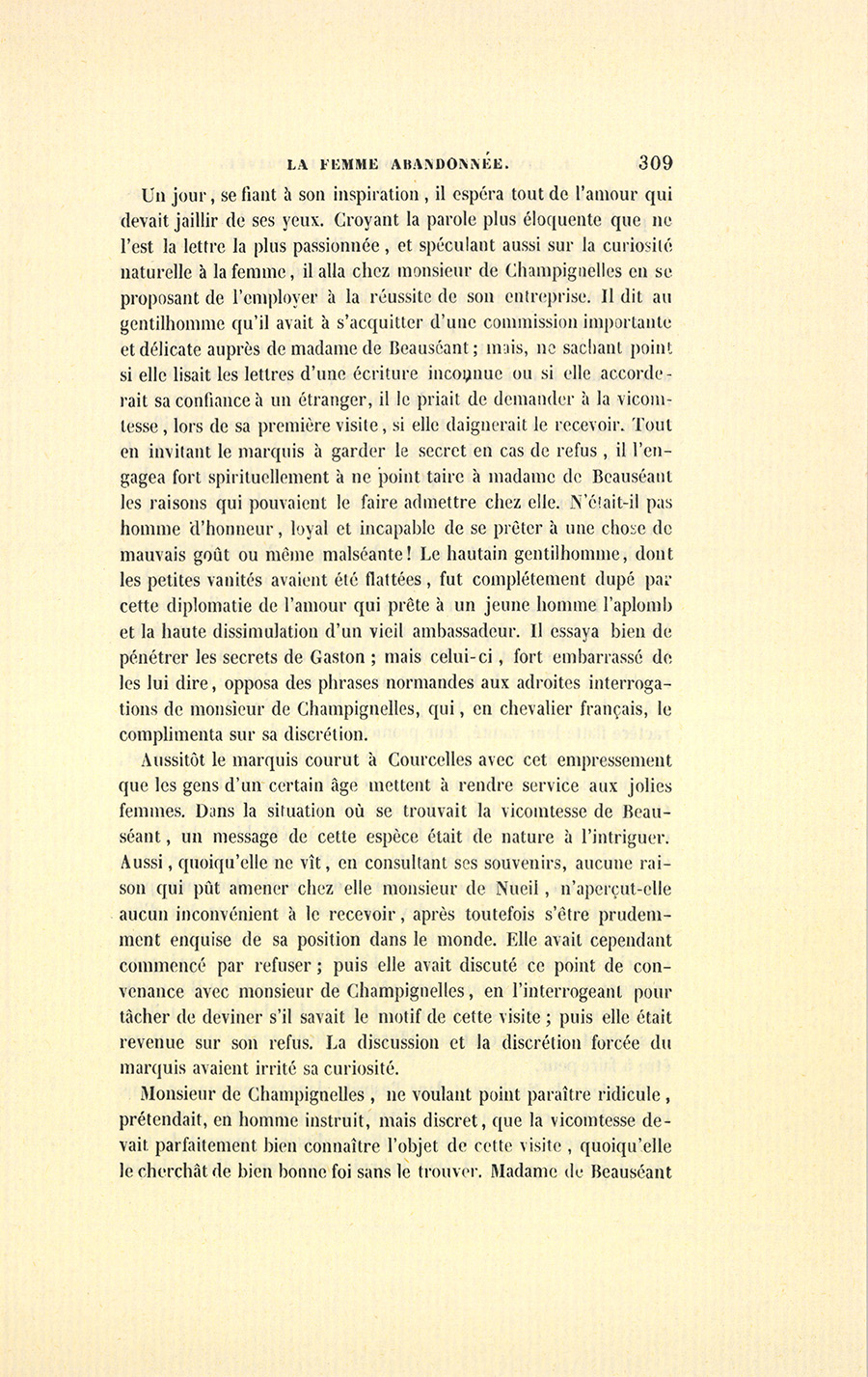 {p. 309} Un jour, se fiant à son inspiration, il espéra tout de l’amour qui devait jaillir de ses yeux. Croyant la parole plus éloquente que ne l’est la lettre la plus passionnée, et spéculant aussi sur la curiosité naturelle à la femme, il alla chez monsieur de Champignelles en se proposant de l’employer à la réussite de son entreprise. Il dit au gentilhomme qu’il avait à s’acquitter d’une commission importante et délicate auprès de madame de Beauséant ; mais, ne sachant point si elle lisait les lettres d’une écriture inconnue ou si elle accorderait sa confiance à un étranger, il le priait de demander à la vicomtesse, lors de sa première visite, si elle daignerait le recevoir. Tout en invitant le marquis à garder le secret en cas de refus, il l’engagea fort spirituellement à ne point taire à madame de Beauséant les raisons qui pouvaient le faire admettre chez elle. N’était-il pas homme d’honneur, loyal et incapable de se prêter à une chose de mauvais goût ou même malséante ! Le hautain gentilhomme, dont les petites vanités avaient été flattées, fut complétement dupé par cette diplomatie de l’amour qui prête à un jeune homme l’aplomb et la haute dissimulation d’un vieil ambassadeur. Il essaya bien de pénétrer les secrets de Gaston ; mais celui-ci, fort embarrassé de les lui dire, opposa des phrases normandes aux adroites interrogations de monsieur de Champignelles, qui, en chevalier français, le complimenta sur sa discrétion.