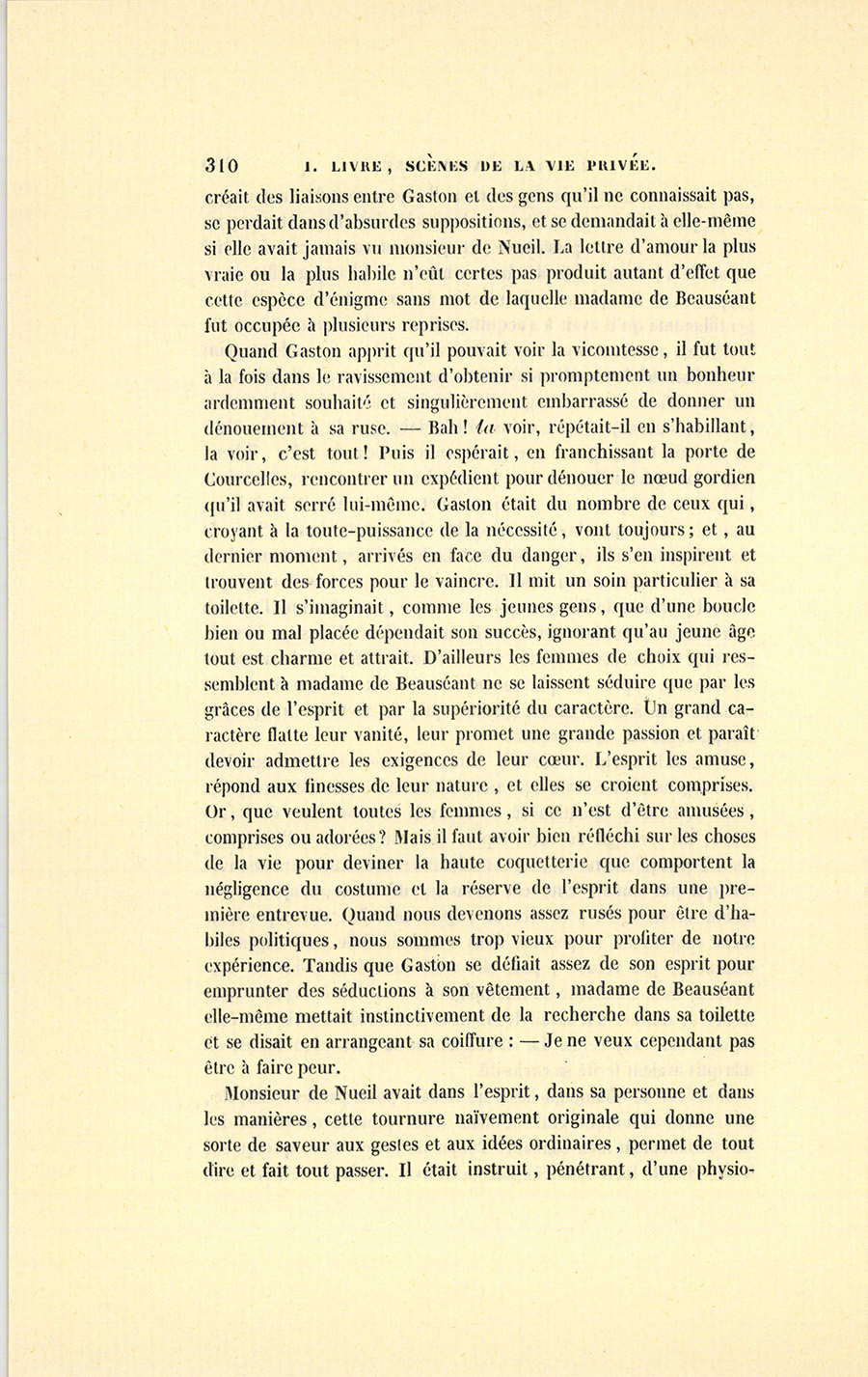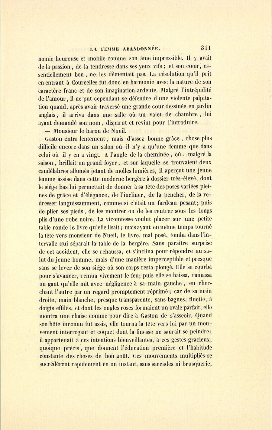 Monsieur de Nueil avait dans l’esprit, dans sa personne et dans les manières, cette tournure naïvement originale qui donne une sorte de saveur aux gestes et aux idées ordinaires, permet de tout dire et fait tout passer. Il était instruit, pénétrant, d’une {p. 311} physionomie heureuse et mobile comme son âme impressible. Il y avait de la passion, de la tendresse dans ses yeux vifs ; et son cœur, essentiellement bon, ne les démentait pas. La résolution qu’il prit en entrant à Courcelles fut donc en harmonie avec la nature de son caractère franc et de son imagination ardente. Malgré l’intrépidité de l’amour, il ne put cependant se défendre d’une violente palpitation quand, après avoir traversé une grande cour dessinée en jardin anglais, il arriva dans une salle où un valet de chambre, lui ayant demandé son nom, disparut et revint pour l’introduire.