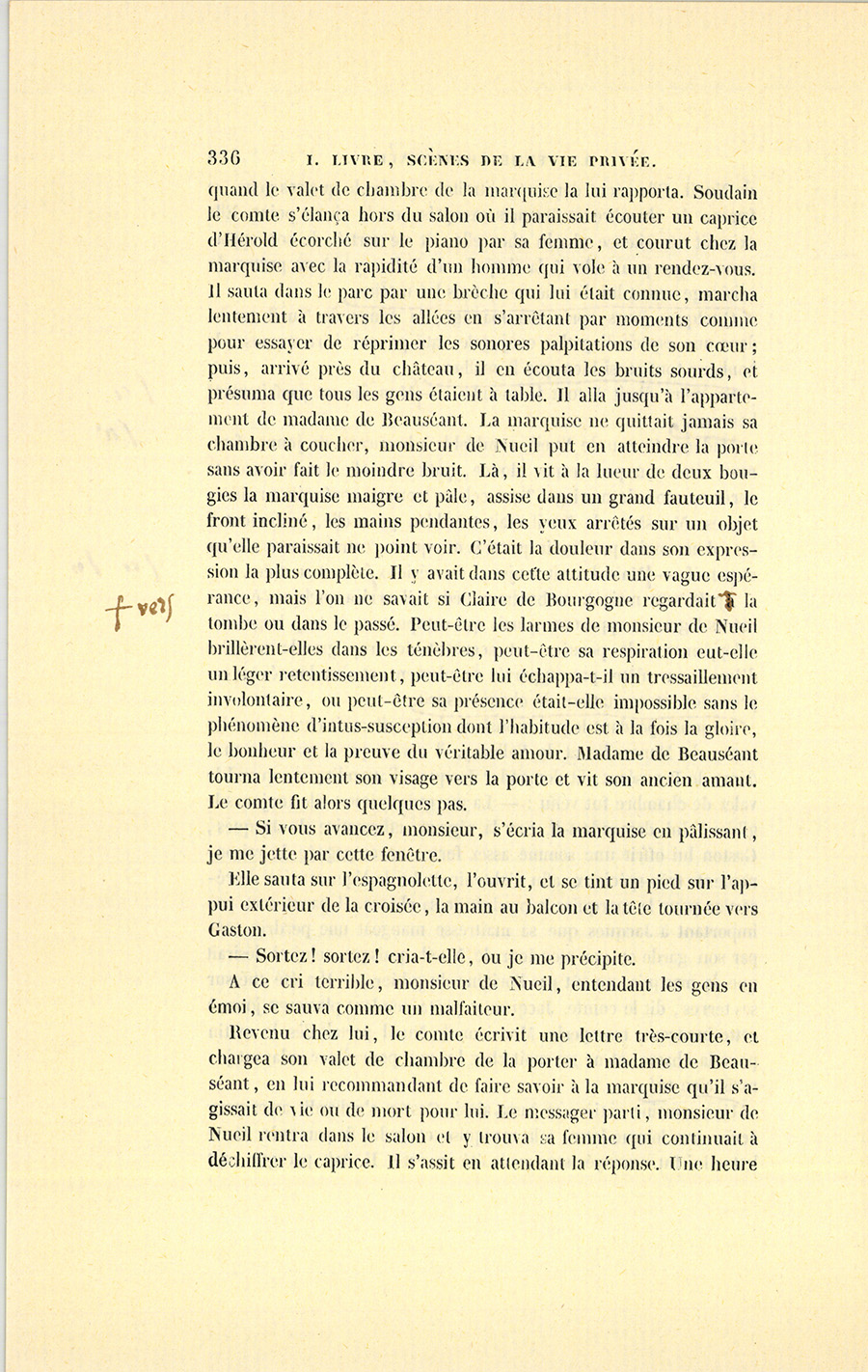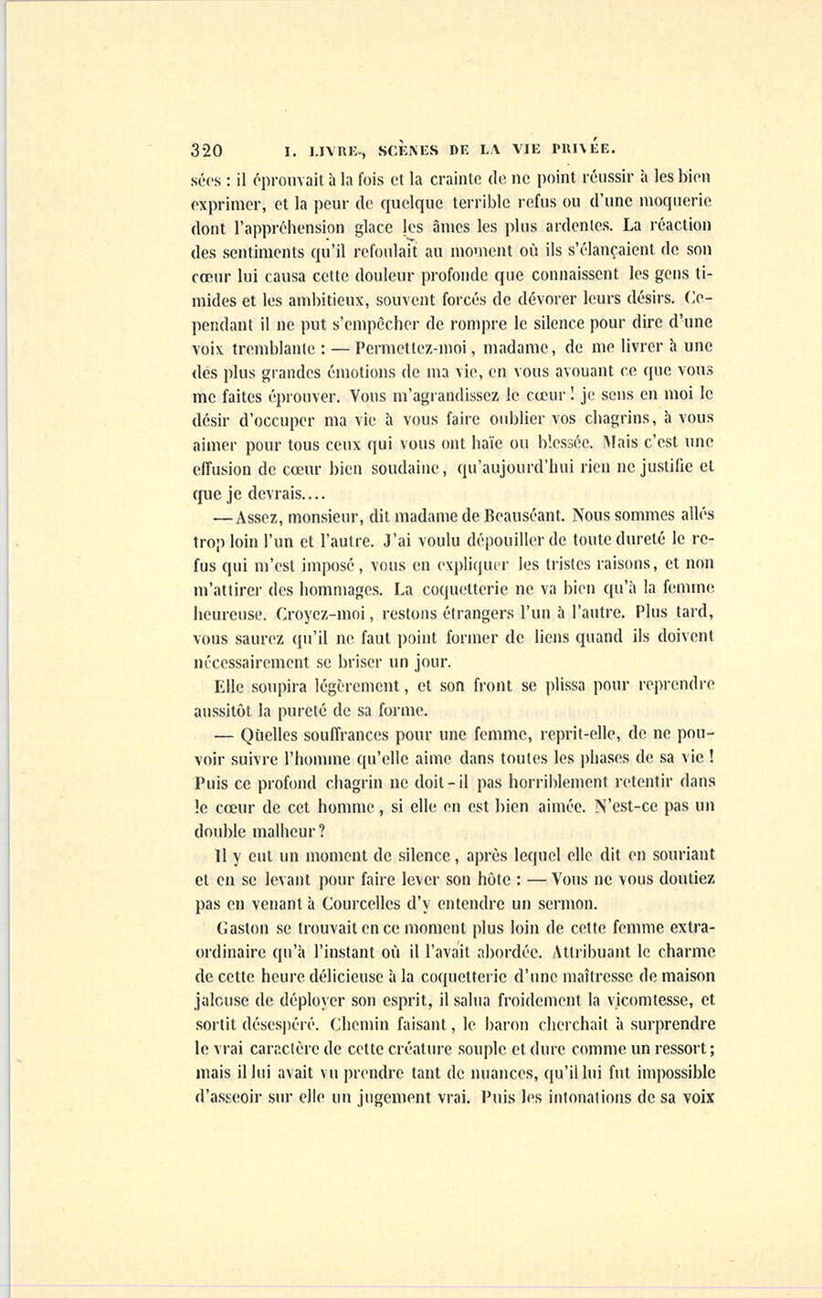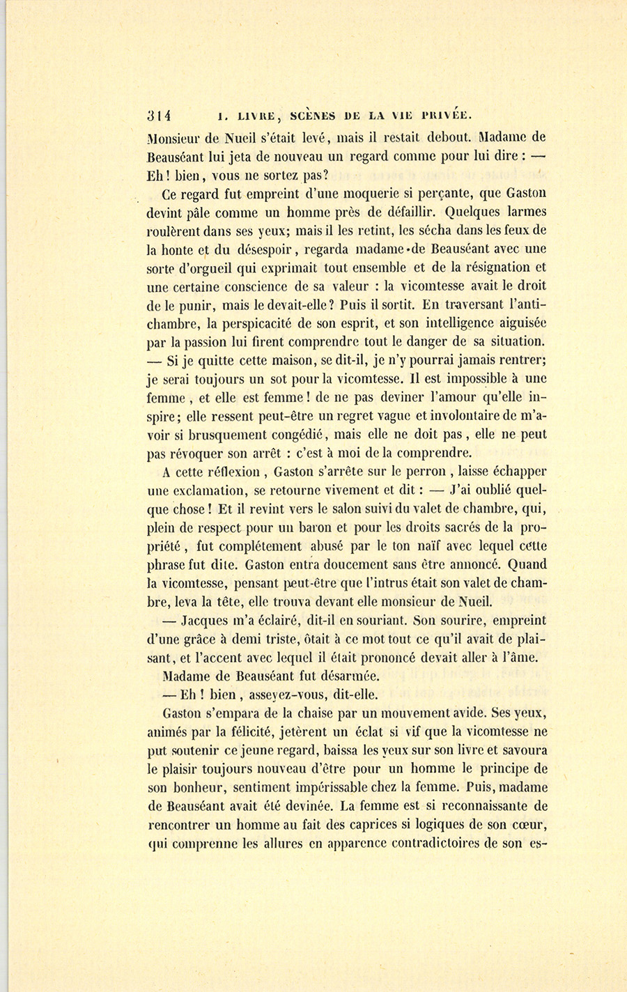 Elle se leva fière, salua Gaston, et se baissa pour ramasser le livre tombé. Ses mouvements furent aussi secs, aussi froids que ceux par lesquels elle l’accueillit avaient été mollement élégants et gracieux. {p. 314} Monsieur de Nueil s’était levé, mais il restait debout. Madame de Beauséant lui jeta de nouveau un regard comme pour lui dire : – Eh ! bien, vous ne sortez pas ?