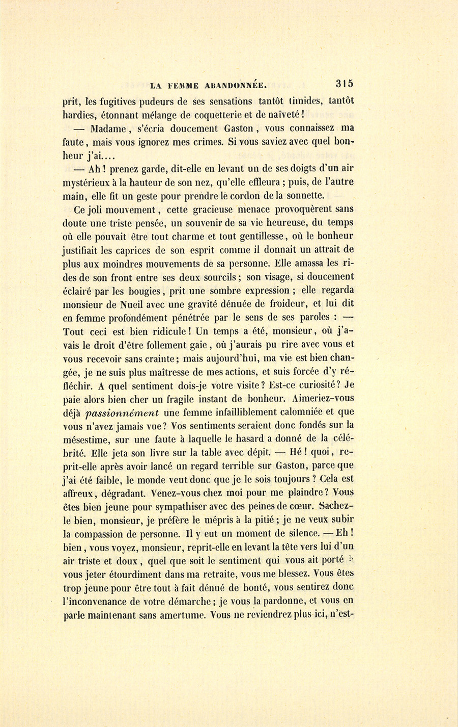 {p. 306} Toutes les dames parurent se consulter en se jetant le même coup d’œil ; et alors, le silence le plus profond ayant tout à coup régné dans le salon, leur attitude fut prise comme un indice d’improbation.
