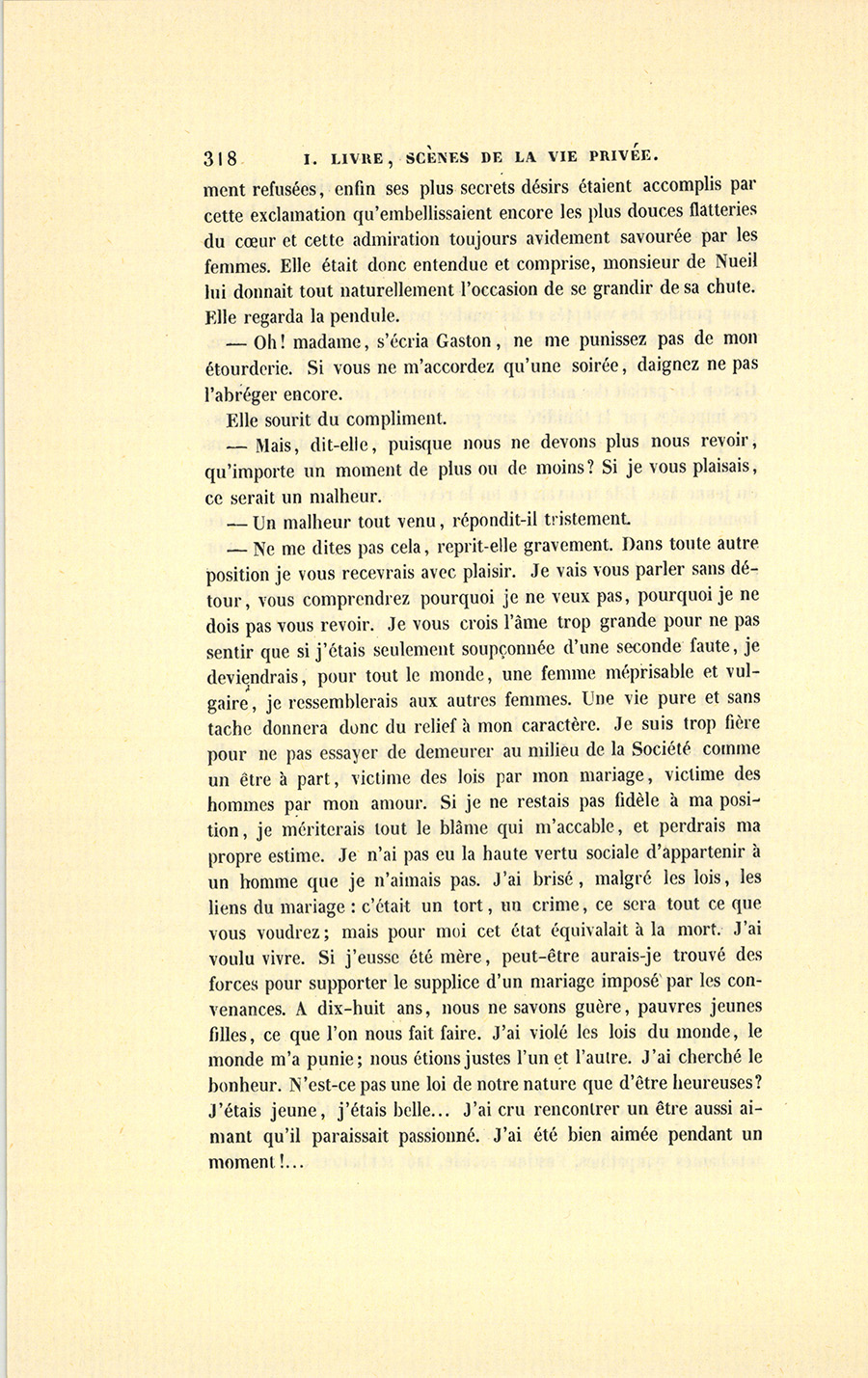La vicomtesse resta muette. Gaston rougit, il pensait l’avoir offensée. Mais cette femme était surprise par le premier plaisir profond et vrai qu’elle ressentait depuis le jour de son malheur. Le roué le plus habile n’eût pas fait à force d’art le progrès que monsieur de Nueil dut à ce cri parti du cœur. Ce jugement arraché à la candeur d’un homme jeune la rendait innocente à ses yeux, condamnait le monde, accusait celui qui l’avait quittée, et justifiait la solitude où elle était venue languir. L’absolution mondaine, les touchantes sympathies, l’estime sociale, tant souhaitées, si {p. 318} cruellement refusées, enfin ses plus secrets désirs étaient accomplis par cette exclamation qu’embellissaient encore les plus douces flatteries du cœur et cette admiration toujours avidement savourée par les femmes. Elle était donc entendue et comprise, monsieur de Nueil lui donnait tout naturellement l’occasion de se grandir de sa chute. Elle regarda la pendule.