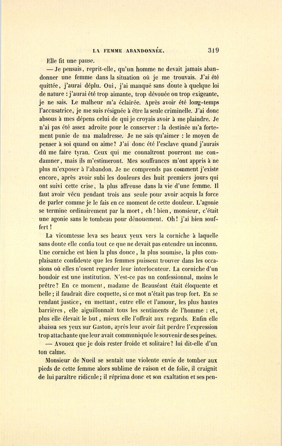 La vicomtesse leva ses beaux yeux vers la corniche à laquelle sans doute elle confia tout ce que ne devait pas entendre un inconnu. Une corniche est bien la plus douce, la plus soumise, la plus complaisante confidente que les femmes puissent trouver dans les occasions où elles n’osent regarder leur interlocuteur. La corniche d’un boudoir est une institution. N’est-ce pas un confessionnal, moins le prêtre ? En ce moment, madame de Beauséant était éloquente et belle ; il faudrait dire coquette, si ce mot n’était pas trop fort. En se rendant justice, en mettant, entre elle et l’amour, les plus hautes barrières, elle aiguillonnait tous les sentiments de l’homme : et, plus elle élevait le but, mieux elle l’offrait aux regards. Enfin elle abaissa ses yeux sur Gaston, après leur avoir fait perdre l’expression trop attachante que leur avait communiquée le souvenir de ses peines.