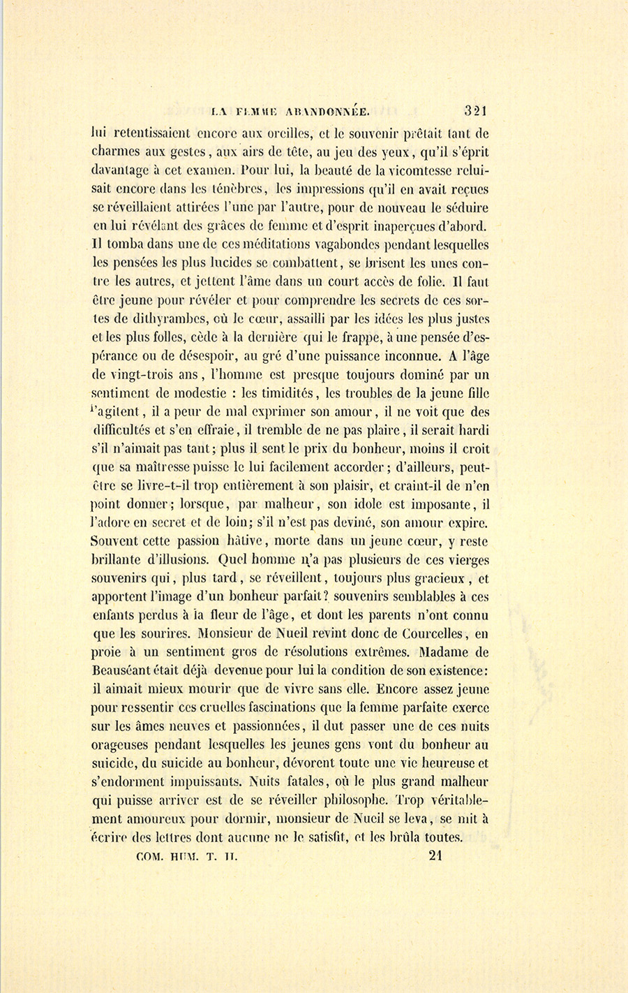 Gaston se trouvait en ce moment plus loin de cette femme extraordinaire qu’à l’instant où il l’avait abordée. Attribuant le charme de cette heure délicieuse à la coquetterie d’une maîtresse de maison jalouse de déployer son esprit, il salua froidement la vicomtesse, et sortit désespéré. Chemin faisant, le baron cherchait à surprendre le vrai caractère de cette créature souple et dure comme un ressort ; mais il lui avait vu prendre tant de nuances, qu’il lui fut impossible d’asseoir sur elle un jugement vrai. Puis les intonations de sa voix {p. 321} lui retentissaient encore aux oreilles, et le souvenir prêtait tant de charmes aux gestes, aux airs de tête, au jeu des yeux, qu’il s’éprit davantage à cet examen. Pour lui, la beauté de la vicomtesse reluisait encore dans les ténèbres, les impressions qu’il en avait reçues se réveillaient attirées l’une par l’autre, pour de nouveau le séduire en lui révélant des grâces de femme et d’esprit inaperçues d’abord. Il tomba dans une de ces méditations vagabondes pendant lesquelles les pensées les plus lucides se combattent, se brisent les unes contre les autres, et jettent l’âme dans un court accès de folie. Il faut être jeune pour révéler et pour comprendre les secrets de ces sortes de dithyrambes, où le cœur, assailli par les idées les plus justes et les plus folles, cède à la dernière qui le frappe, à une pensée d’espérance ou de désespoir, au gré d’une puissance inconnue. À l’âge de vingt-trois ans, l’homme est presque toujours dominé par un sentiment de modestie : les timidités, les troubles de la jeune fille l’agitent, il a peur de mal exprimer son amour, il ne voit que des difficultés et s’en effraie, il tremble de ne pas plaire, il serait hardi s’il n’aimait pas tant ; plus il sent le prix du bonheur, moins il croit que sa maîtresse puisse le lui facilement accorder ; d’ailleurs, peut-être se livre-t-il trop entièrement à son plaisir, et craint-il de n’en point donner ; lorsque, par malheur, son idole est imposante, il l’adore en secret et de loin ; s’il n’est pas deviné, son amour expire. Souvent cette passion hâtive, morte dans un jeune cœur, y reste brillante d’illusions. Quel homme n’a pas plusieurs de ces vierges souvenirs qui, plus tard, se réveillent, toujours plus gracieux, et apportent l’image d’un bonheur parfait ? souvenirs semblables à ces enfants perdus à la fleur de l’âge, et dont les parents n’ont connu que les sourires. Monsieur de Nueil revint donc de Courcelles, en proie à un sentiment gros de résolutions extrêmes. Madame de Beauséant était déjà devenue pour lui la condition de son existence : il aimait mieux mourir que de vivre sans elle. Encore assez jeune pour ressentir ces cruelles fascinations que la femme parfaite exerce sur les âmes neuves et passionnées, il dut passer une de ces nuits orageuses pendant lesquelles les jeunes gens vont du bonheur au suicide, du suicide au bonheur, dévorent toute une vie heureuse et s’endorment impuissants. Nuits fatales, où le plus grand malheur qui puisse arriver est de se réveiller philosophe. Trop véritablement amoureux pour dormir, monsieur de Nueil se leva, se mit à écrire des lettres dont aucune ne le satisfit, et les brûla toutes.