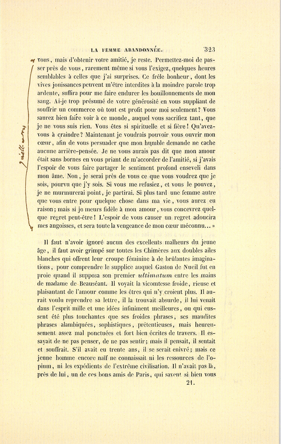 Être si bien obéie dans ses vœux secrets ! Où est la femme qui n’eût pas cédé à un tel bonheur ? Une Italienne, une de ces divines créatures dont l’âme est à l’antipode de celle des Parisiennes, et que de ce côté des Alpes l’on trouverait profondément immorale, disait en lisant les romans français : « Je ne vois pas pourquoi ces pauvres amoureux passent autant de temps à arranger ce qui doit être l’affaire d’une matinée. » Pourquoi le narrateur ne pourrait-il pas, à l’exemple de cette bonne Italienne, ne pas trop faire languir ses auditeurs ni son sujet ? Il y aurait bien quelques scènes de coquetterie charmantes à dessiner, doux retards que madame de Beauséant voulait apporter au bonheur de Gaston pour tomber avec grâce {p. 327} comme les vierges de l’antiquité ; peut-être aussi pour jouir des voluptés chastes d’un premier amour, et le faire arriver à sa plus haute expression de force et de puissance. Monsieur de Nueil était encore dans l’âge où un homme est la dupe de ces caprices, de ces jeux qui affriandent tant les femmes, et qu’elles prolongent, soit pour bien stipuler leurs conditions, soit pour jouir plus long-temps de leur pouvoir dont la prochaine diminution est instinctivement devinée par elles. Mais ces petits protocoles de boudoir, moins nombreux que ceux de la conférence de Londres, tiennent trop peu de place dans l’histoire d’une passion vraie pour être mentionnés.