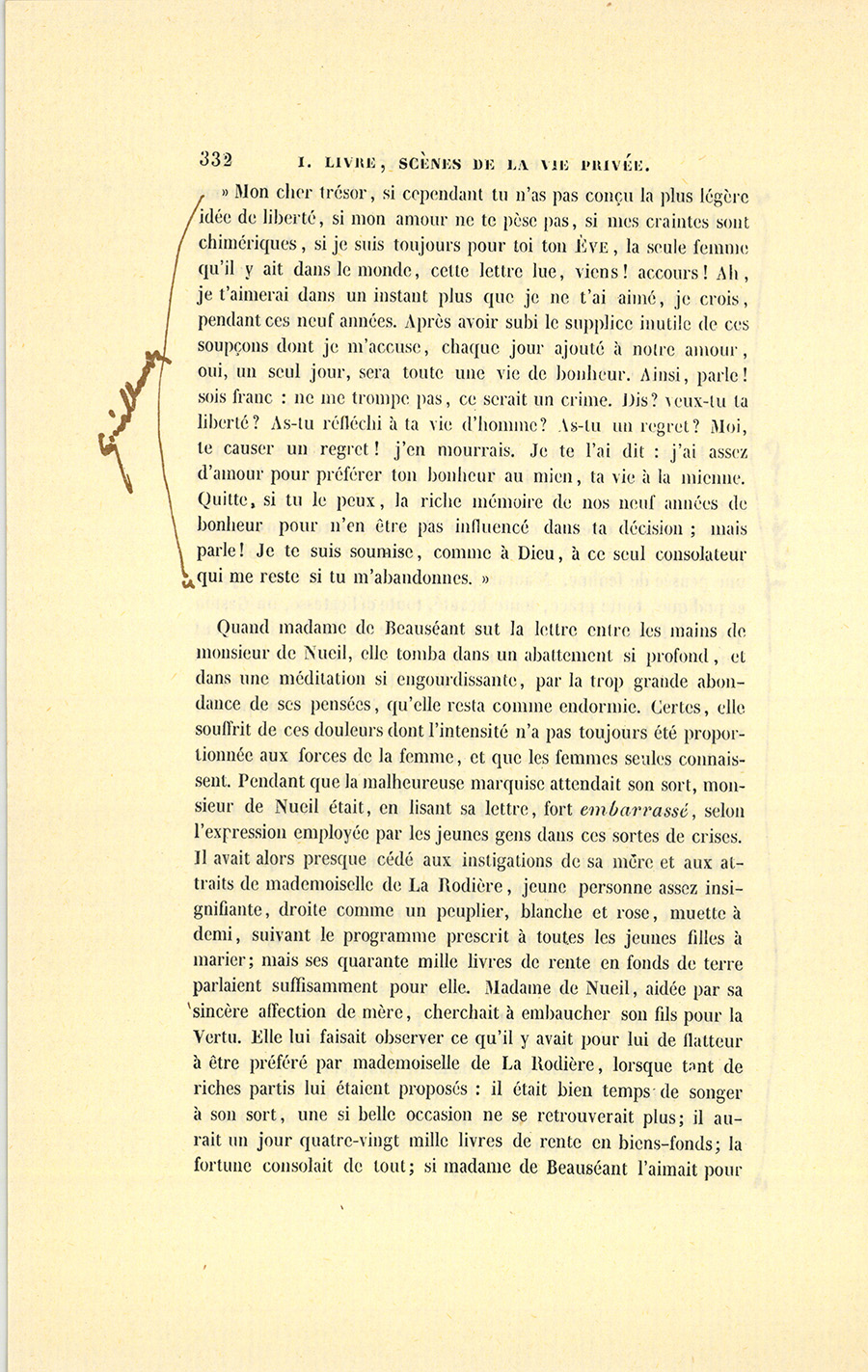 Madame la comtesse de Nueil, mère de Gaston, n’avait jamais voulu voir madame de Beauséant. C’était une personne roide et vertueuse, qui avait très-légalement accompli le bonheur de monsieur de Nueil le père. Madame de Beauséant comprit que cette honorable douairière devait être son ennemie, et tenterait d’arracher Gaston à sa vie immorale et anti-religieuse. La marquise aurait bien voulu vendre sa terre, et retourner à Genève. Mais c’eût été se défier de monsieur de Nueil, elle en était incapable. D’ailleurs, il avait précisément pris beaucoup de goût pour la terre de Valleroy, où il faisait force plantations, force mouvements de terrains. N’était-ce pas l’arracher à une espèce de bonheur mécanique que les femmes souhaitent toujours à leurs maris et même à leurs amants ? Il était arrivé dans le pays une demoiselle de La Rodière, âgée de vingt-deux ans, et riche de quarante mille livres de rentes. Gaston rencontrait cette héritière à Manerville toutes les fois que son devoir l’y conduisait. Ces personnages étant ainsi placés comme les chiffres d’une proportion arithmétique, la lettre suivante, écrite et remise {p. 329} un matin à Gaston, expliquera maintenant l’affreux problème que, depuis un mois, madame de Beauséant tâchait de résoudre.