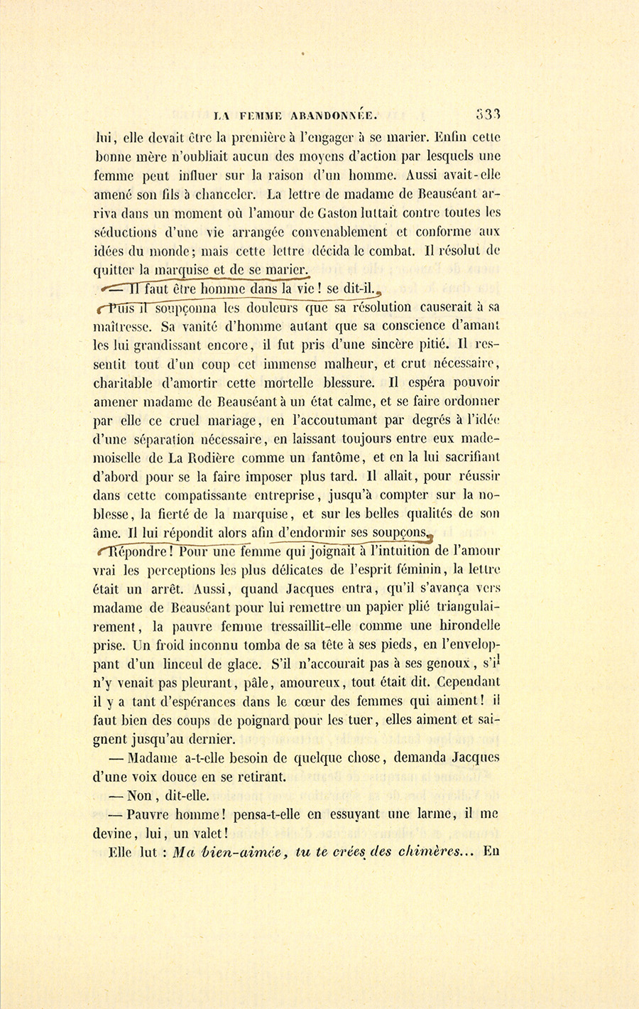 Quand madame de Beauséant sut la lettre entre les mains de monsieur de Nueil, elle tomba dans un abattement si profond, et dans une méditation si engourdissante, par la trop grande abondance de ses pensées, qu’elle resta comme endormie. Certes, elle souffrit de ces douleurs dont l’intensité n’a pas toujours été proportionnée aux forces de la femme, et que les femmes seules connaissent. Pendant que la malheureuse marquise attendait son sort, monsieur de Nueil était, en lisant sa lettre, fort embarrassé, selon l’expression employée par les jeunes gens dans ces sortes de crises. Il avait alors presque cédé aux instigations de sa mère et aux attraits de mademoiselle de La Rodière, jeune personne assez insignifiante, droite comme un peuplier, blanche et rose, muette à demi, suivant le programme prescrit à toutes les jeunes filles à marier ; mais ses quarante mille livres de rente en fonds de terre parlaient suffisamment pour elle. Madame de Nueil, aidée par sa sincère affection de mère, cherchait à embaucher son fils pour la Vertu. Elle lui faisait observer ce qu’il y avait pour lui de flatteur à être préféré par mademoiselle de La Rodière, lorsque tant de riches partis lui étaient proposés : il était bien temps de songer à son sort, une si belle occasion ne se retrouverait plus ; il aurait un jour quatre-vingt mille livres de rente en biens-fonds ; la fortune consolait de tout ; si madame de Beauséant l’aimait pour {p. 333} lui, elle devait être la première à l’engager à se marier. Enfin cette bonne mère n’oubliait aucun des moyens d’action par lesquels une femme peut influer sur la raison d’un homme. Aussi avait-elle amené son fils à chanceler. La lettre de madame de Beauséant arriva dans un moment où l’amour de Gaston luttait contre toutes les séductions d’une vie arrangée convenablement et conforme aux idées du monde ; mais cette lettre décida le combat. Il résolut de quitter la marquise et de se marier. – Il faut être homme dans la vie ! se dit-il. Puis il soupçonna les douleurs que sa résolution causerait à sa maîtresse. Sa vanité d’homme autant que sa conscience d’amant les lui grandissant encore, il fut pris d’une sincère pitié. Il ressentit tout d’un coup cet immense malheur, et crut nécessaire, charitable d’amortir cette mortelle blessure. Il espéra pouvoir amener madame de Beauséant à un état calme, et se faire ordonner par elle ce cruel mariage, en l’accoutumant par degrés à l’idée d’une séparation nécessaire, en laissant toujours entre eux mademoiselle de La Rodière comme un fantôme, et en la lui sacrifiant d’abord pour se la faire imposer plus tard. Il allait, pour réussir dans cette compatissante entreprise, jusqu’à compter sur la noblesse, la fierté de la marquise, et sur les belles qualités de son âme. Il lui répondit alors afin d’endormir ses soupçons. Répondre ! Pour une femme qui joignait à l’intuition de l’amour vrai les perceptions les plus délicates de l’esprit féminin, la lettre était un arrêt. Aussi, quand Jacques entra, qu’il s’avança vers madame de Beauséant pour lui remettre un papier plié triangulairement, la pauvre femme tressaillit-elle comme une hirondelle prise. Un froid inconnu tomba de sa tête à ses pieds, en l’enveloppant d’un linceul de glace. S’il n’accourait pas à ses genoux, s’il n’y venait pas pleurant, pâle, amoureux, tout était dit. Cependant il y a tant d’espérances dans le cœur des femmes qui aiment ! il faut bien des coups de poignard pour les tuer, elles aiment et saignent jusqu’au dernier.