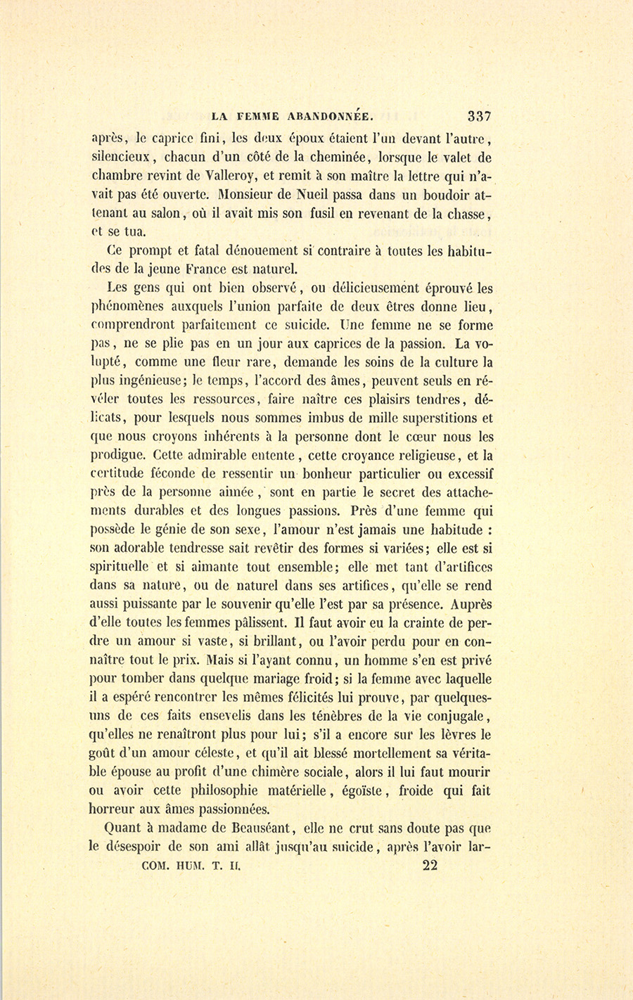 Revenu chez lui, le comte écrivit une lettre très-courte, et chargea son valet de chambre de la porter à madame de Beauséant, en lui recommandant de faire savoir à la marquise qu’il s’agissait de vie ou de mort pour lui. Le messager parti, monsieur de Nueil rentra dans le salon et y trouva sa femme qui continuait à déchiffrer le caprice. Il s’assit en attendant la réponse. Une heure {p. 337} après, le caprice fini, les deux époux étaient l’un devant l’autre, silencieux, chacun d’un côté de la cheminée, lorsque le valet de chambre revint de Valleroy, et remit à son maître la lettre qui n’avait pas été ouverte. Monsieur de Nueil passa dans un boudoir attenant au salon, où il avait mis son fusil en revenant de la chasse, et se tua.