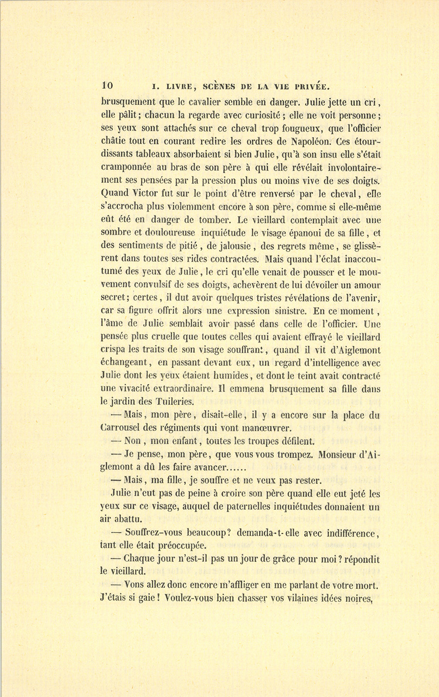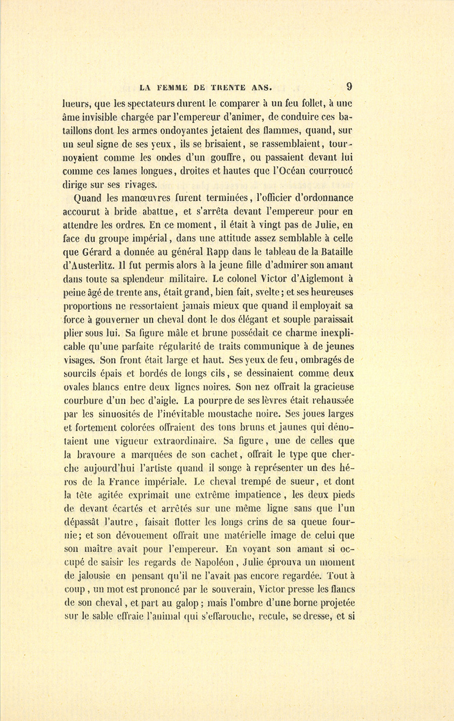 Quand les manœuvres furent terminées, l’officier d’ordonnance accourut à bride abattue, et s’arrêta devant l’empereur pour en attendre les ordres. En ce moment, il était à vingt pas de Julie, en face du groupe impérial, dans une attitude assez semblable à celle que Gérard a donnée au général Rapp dans le tableau de la Bataille d’Austerlitz. Il fut permis alors à la jeune fille d’admirer son amant dans toute sa splendeur militaire. Le colonel Victor d’Aiglemont à peine âgé de trente ans, était grand, bien fait, svelte ; et ses heureuses proportions ne ressortaient jamais mieux que quand il employait sa force à gouverner un cheval dont le dos élégant et souple paraissait plier sous lui. Sa figure mâle et brune possédait ce charme inexplicable qu’une parfaite régularité de traits communique à de jeunes visages. Son front était large et haut. Ses yeux de feu, ombragés de sourcils épais et bordés de longs cils, se dessinaient comme deux ovales blancs entre deux lignes noires. Son nez offrait la gracieuse courbure d’un bec d’aigle. La pourpre de ses lèvres était rehaussée par les sinuosités de l’inévitable moustache noire. Ses joues larges et fortement colorées offraient des tons bruns et jaunes qui dénotaient une vigueur extraordinaire. Sa figure, une de celles que la bravoure a marquées de son cachet, offrait le type que cherche aujourd’hui l’artiste quand il songe à représenter un des héros de la France impériale. Le cheval trempé de sueur, et dont la tête agitée exprimait une extrême impatience, les deux pieds de devant écartés et arrêtés sur une même ligne sans que l’un dépassât l’autre, faisait flotter les longs crins de sa queue fournie ; et son dévouement offrait une matérielle image de celui que son maître avait pour l’empereur. En voyant son amant si occupé de saisir les regards de Napoléon, Julie éprouva un moment de jalousie en pensant qu’il ne l’avait pas encore regardée. Tout à coup, un mot est prononcé par le souverain, Victor presse les flancs de son cheval, et part au galop ; mais l’ombre d’une borne projetée sur le sable effraie l’animal qui s’effarouche, recule, se dresse, et si {p. 10} brusquement que le cavalier semble en danger. Julie jette un cri, elle pâlit ; chacun la regarde avec curiosité ; elle ne voit personne ; ses yeux sont attachés sur ce cheval trop fougueux, que l’officier châtie tout en courant redire les ordres de Napoléon. Ces étourdissants tableaux absorbaient si bien Julie, qu’à son insu elle s’était cramponnée au bras de son père à qui elle révélait involontairement ses pensées par la pression plus ou moins vive de ses doigts. Quand Victor fut sur le point d’être renversé par le cheval, elle s’accrocha plus violemment encore à son père, comme si elle-même eût été en danger de tomber. Le vieillard contemplait avec une sombre et douloureuse inquiétude le visage épanoui de sa fille, et des sentiments de pitié, de jalousie, des regrets même, se glissèrent dans toutes ses rides contractées. Mais quand l’éclat inaccoutumé des yeux de Julie, le cri qu’elle venait de pousser et le mouvement convulsif de ses doigts, achevèrent de lui dévoiler un amour secret ; certes, il dut avoir quelques tristes révélations de l’avenir, car sa figure offrit alors une expression sinistre. En ce moment, l’âme de Julie semblait avoir passé dans celle de l’officier. Une pensée plus cruelle que toutes celles qui avaient effrayé le vieillard crispa les traits de son visage souffrant, quand il vit d’Aiglemont échangeant, en passant devant eux, un regard d’intelligence avec Julie dont les yeux étaient humides, et dont le teint avait contracté une vivacité extraordinaire. Il emmena brusquement sa fille dans le jardin des Tuileries.