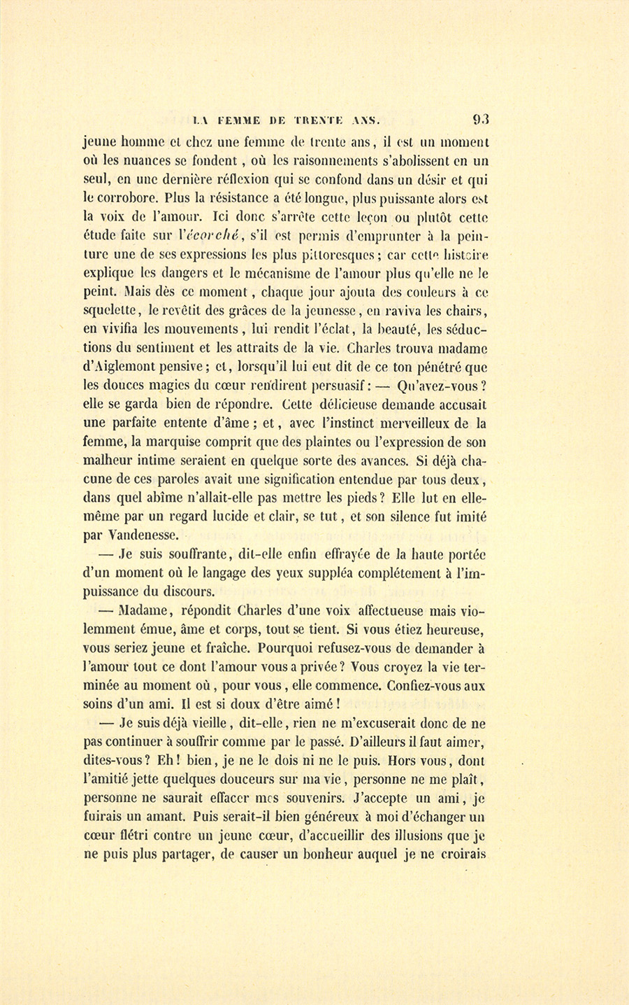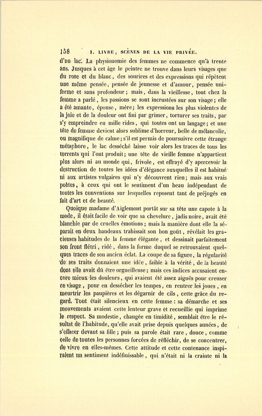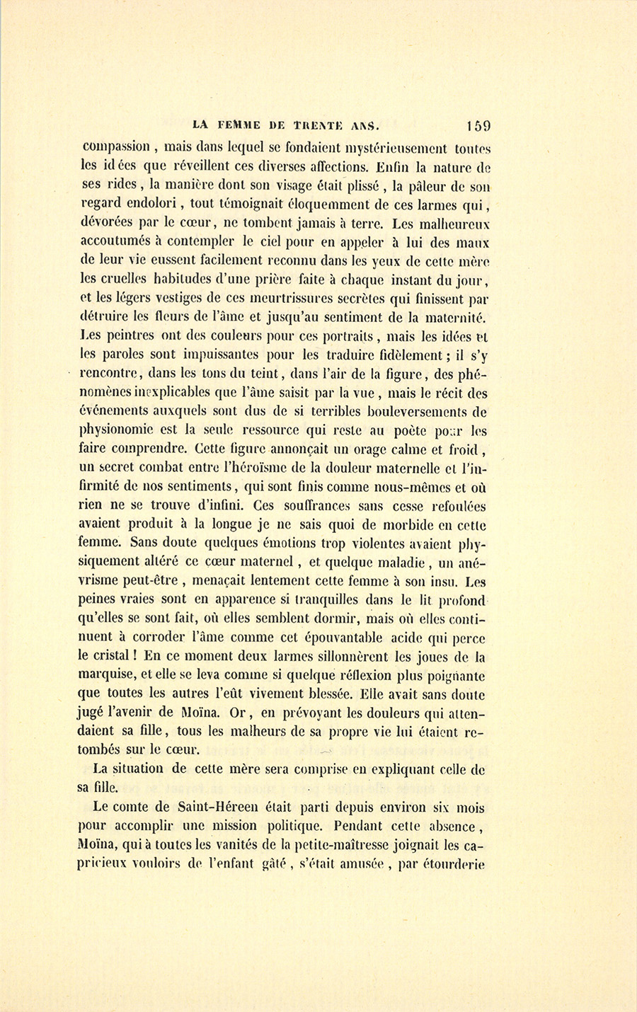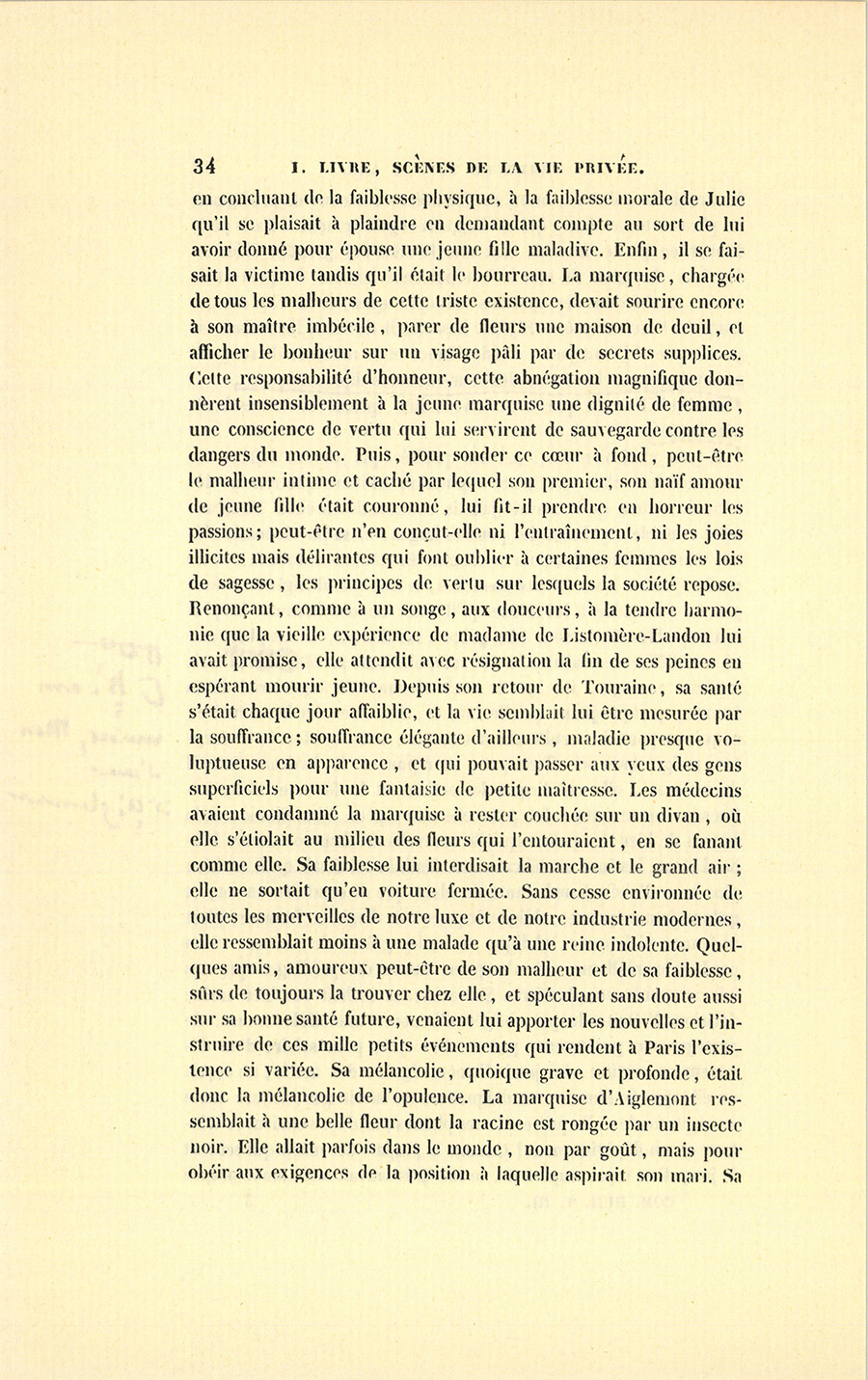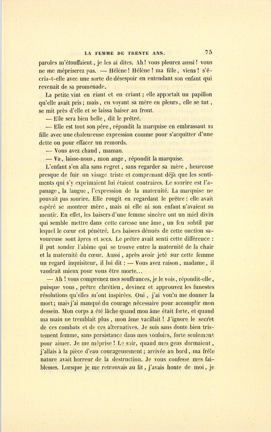 Ces religieuses pensées, si naturelles au cœur des vieillards, flottaient éparses dans l’âme de madame d’Aiglemont ; elles y étaient à {p. 157} demi lumineuses, tantôt abîmées, tantôt déployées complétement, comme des fleurs tourmentées à la surface des eaux pendant une tempête. Elle s’était assise, lassée, affaiblie par une longue méditation, par une de ces rêveries au milieu desquelles toute la vie se dresse, se déroule aux yeux de ceux qui pressentent la mort.