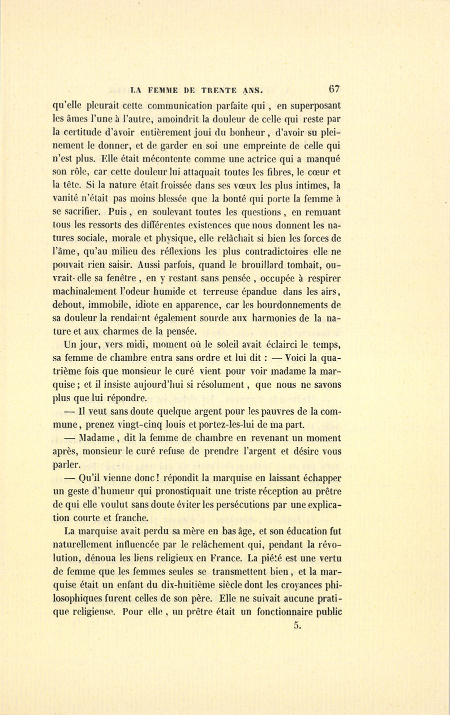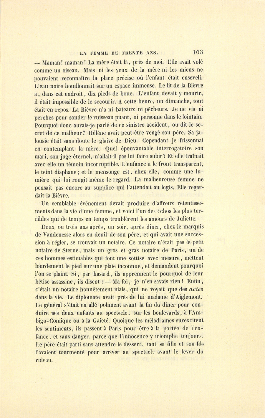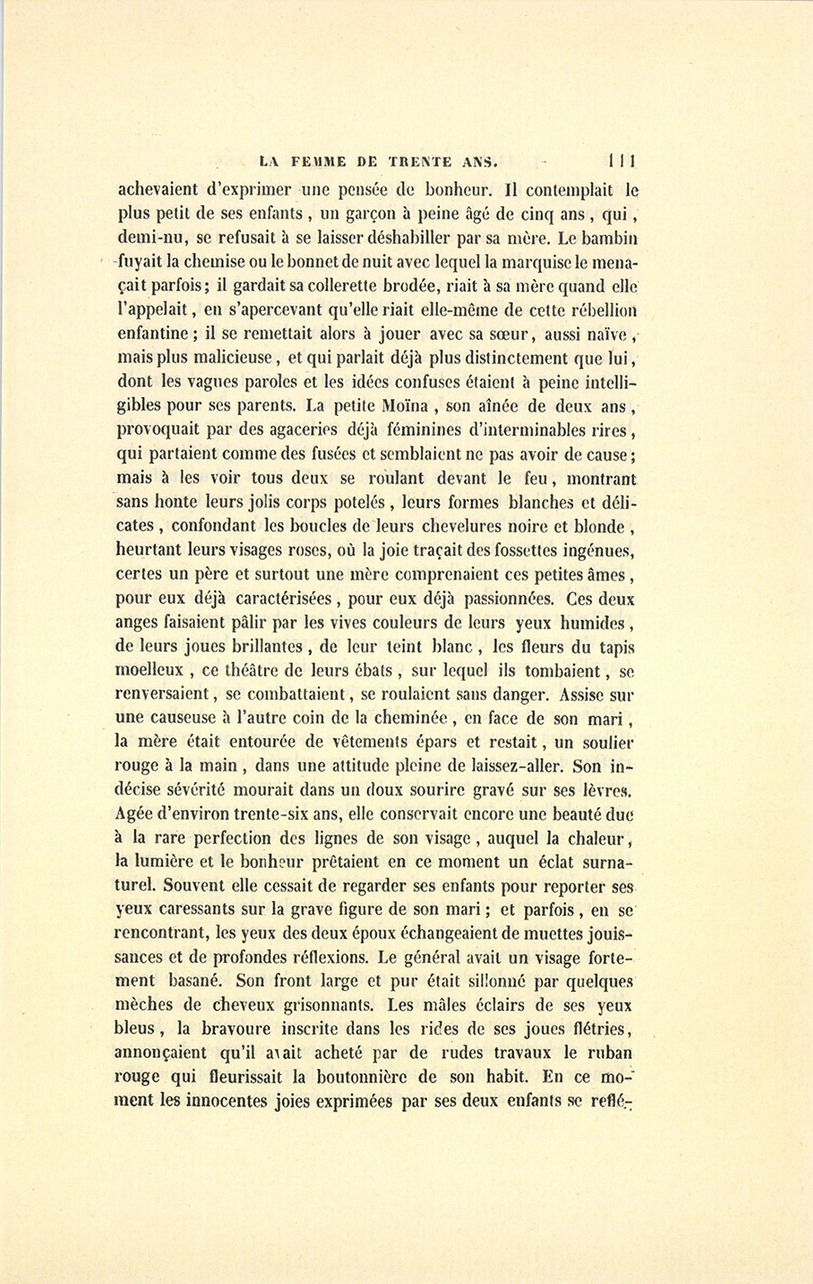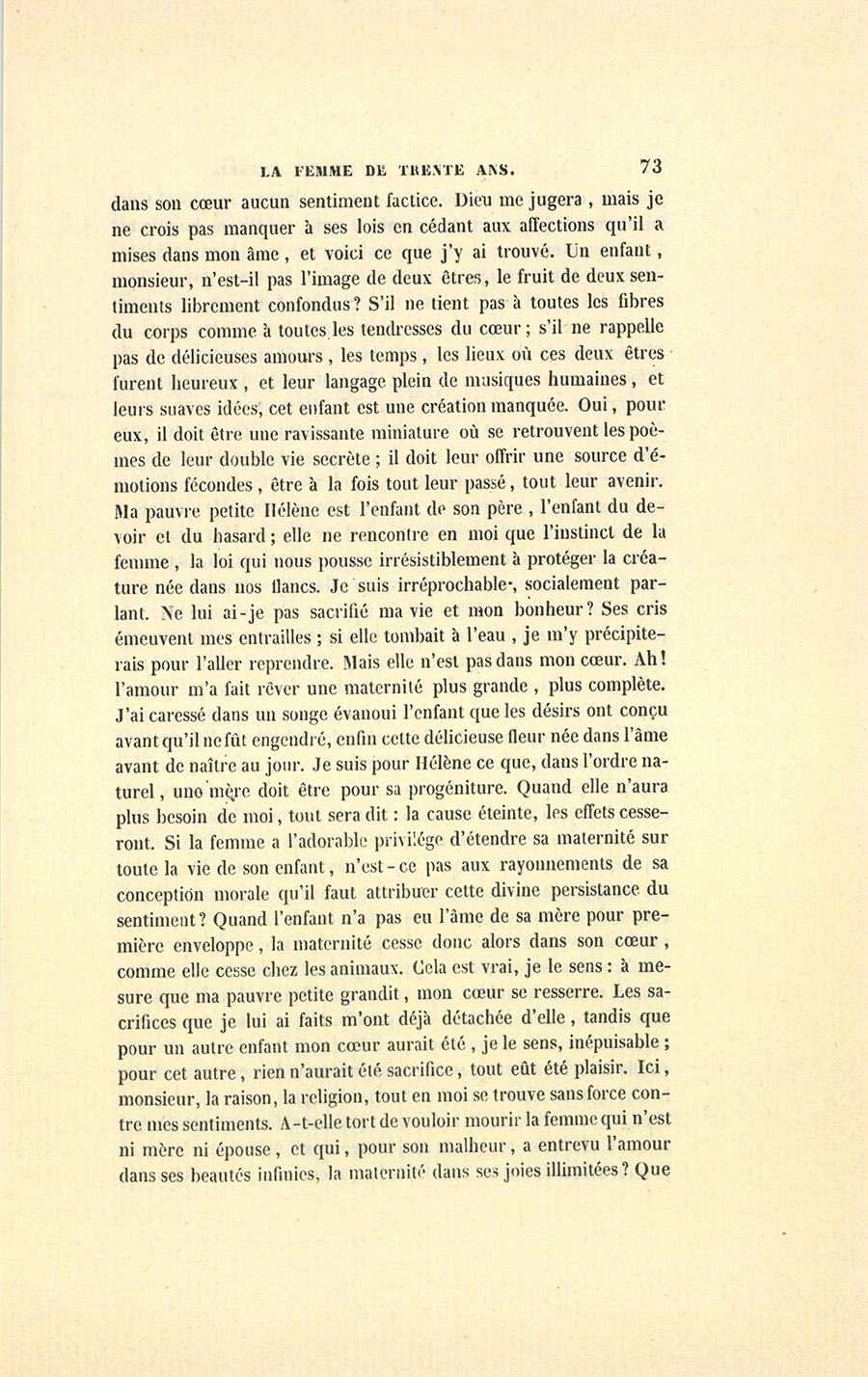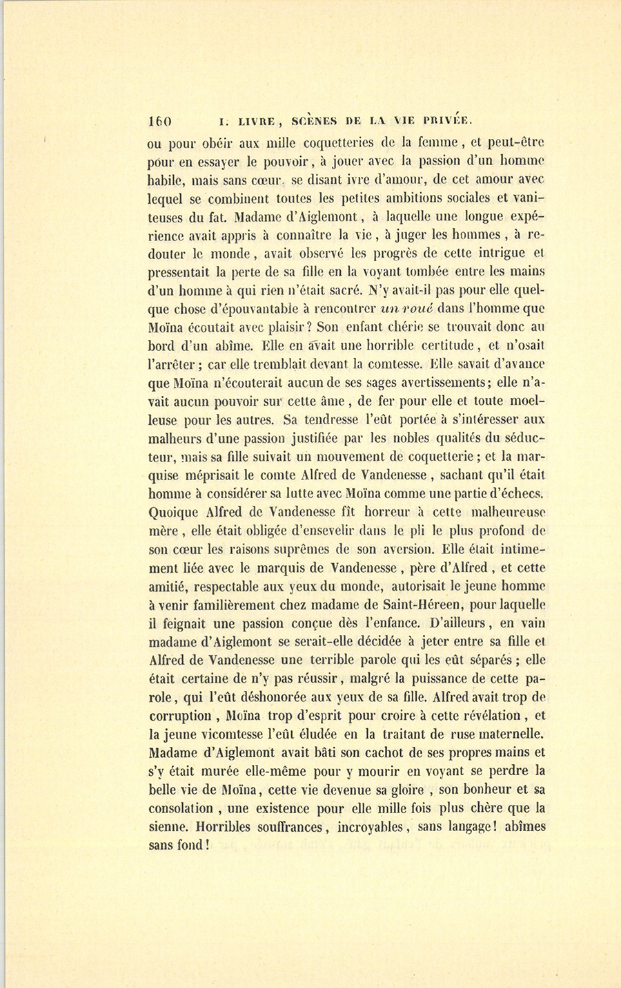 Ces religieuses pensées, si naturelles au cœur des vieillards, flottaient éparses dans l’âme de madame d’Aiglemont ; elles y étaient à {p. 157} demi lumineuses, tantôt abîmées, tantôt déployées complétement, comme des fleurs tourmentées à la surface des eaux pendant une tempête. Elle s’était assise, lassée, affaiblie par une longue méditation, par une de ces rêveries au milieu desquelles toute la vie se dresse, se déroule aux yeux de ceux qui pressentent la mort.