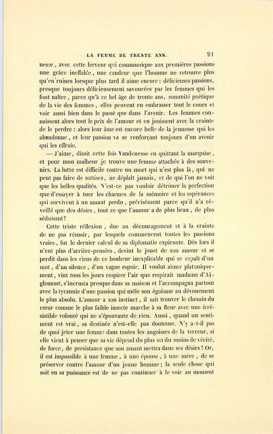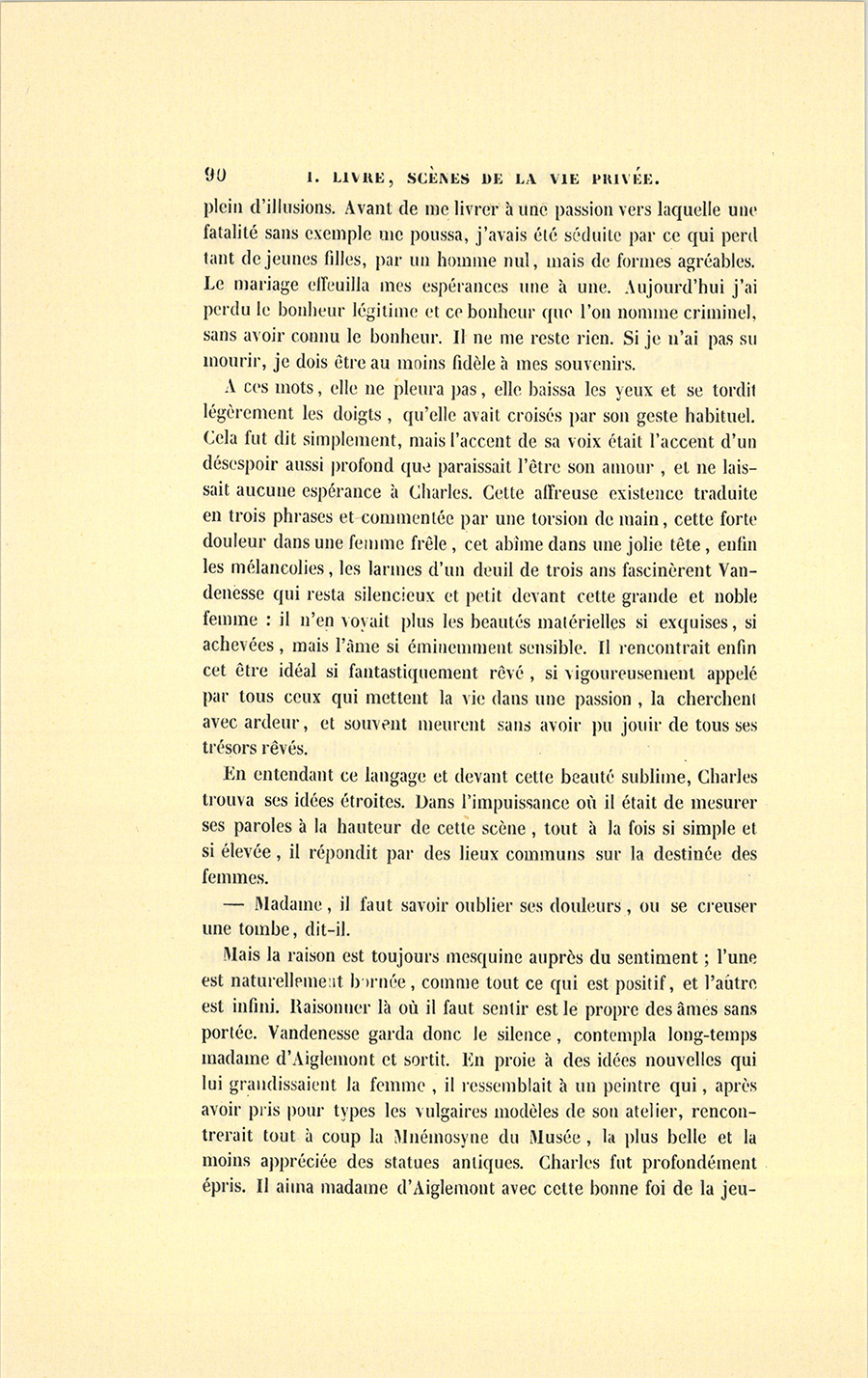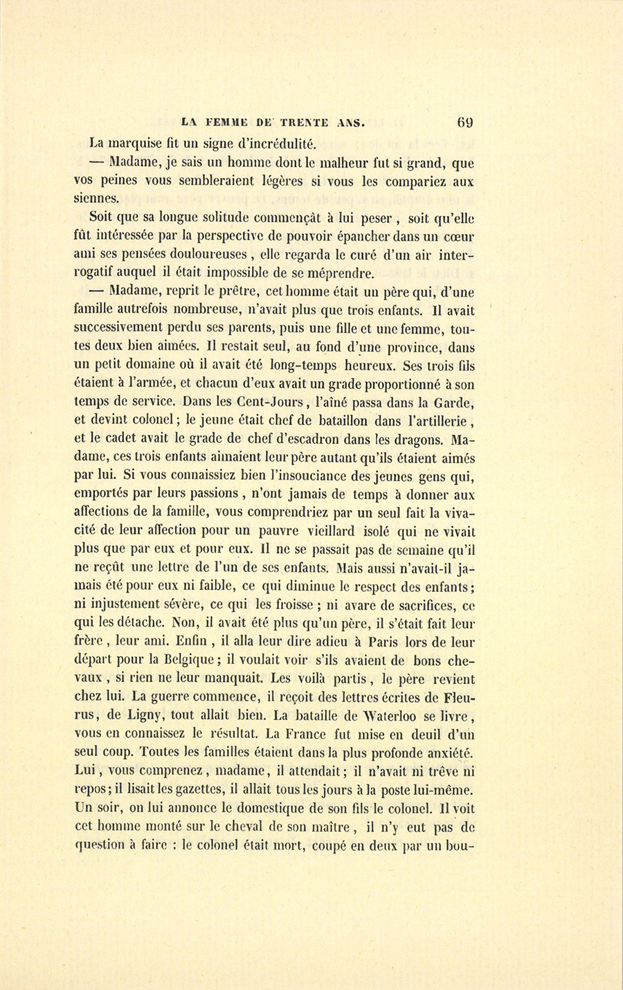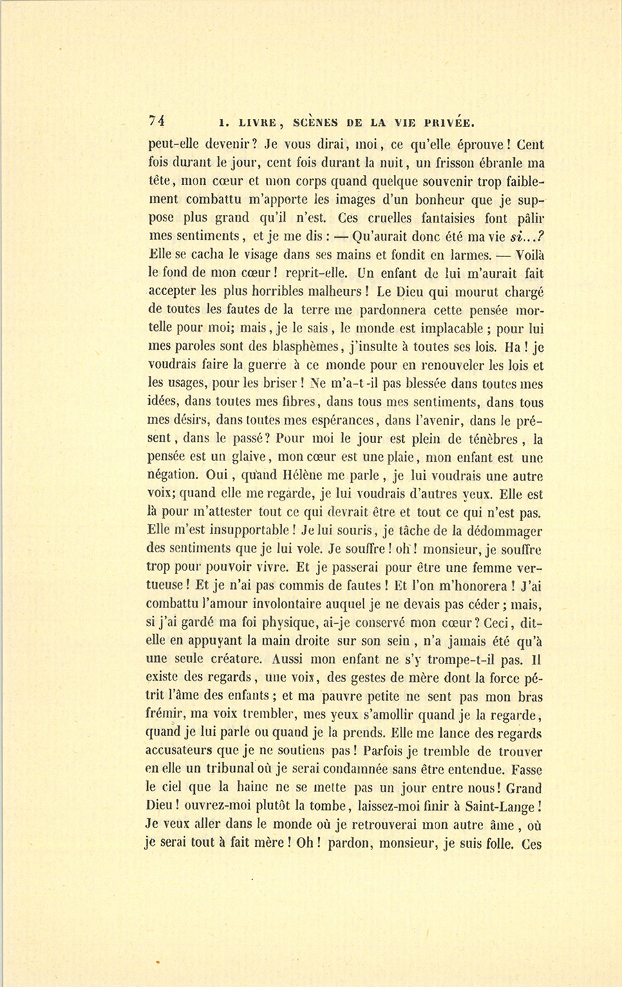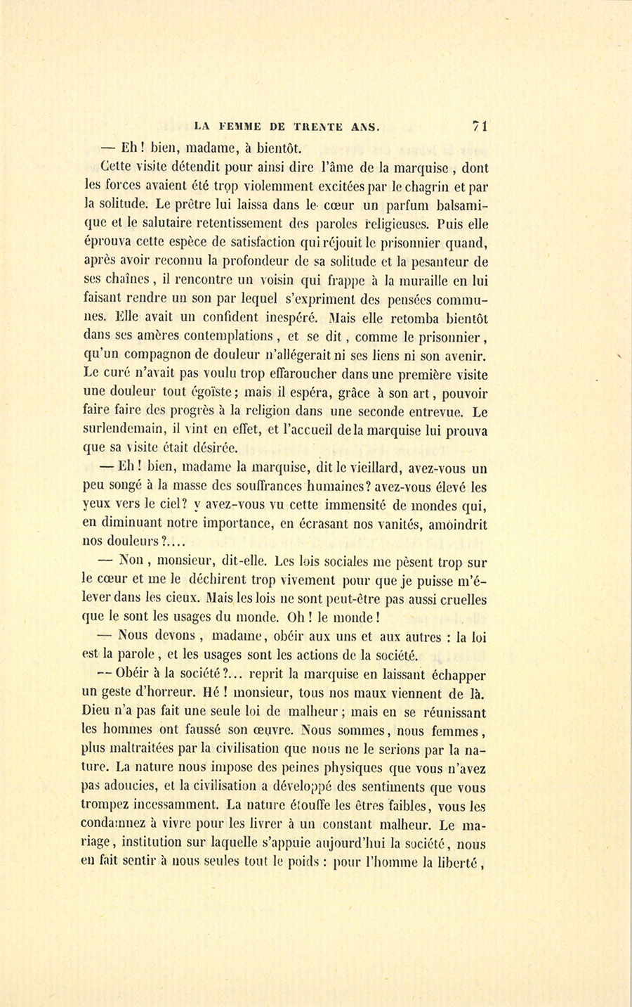 Ces religieuses pensées, si naturelles au cœur des vieillards, flottaient éparses dans l’âme de madame d’Aiglemont ; elles y étaient à {p. 157} demi lumineuses, tantôt abîmées, tantôt déployées complétement, comme des fleurs tourmentées à la surface des eaux pendant une tempête. Elle s’était assise, lassée, affaiblie par une longue méditation, par une de ces rêveries au milieu desquelles toute la vie se dresse, se déroule aux yeux de ceux qui pressentent la mort.