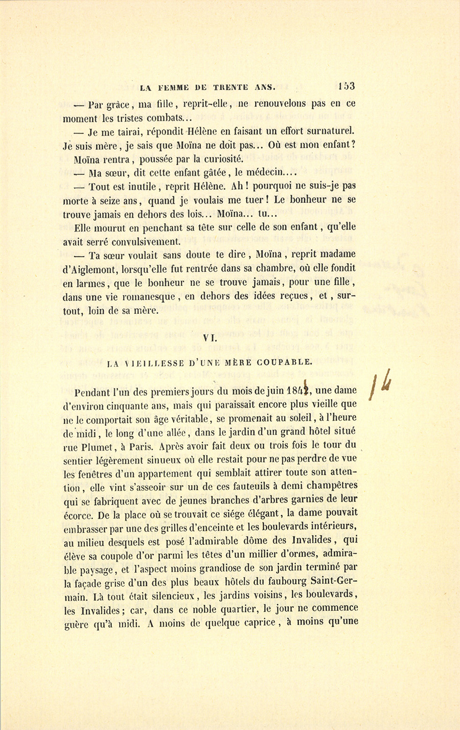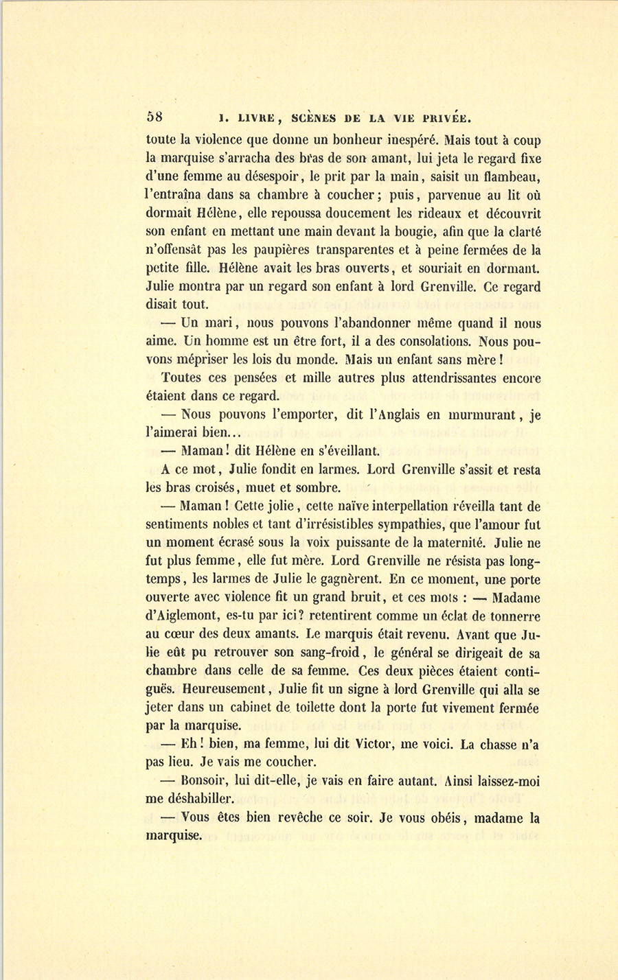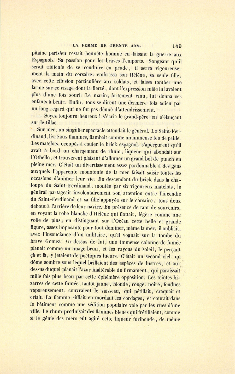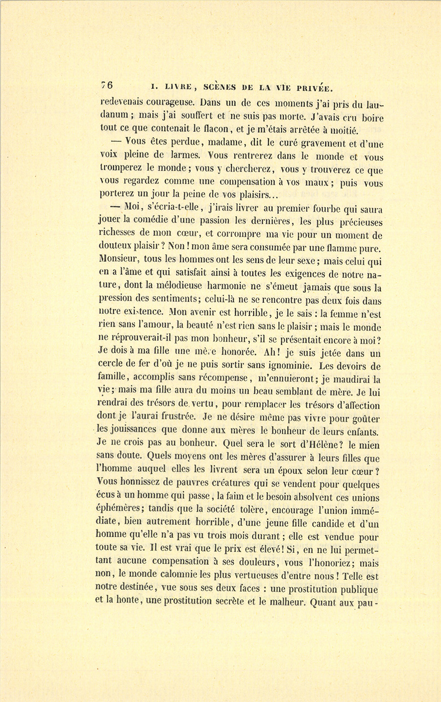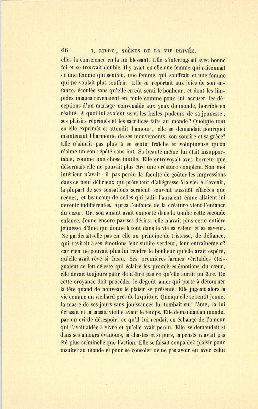 Ces religieuses pensées, si naturelles au cœur des vieillards, flottaient éparses dans l’âme de madame d’Aiglemont ; elles y étaient à {p. 157} demi lumineuses, tantôt abîmées, tantôt déployées complétement, comme des fleurs tourmentées à la surface des eaux pendant une tempête. Elle s’était assise, lassée, affaiblie par une longue méditation, par une de ces rêveries au milieu desquelles toute la vie se dresse, se déroule aux yeux de ceux qui pressentent la mort.