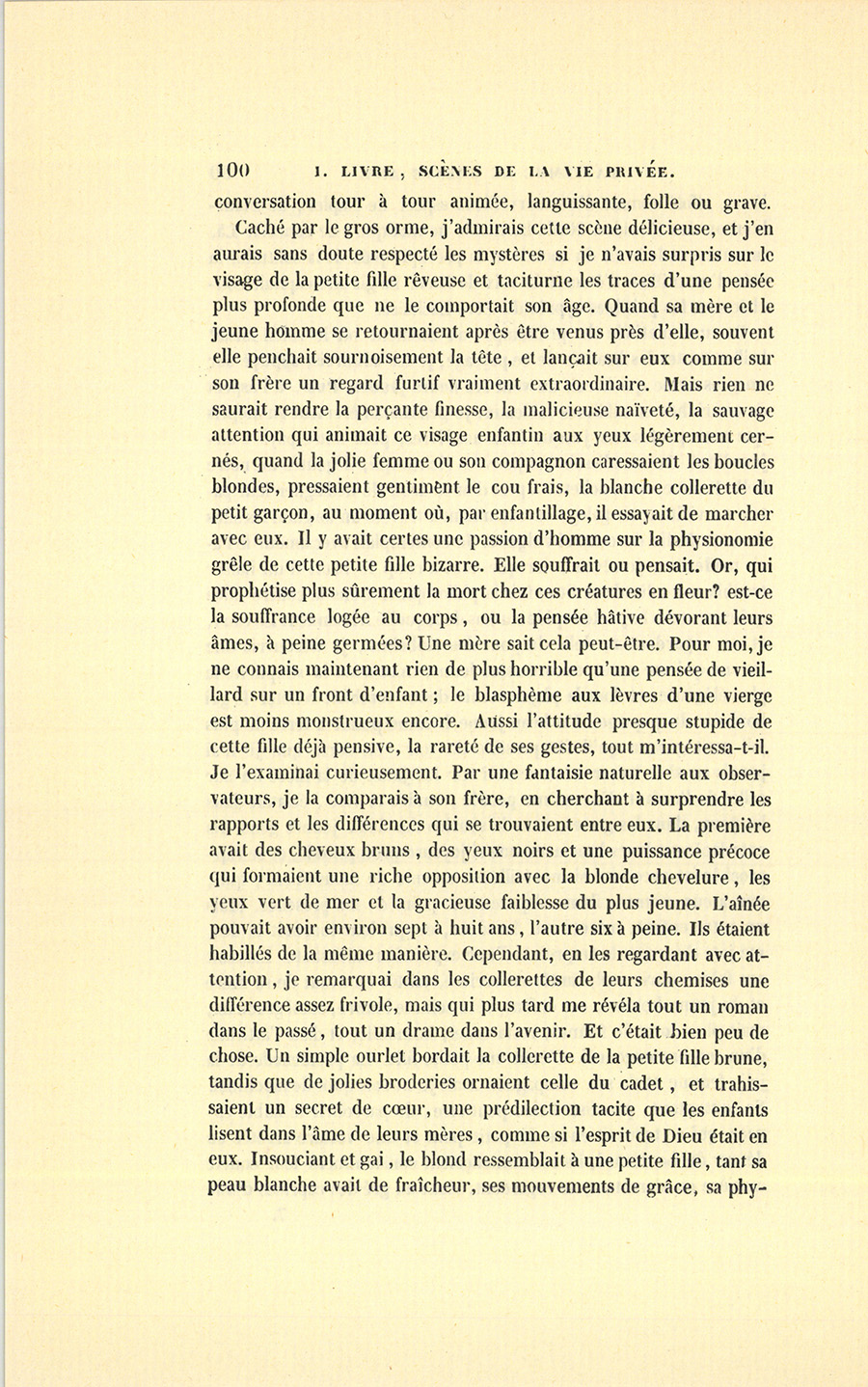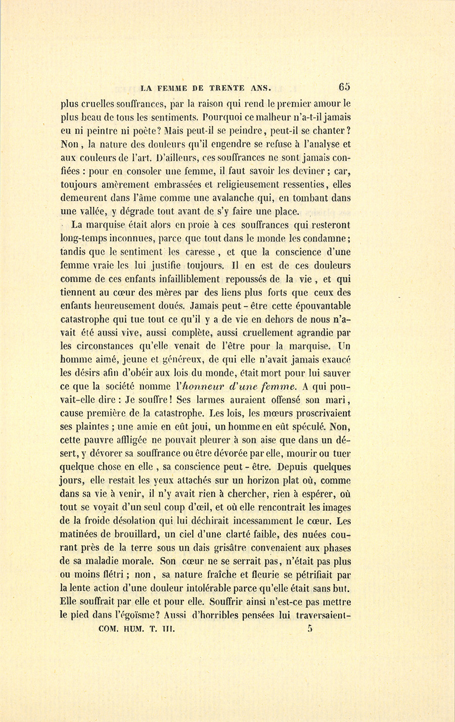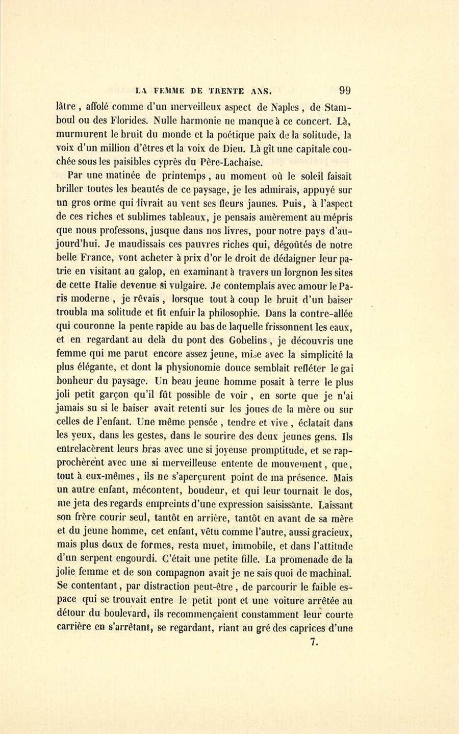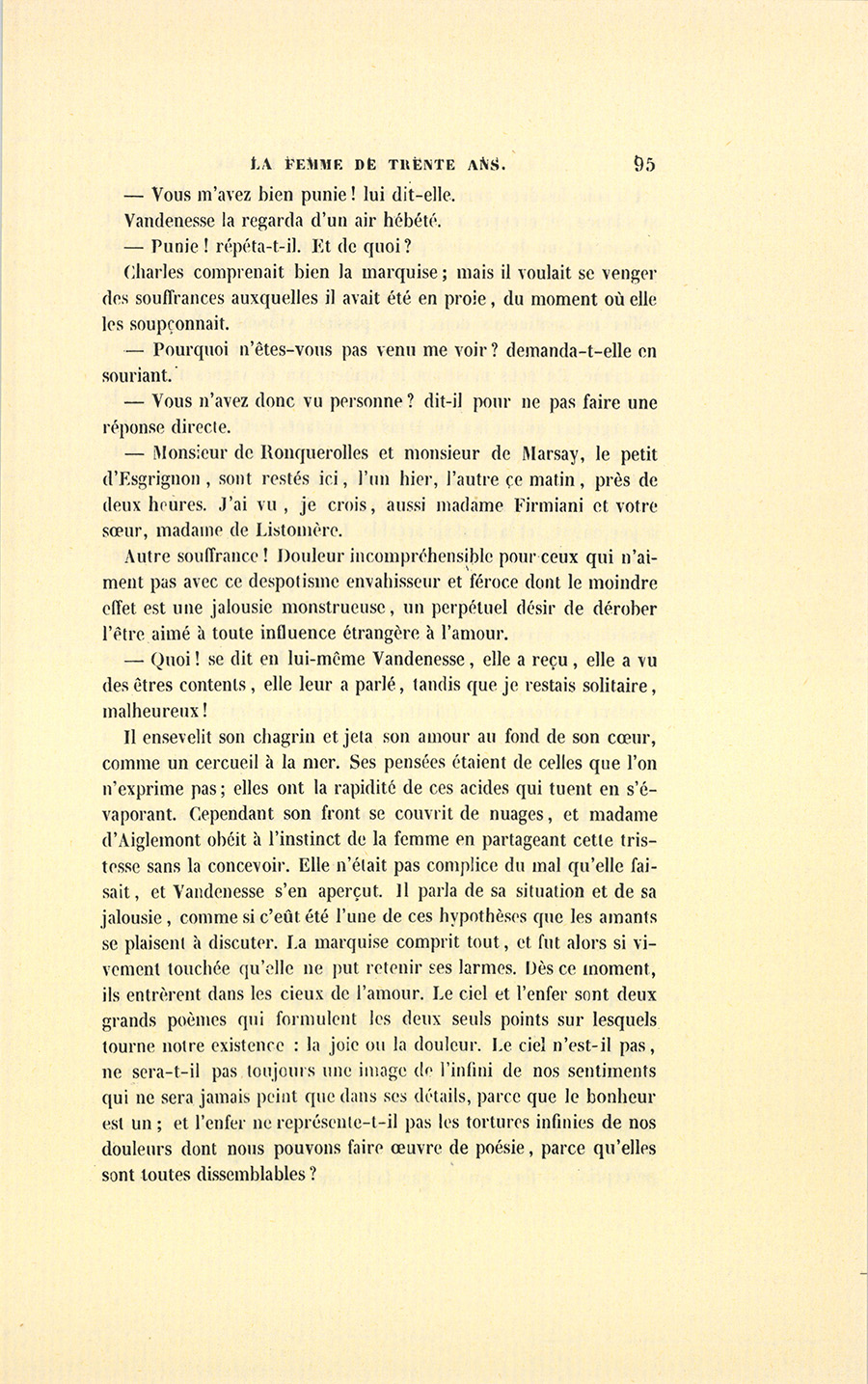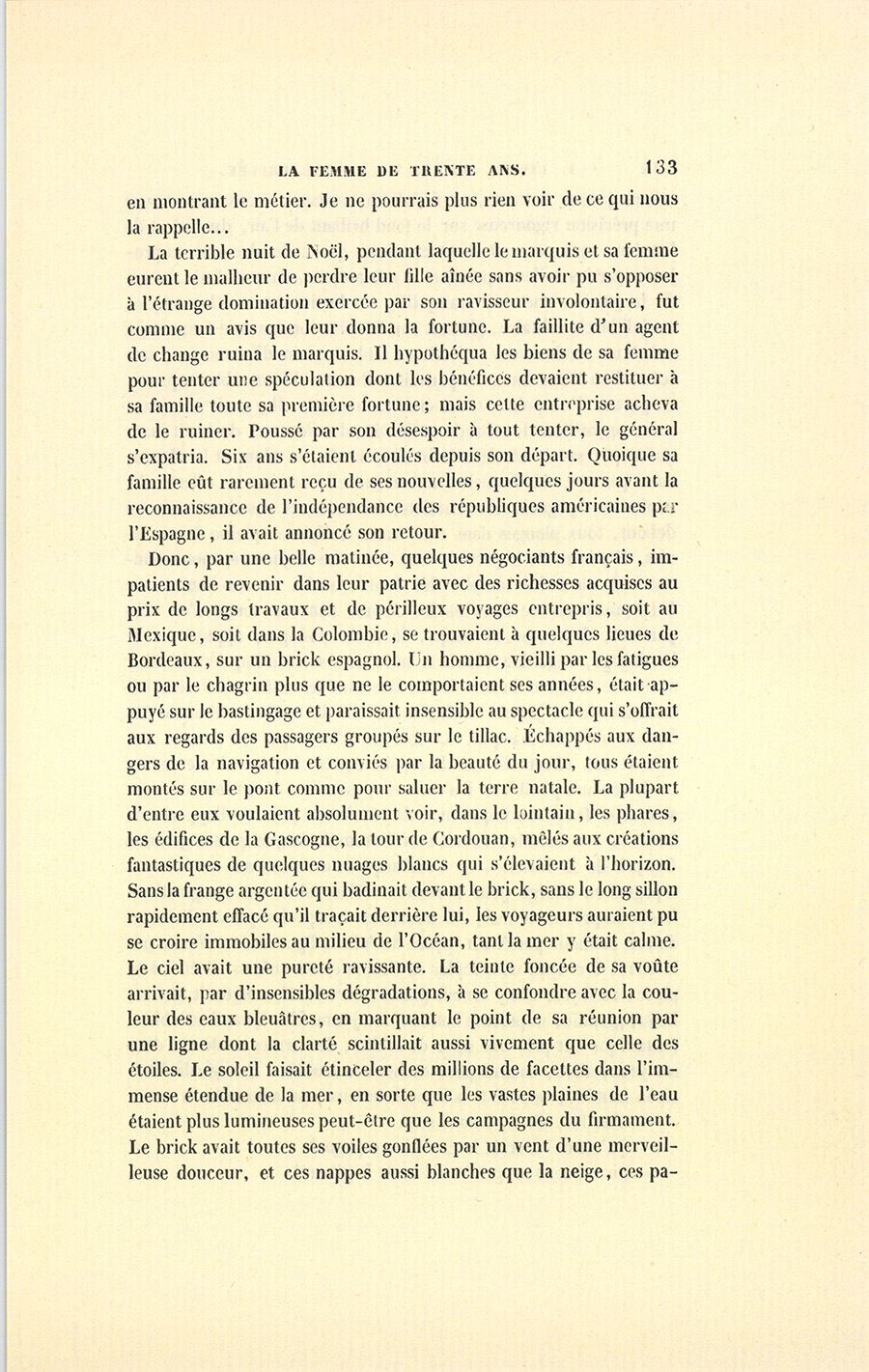 Ces religieuses pensées, si naturelles au cœur des vieillards, flottaient éparses dans l’âme de madame d’Aiglemont ; elles y étaient à {p. 157} demi lumineuses, tantôt abîmées, tantôt déployées complétement, comme des fleurs tourmentées à la surface des eaux pendant une tempête. Elle s’était assise, lassée, affaiblie par une longue méditation, par une de ces rêveries au milieu desquelles toute la vie se dresse, se déroule aux yeux de ceux qui pressentent la mort.