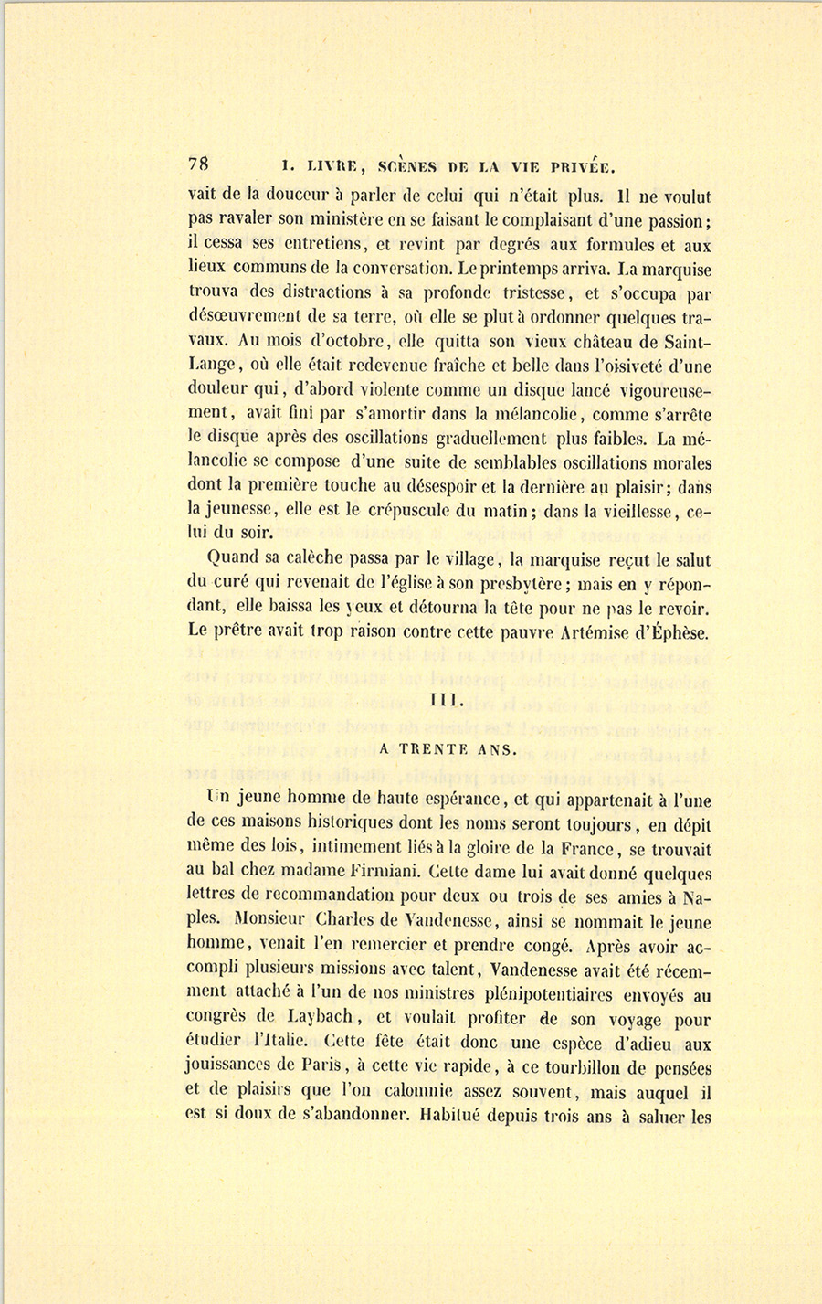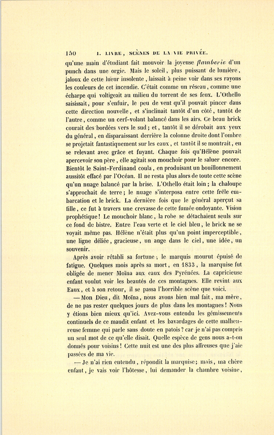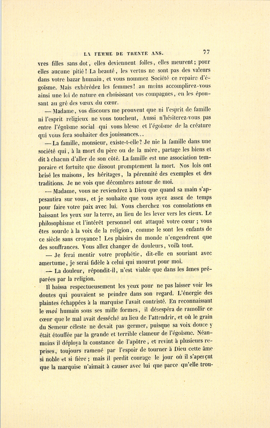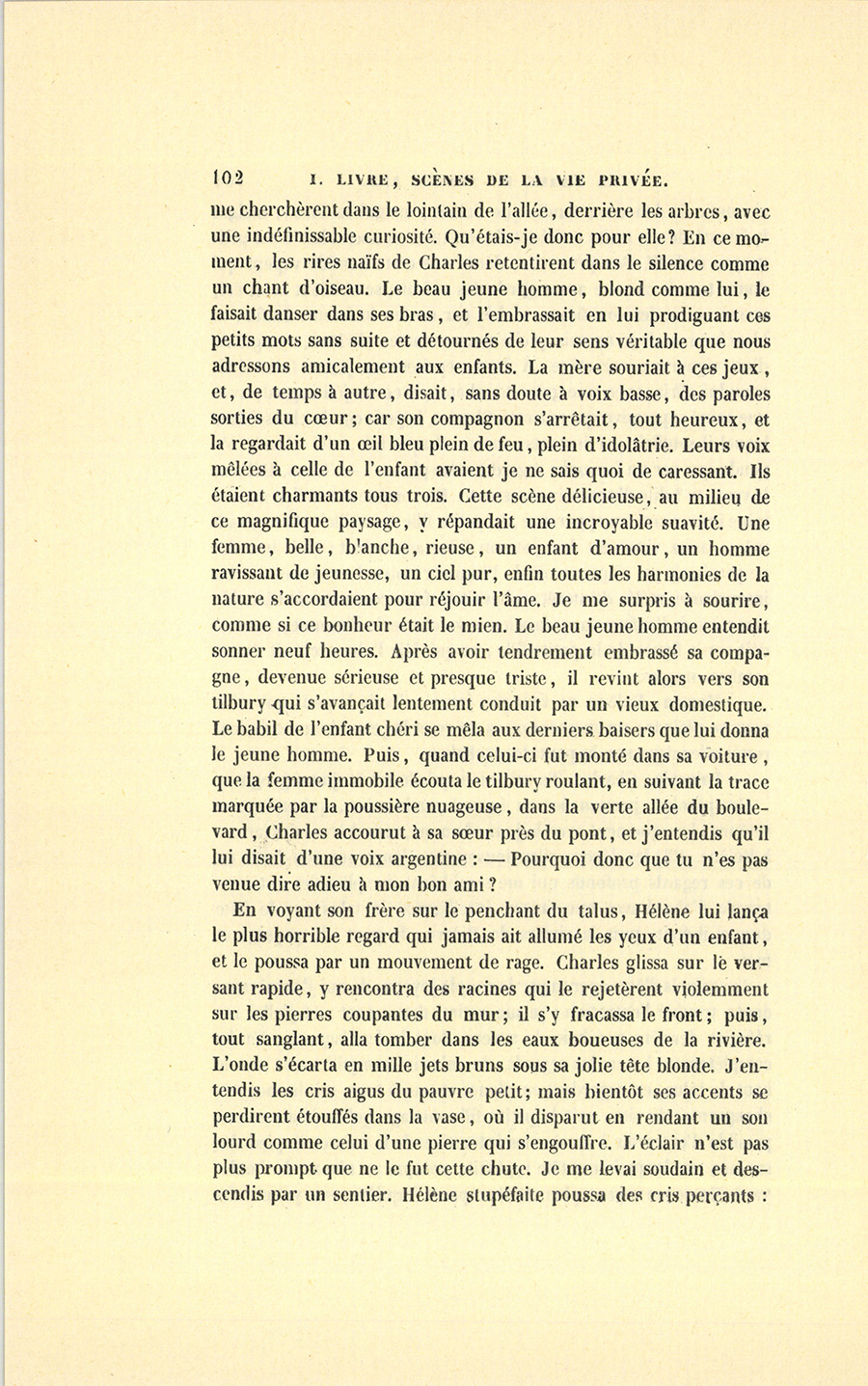 Ces religieuses pensées, si naturelles au cœur des vieillards, flottaient éparses dans l’âme de madame d’Aiglemont ; elles y étaient à {p. 157} demi lumineuses, tantôt abîmées, tantôt déployées complétement, comme des fleurs tourmentées à la surface des eaux pendant une tempête. Elle s’était assise, lassée, affaiblie par une longue méditation, par une de ces rêveries au milieu desquelles toute la vie se dresse, se déroule aux yeux de ceux qui pressentent la mort.