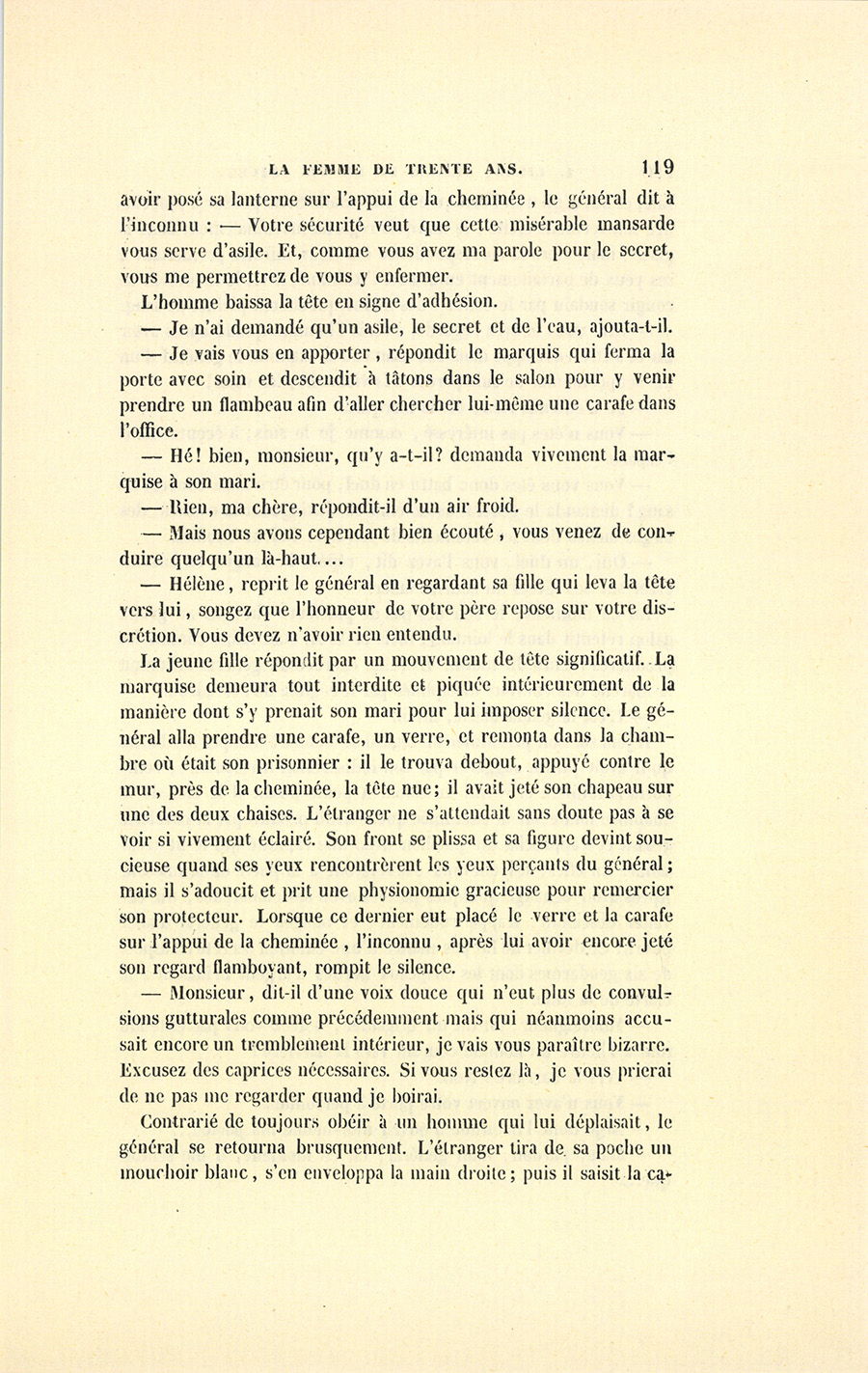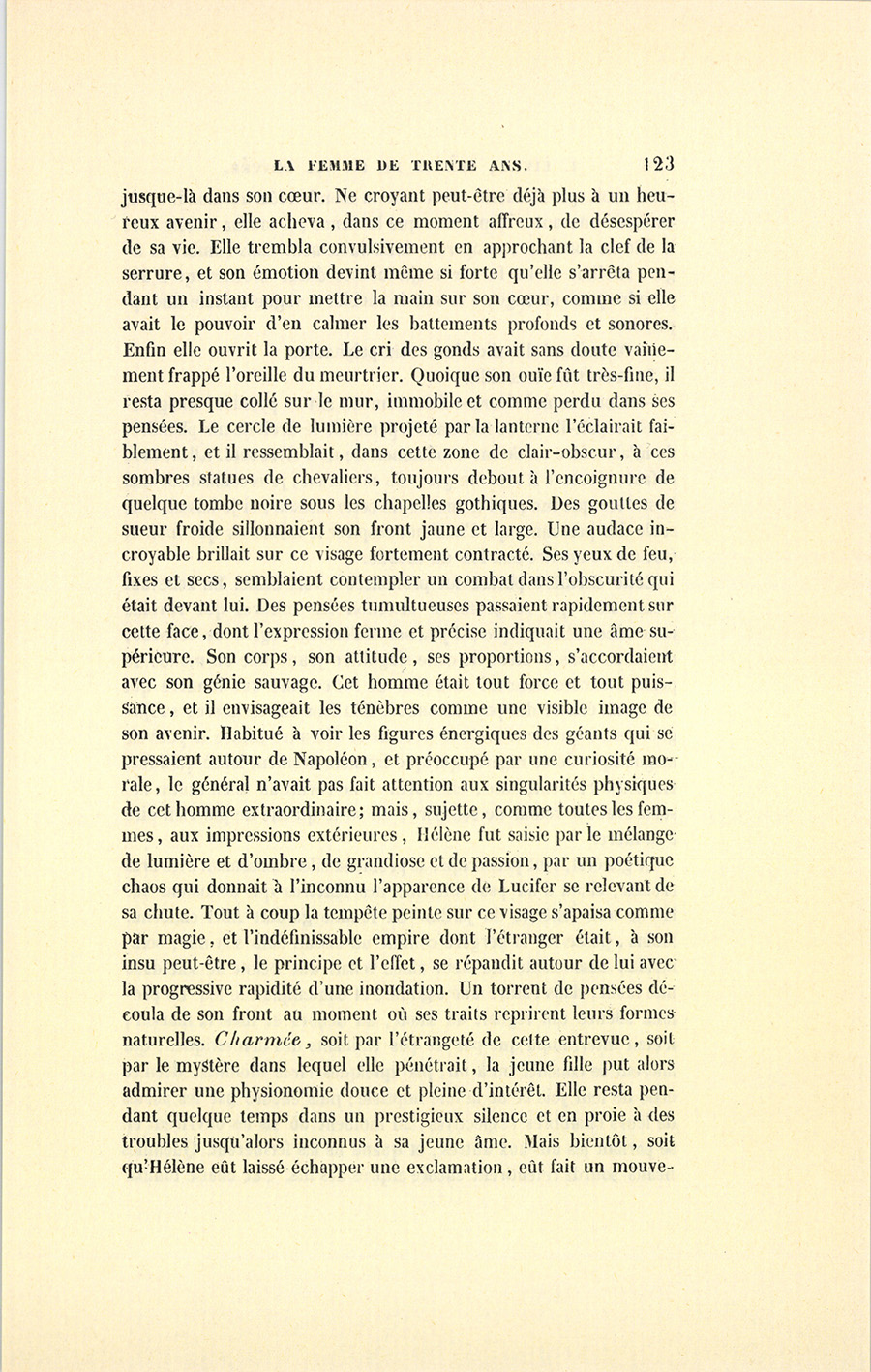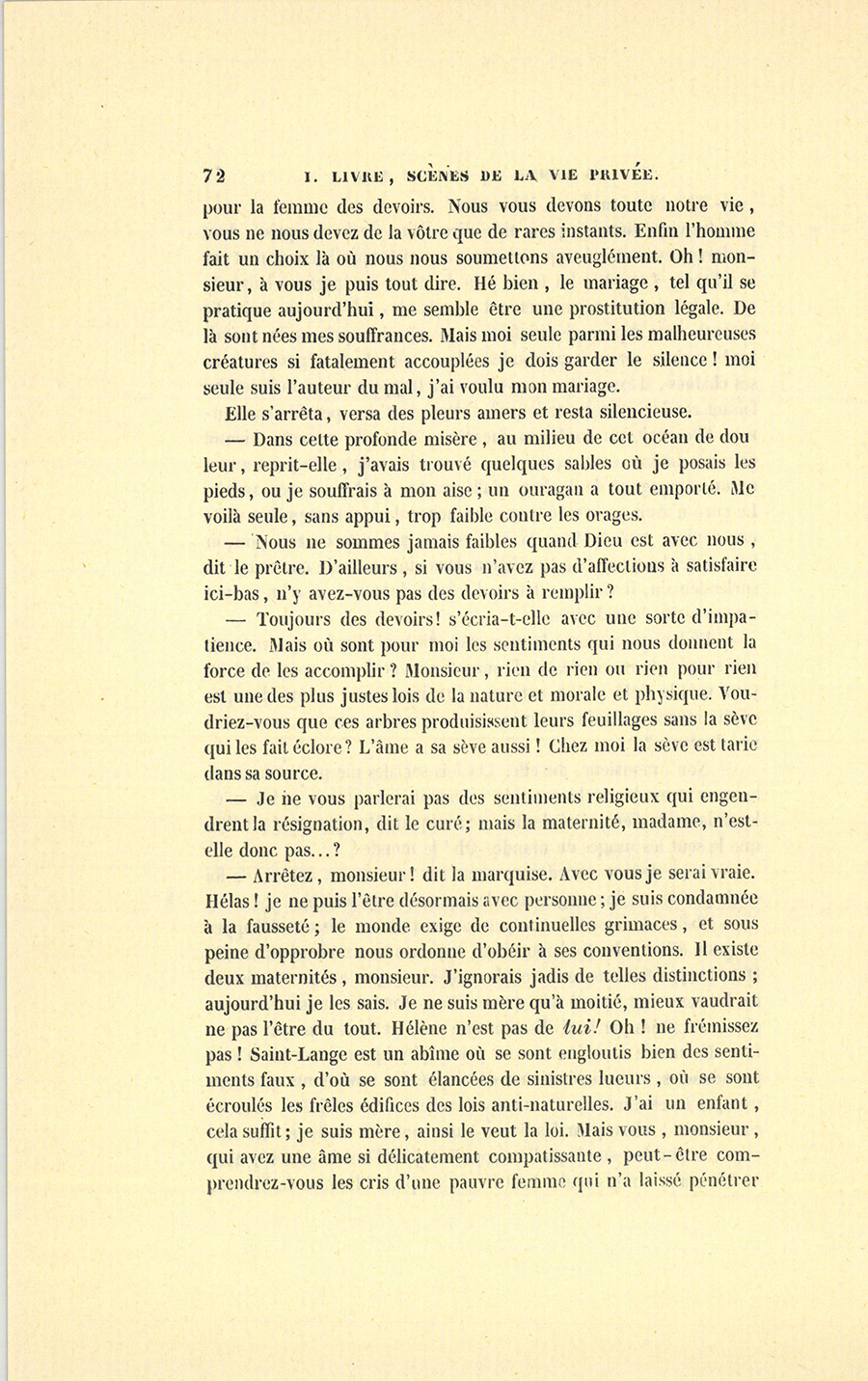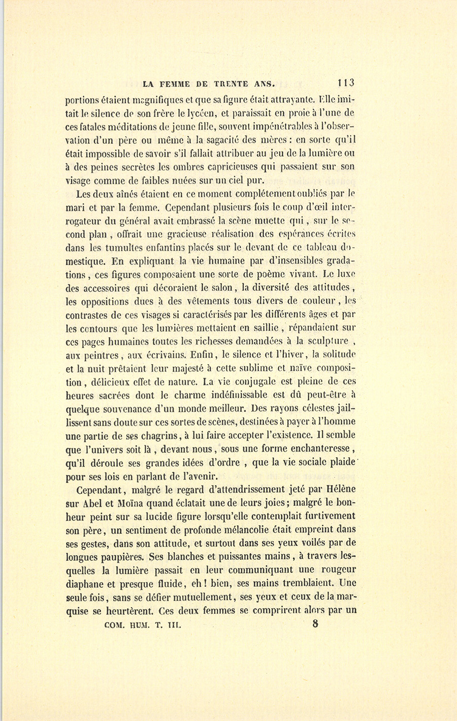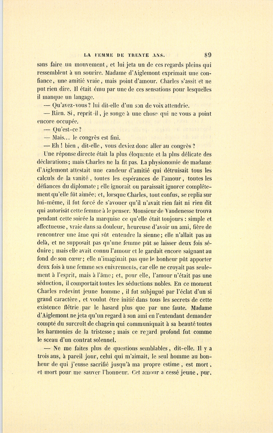 Ces religieuses pensées, si naturelles au cœur des vieillards, flottaient éparses dans l’âme de madame d’Aiglemont ; elles y étaient à {p. 157} demi lumineuses, tantôt abîmées, tantôt déployées complétement, comme des fleurs tourmentées à la surface des eaux pendant une tempête. Elle s’était assise, lassée, affaiblie par une longue méditation, par une de ces rêveries au milieu desquelles toute la vie se dresse, se déroule aux yeux de ceux qui pressentent la mort.