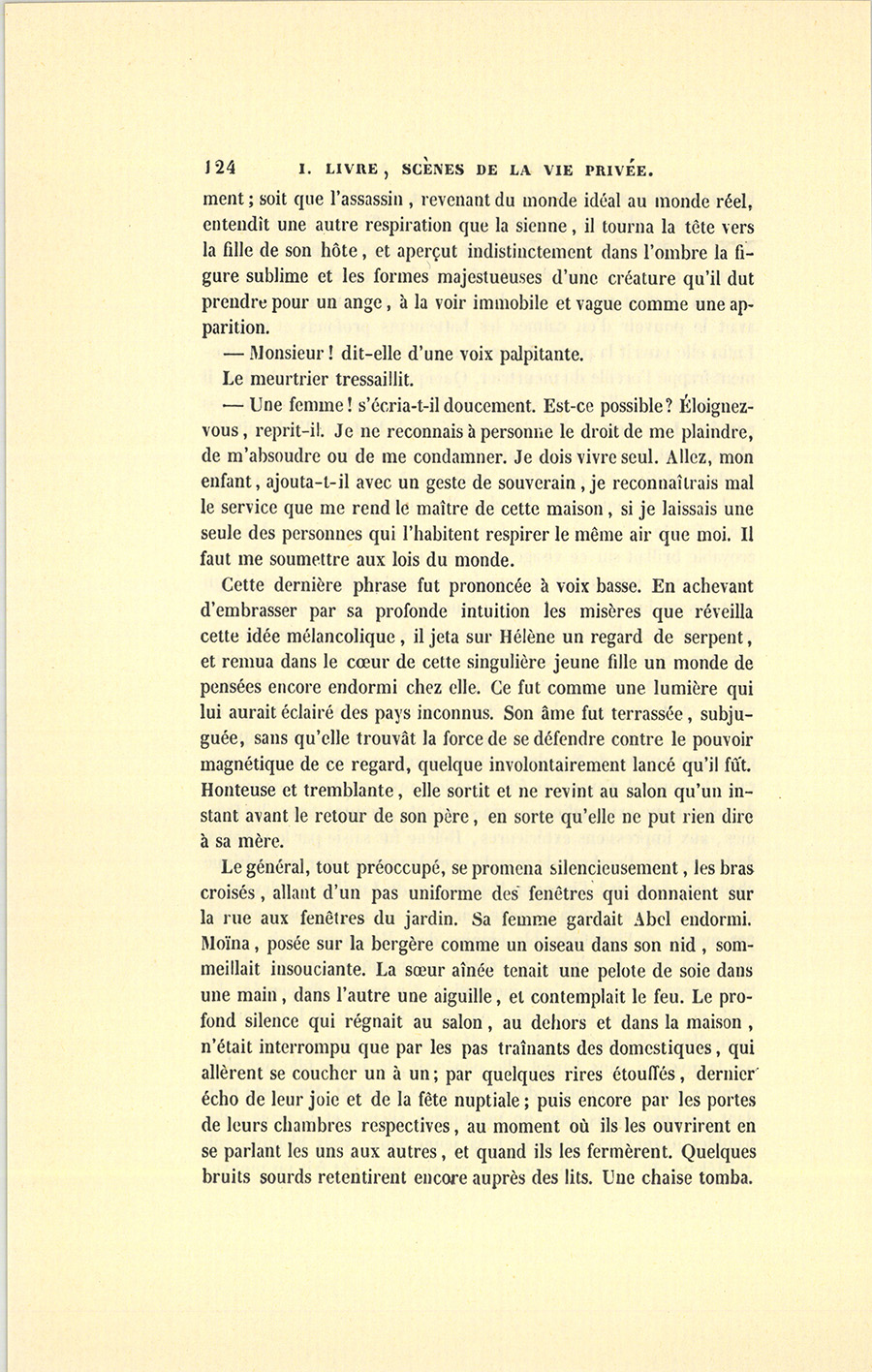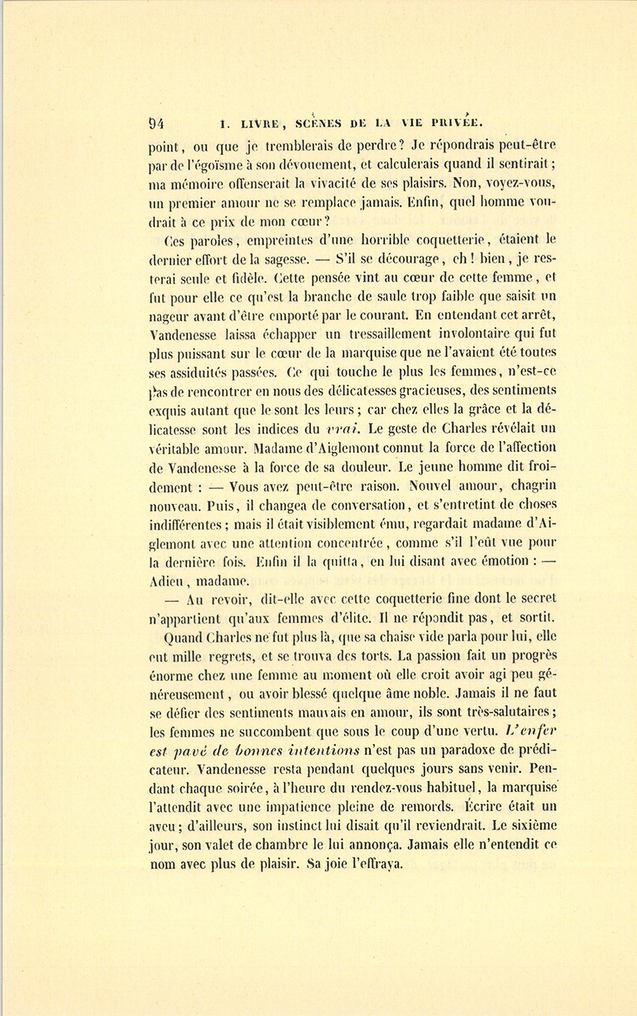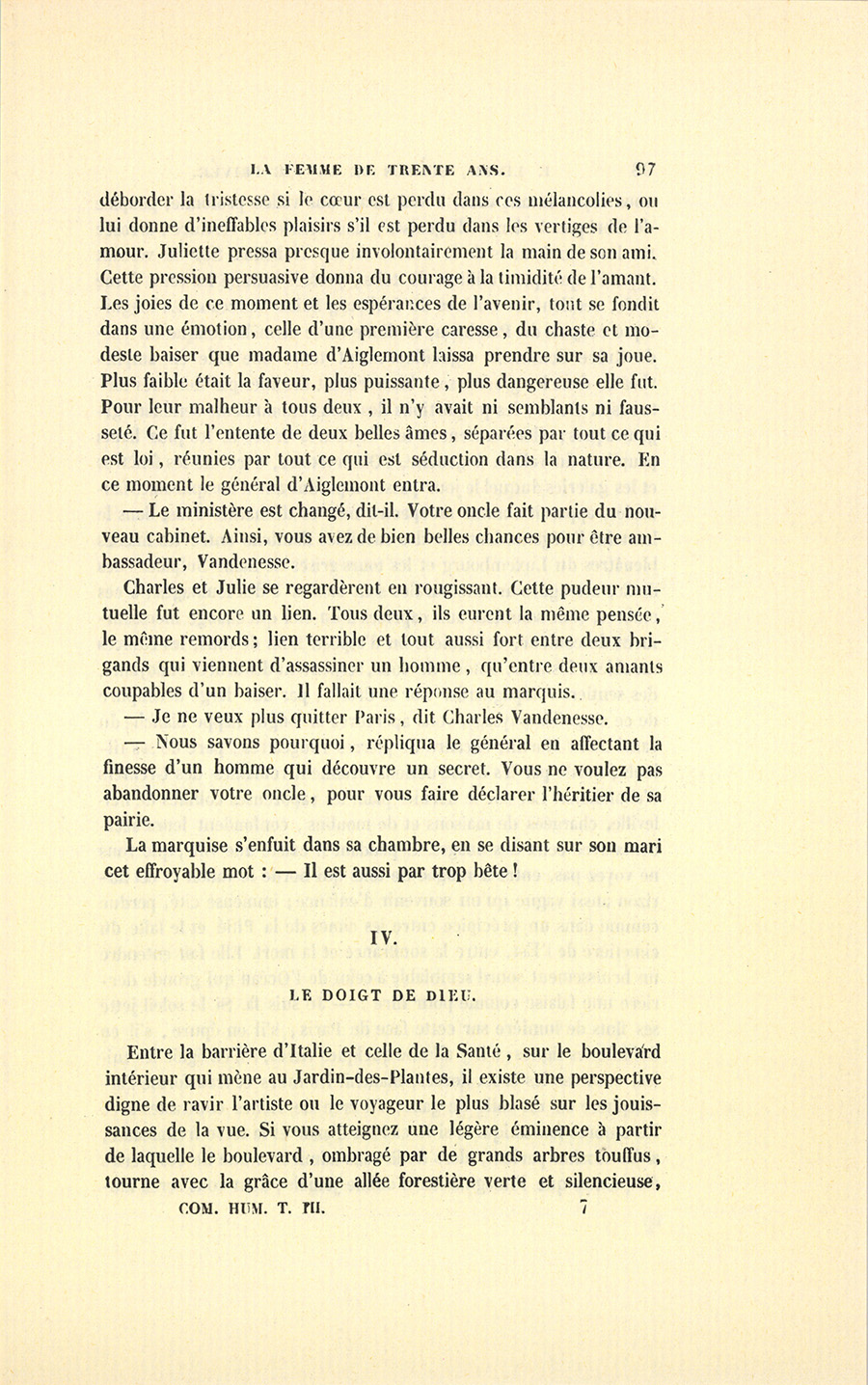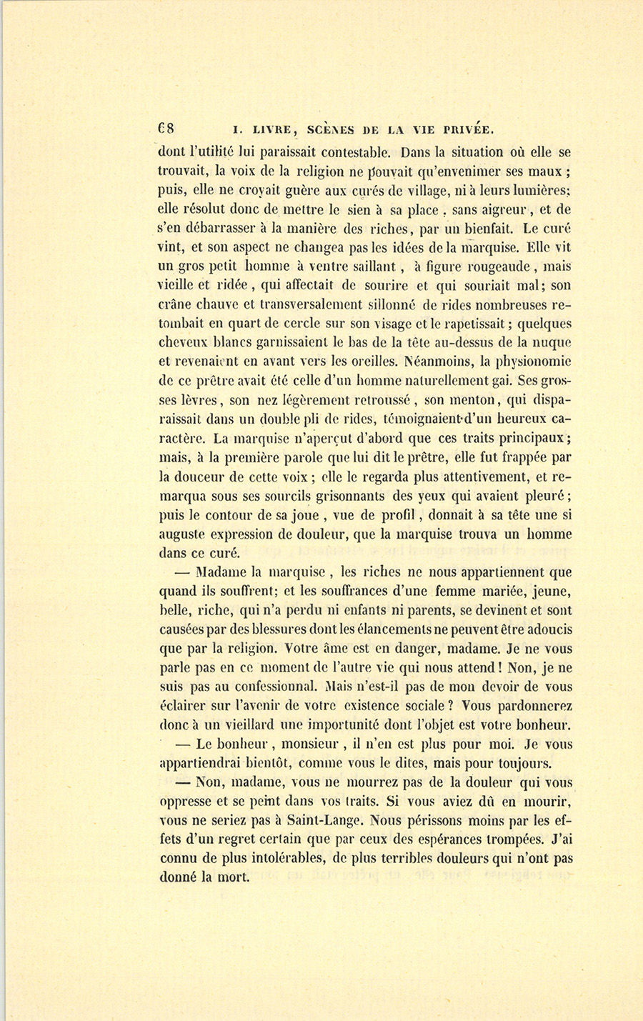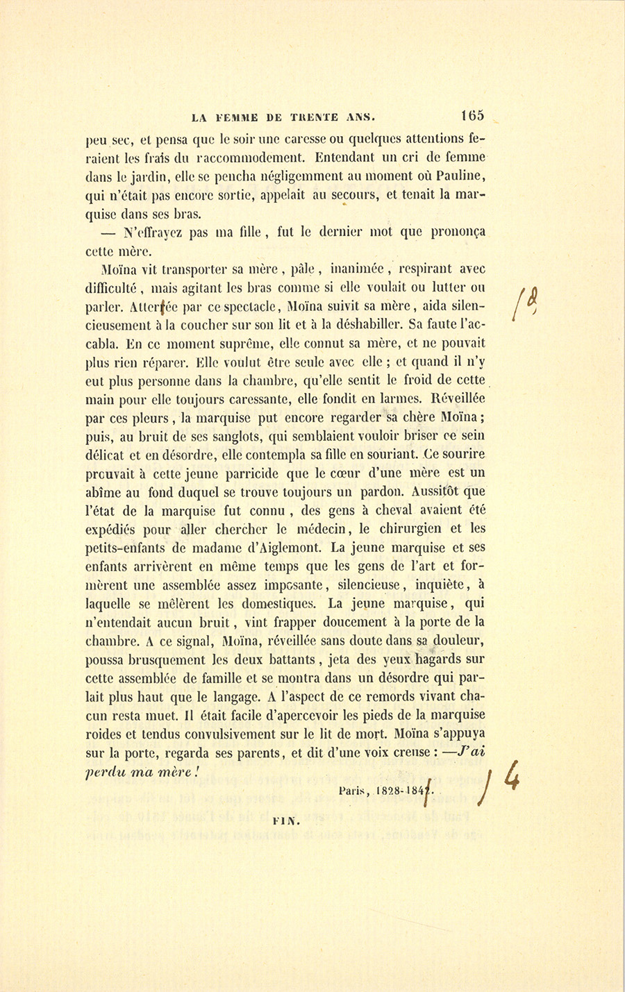 Ces religieuses pensées, si naturelles au cœur des vieillards, flottaient éparses dans l’âme de madame d’Aiglemont ; elles y étaient à {p. 157} demi lumineuses, tantôt abîmées, tantôt déployées complétement, comme des fleurs tourmentées à la surface des eaux pendant une tempête. Elle s’était assise, lassée, affaiblie par une longue méditation, par une de ces rêveries au milieu desquelles toute la vie se dresse, se déroule aux yeux de ceux qui pressentent la mort.