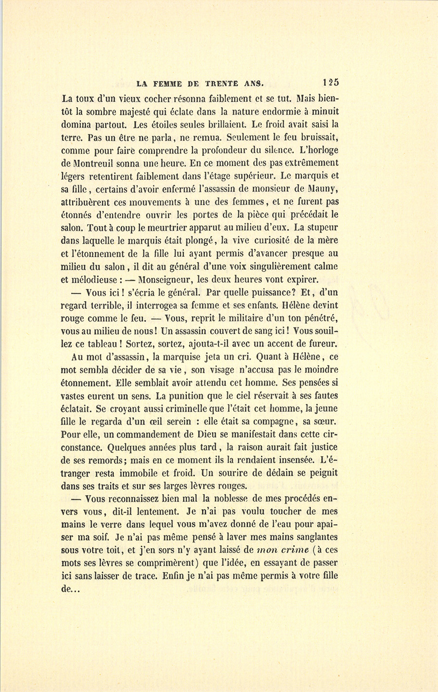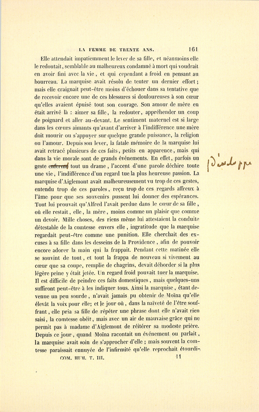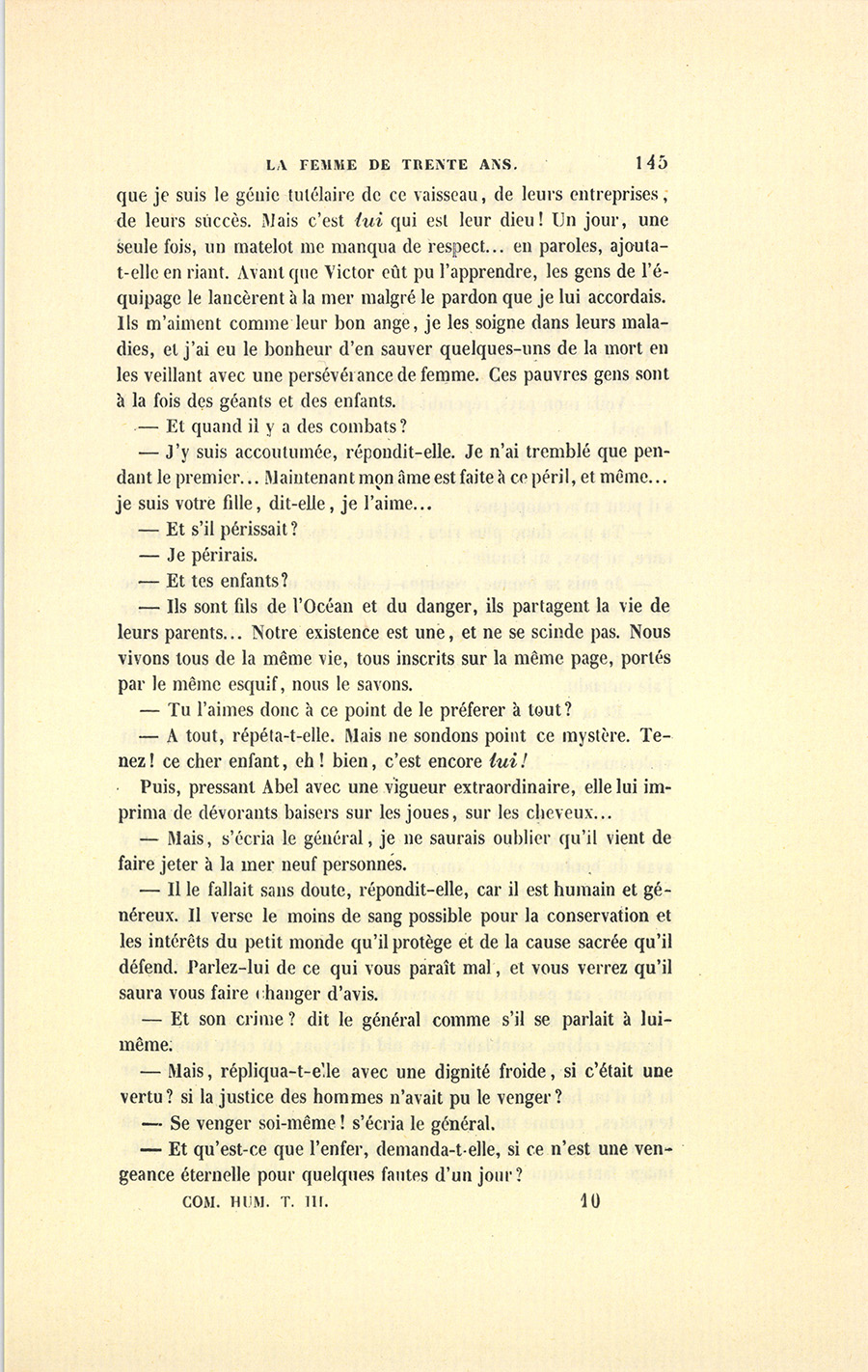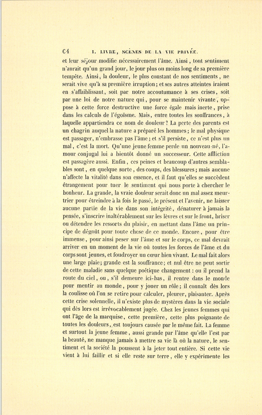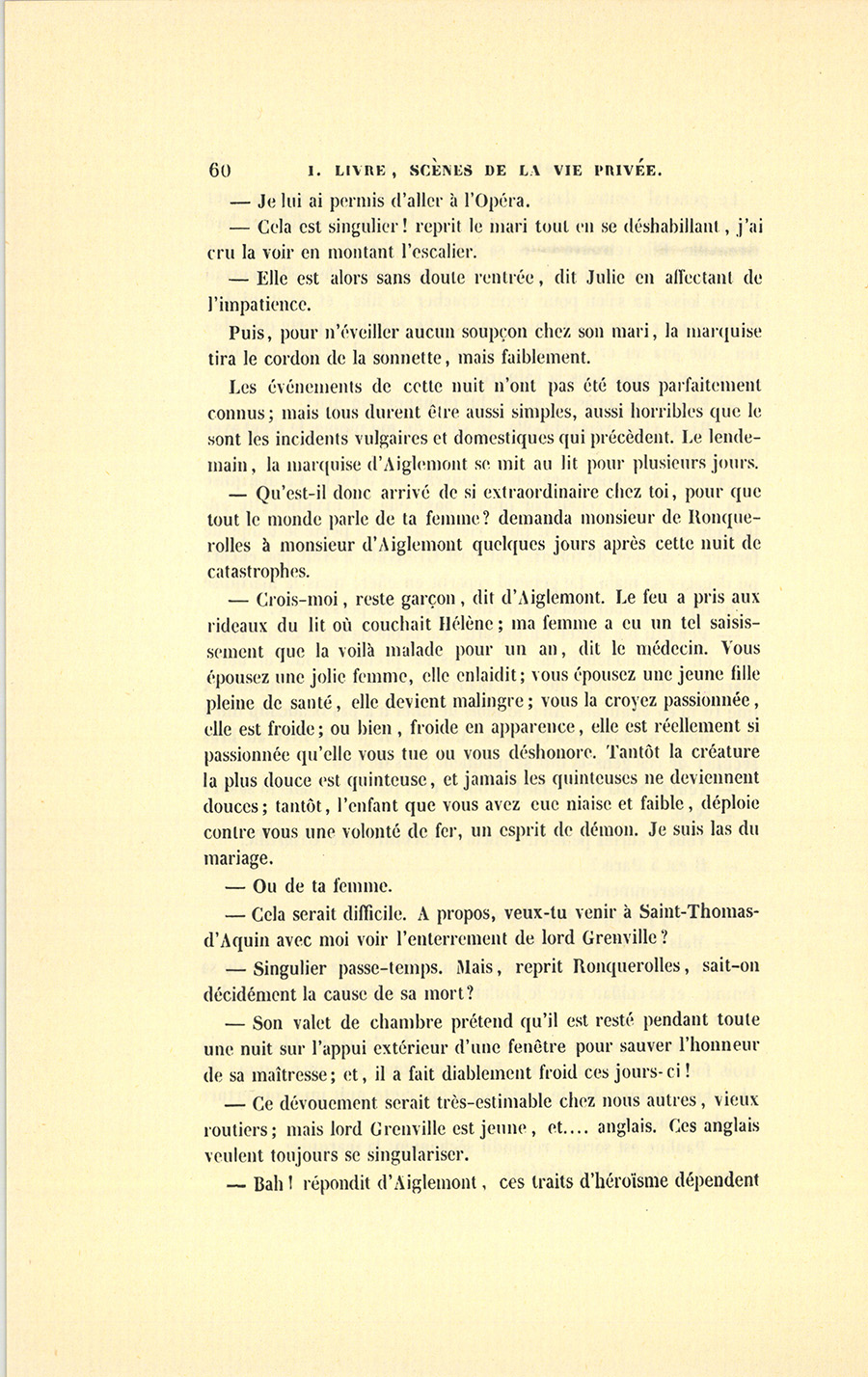 Ces religieuses pensées, si naturelles au cœur des vieillards, flottaient éparses dans l’âme de madame d’Aiglemont ; elles y étaient à {p. 157} demi lumineuses, tantôt abîmées, tantôt déployées complétement, comme des fleurs tourmentées à la surface des eaux pendant une tempête. Elle s’était assise, lassée, affaiblie par une longue méditation, par une de ces rêveries au milieu desquelles toute la vie se dresse, se déroule aux yeux de ceux qui pressentent la mort.