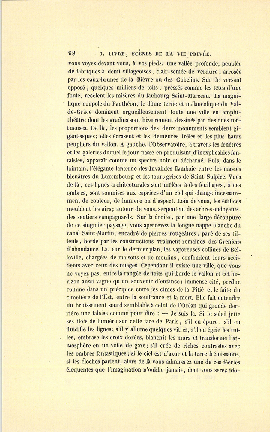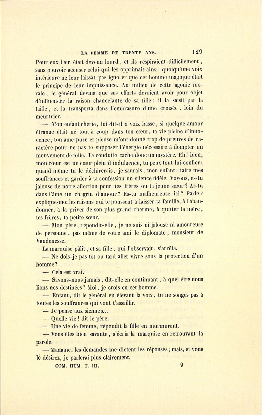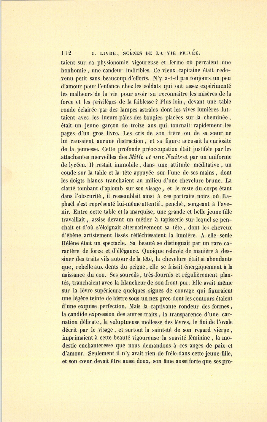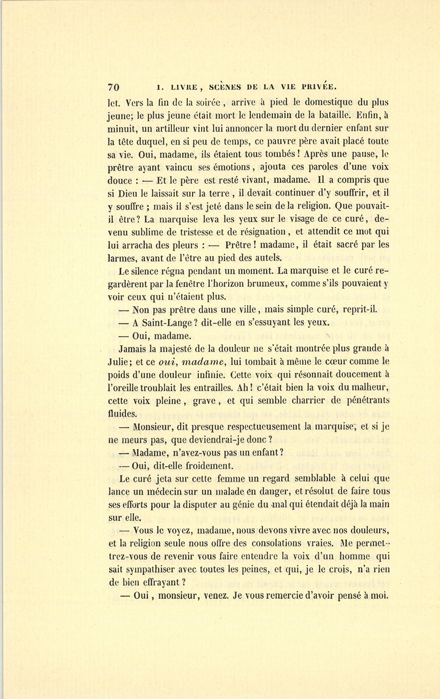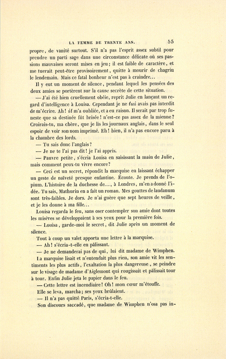 Ces religieuses pensées, si naturelles au cœur des vieillards, flottaient éparses dans l’âme de madame d’Aiglemont ; elles y étaient à {p. 157} demi lumineuses, tantôt abîmées, tantôt déployées complétement, comme des fleurs tourmentées à la surface des eaux pendant une tempête. Elle s’était assise, lassée, affaiblie par une longue méditation, par une de ces rêveries au milieu desquelles toute la vie se dresse, se déroule aux yeux de ceux qui pressentent la mort.