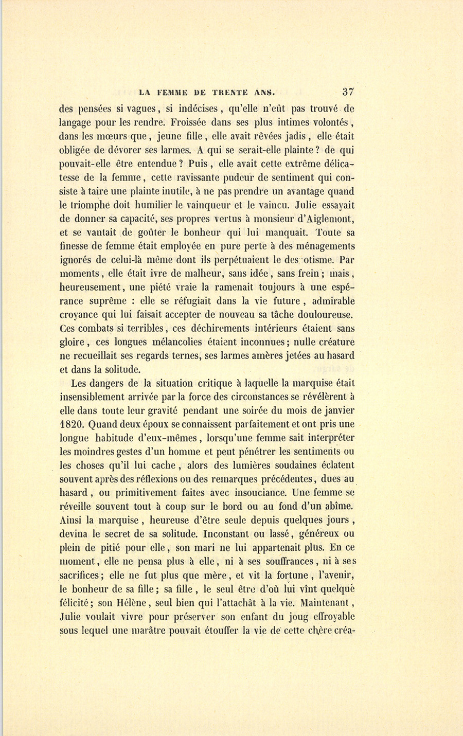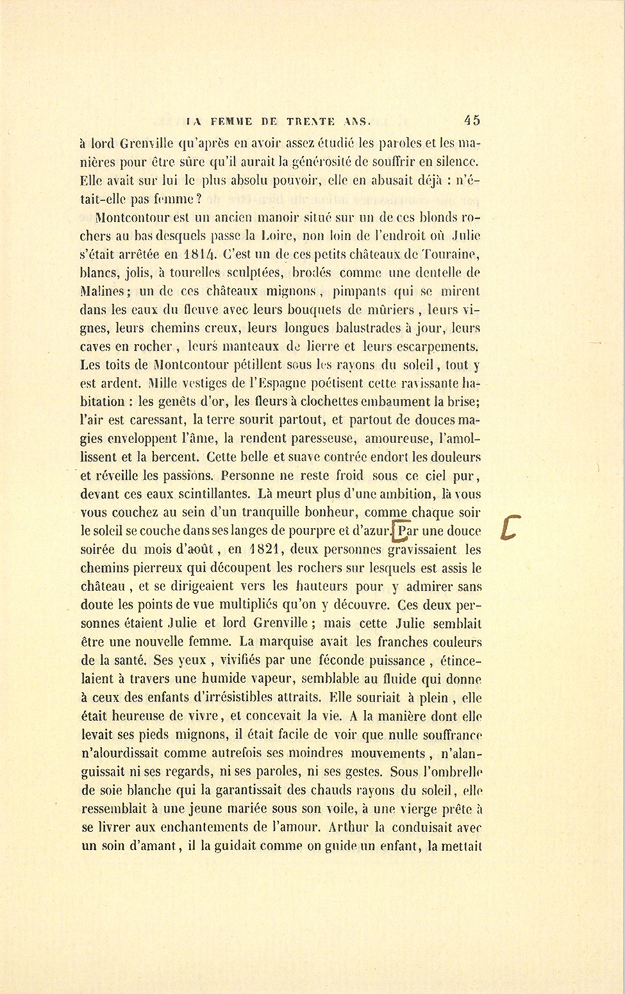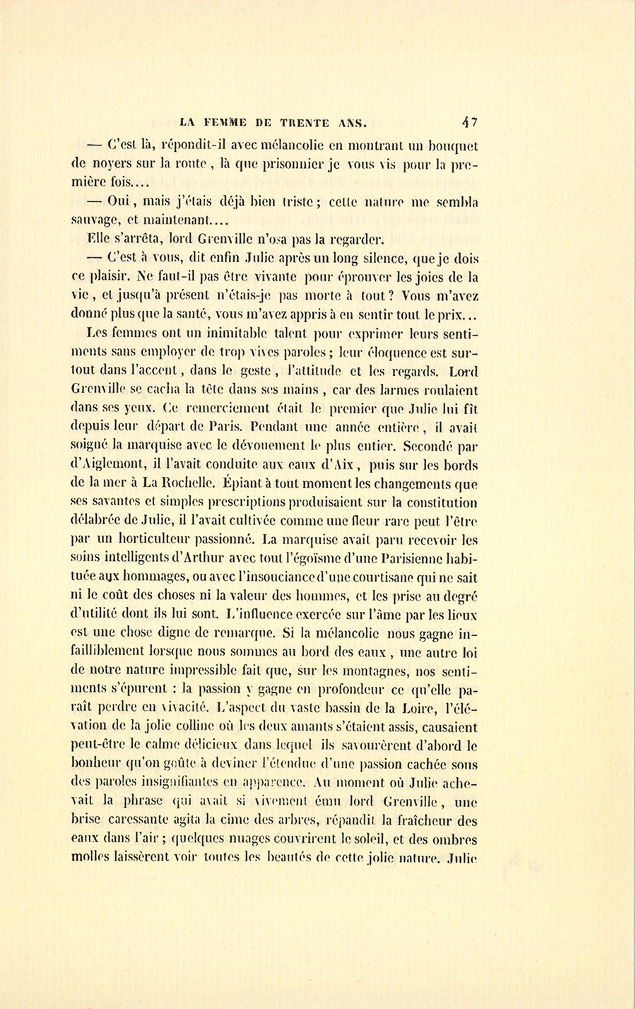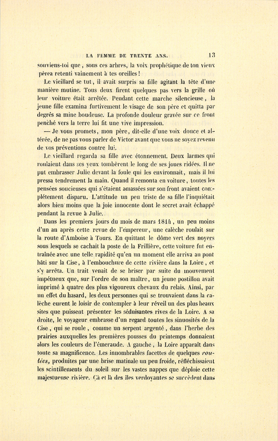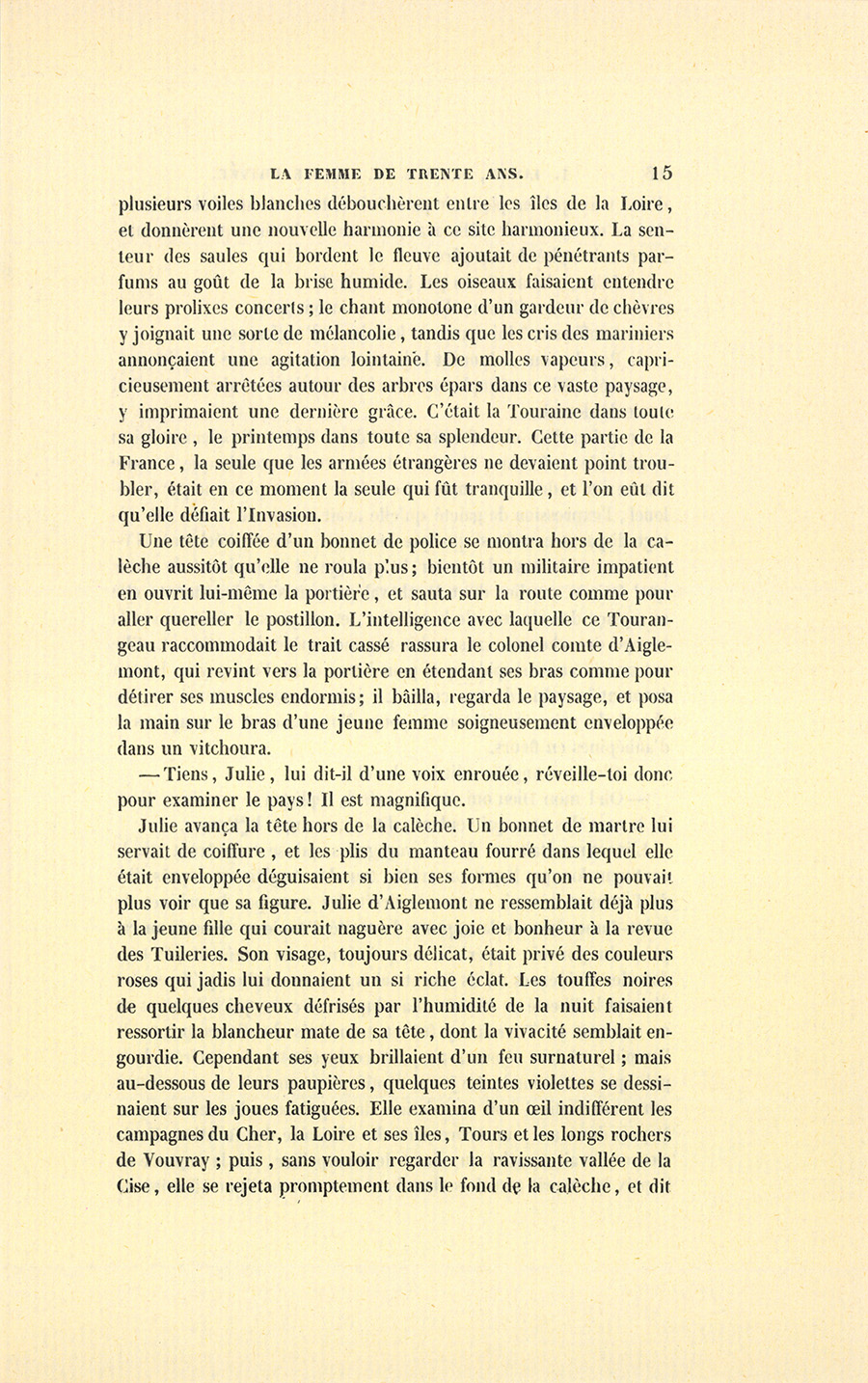 Julie avança la tête hors de la calèche. Un bonnet de martre lui servait de coiffure, et les plis du manteau fourré dans lequel elle était enveloppée déguisaient si bien ses formes qu’on ne pouvait plus voir que sa figure. Julie d’Aiglemont ne ressemblait déjà plus à la jeune fille qui courait naguère avec joie et bonheur à la revue des Tuileries. Son visage, toujours délicat, était privé des couleurs roses qui jadis lui donnaient un si riche éclat. Les touffes noires de quelques cheveux défrisés par l’humidité de la nuit faisaient ressortir la blancheur mate de sa tête, dont la vivacité semblait engourdie. Cependant ses yeux brillaient d’un feu surnaturel ; mais au-dessous de leurs paupières, quelques teintes violettes se dessinaient sur les joues fatiguées. Elle examina d’un œil indifférent les campagnes du Cher, la Loire et ses îles, Tours et les longs rochers de Vouvray ; puis, sans vouloir regarder la ravissante vallée de la Cise, elle se rejeta promptement dans le fond de la calèche, et dit {p. 16} d’une voix qui en plein air paraissait d’une extrême faiblesse : – Oui, c’est admirable. Elle avait, comme on le voit, pour son malheur, triomphé de son père.