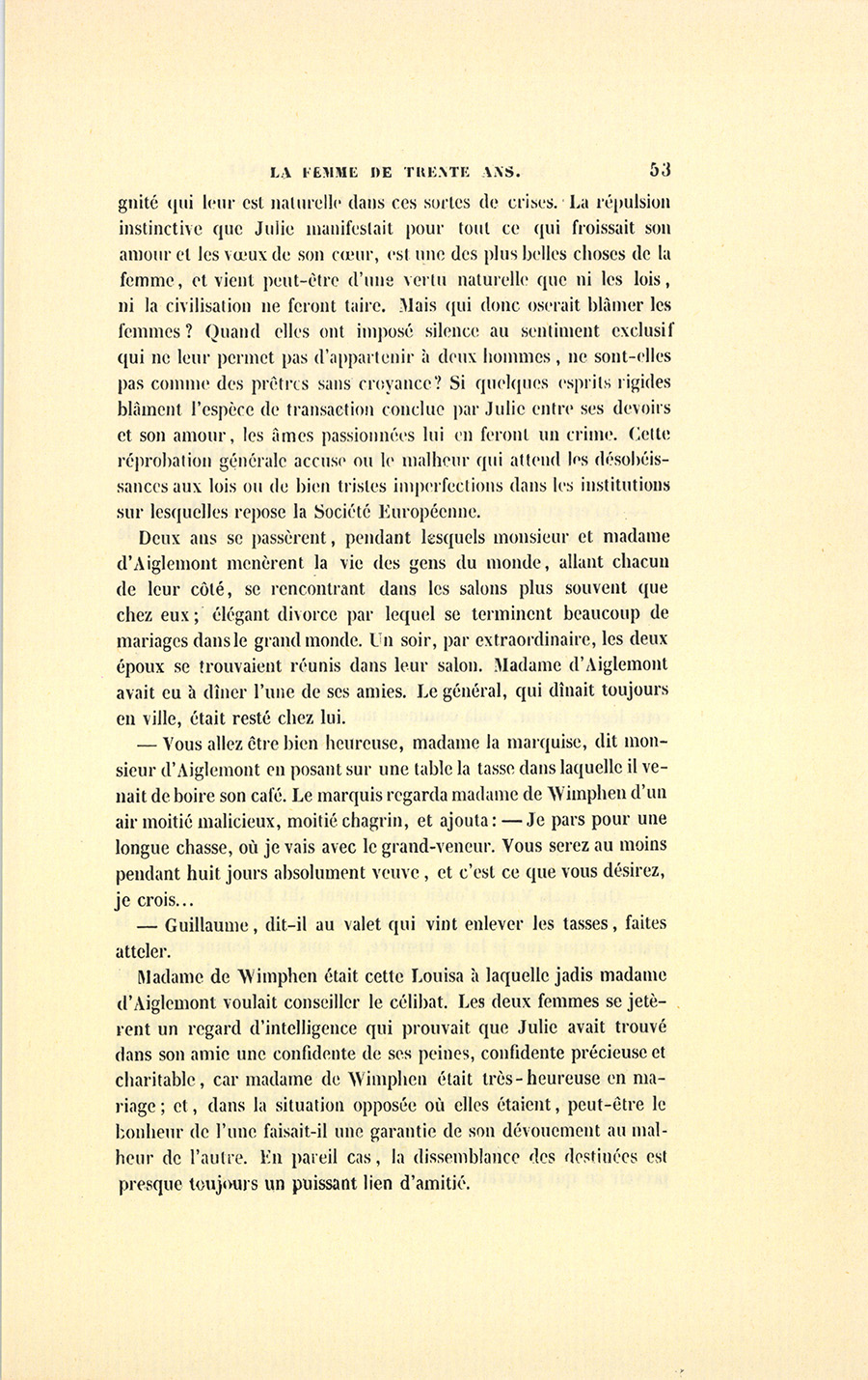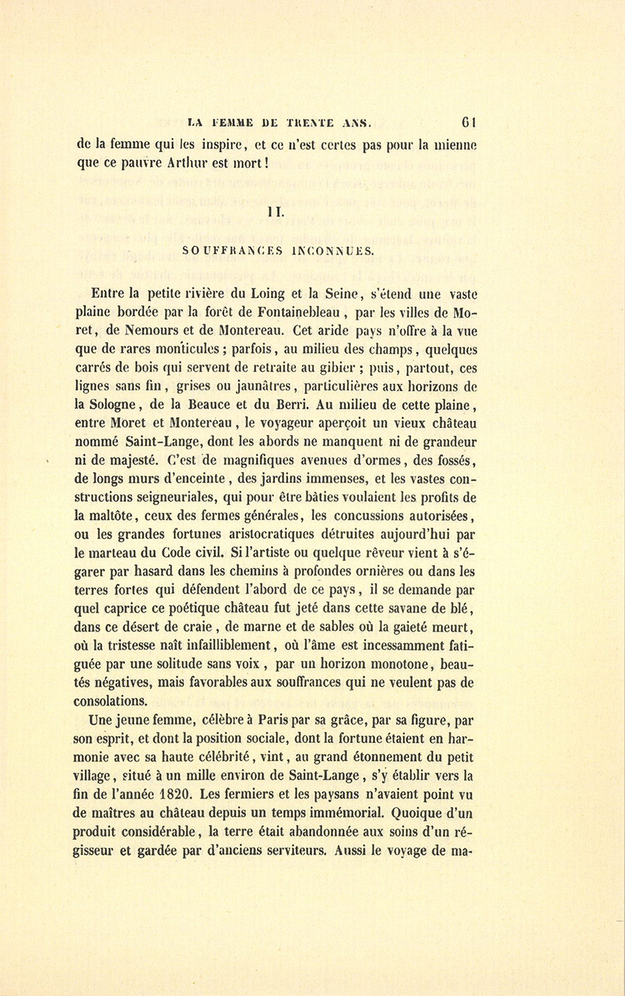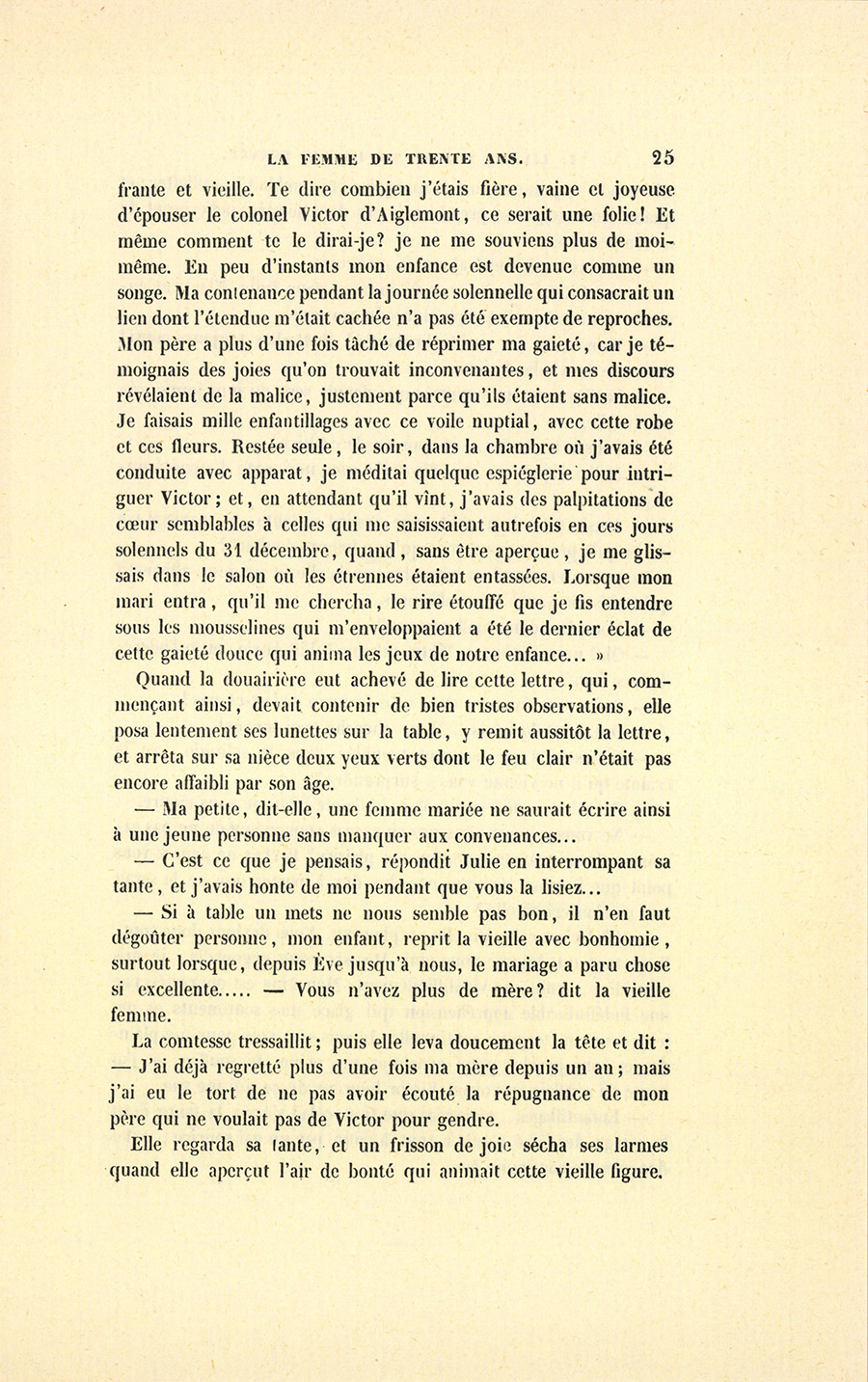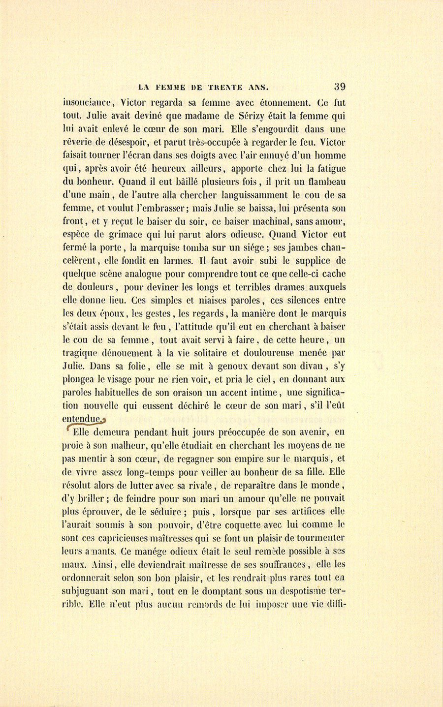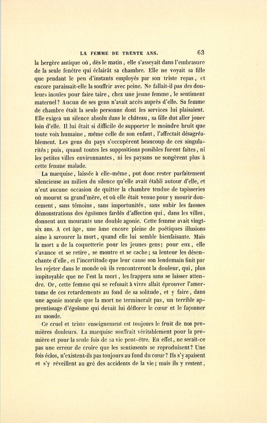 Julie avança la tête hors de la calèche. Un bonnet de martre lui servait de coiffure, et les plis du manteau fourré dans lequel elle était enveloppée déguisaient si bien ses formes qu’on ne pouvait plus voir que sa figure. Julie d’Aiglemont ne ressemblait déjà plus à la jeune fille qui courait naguère avec joie et bonheur à la revue des Tuileries. Son visage, toujours délicat, était privé des couleurs roses qui jadis lui donnaient un si riche éclat. Les touffes noires de quelques cheveux défrisés par l’humidité de la nuit faisaient ressortir la blancheur mate de sa tête, dont la vivacité semblait engourdie. Cependant ses yeux brillaient d’un feu surnaturel ; mais au-dessous de leurs paupières, quelques teintes violettes se dessinaient sur les joues fatiguées. Elle examina d’un œil indifférent les campagnes du Cher, la Loire et ses îles, Tours et les longs rochers de Vouvray ; puis, sans vouloir regarder la ravissante vallée de la Cise, elle se rejeta promptement dans le fond de la calèche, et dit {p. 16} d’une voix qui en plein air paraissait d’une extrême faiblesse : – Oui, c’est admirable. Elle avait, comme on le voit, pour son malheur, triomphé de son père.