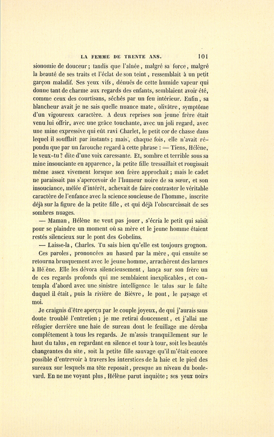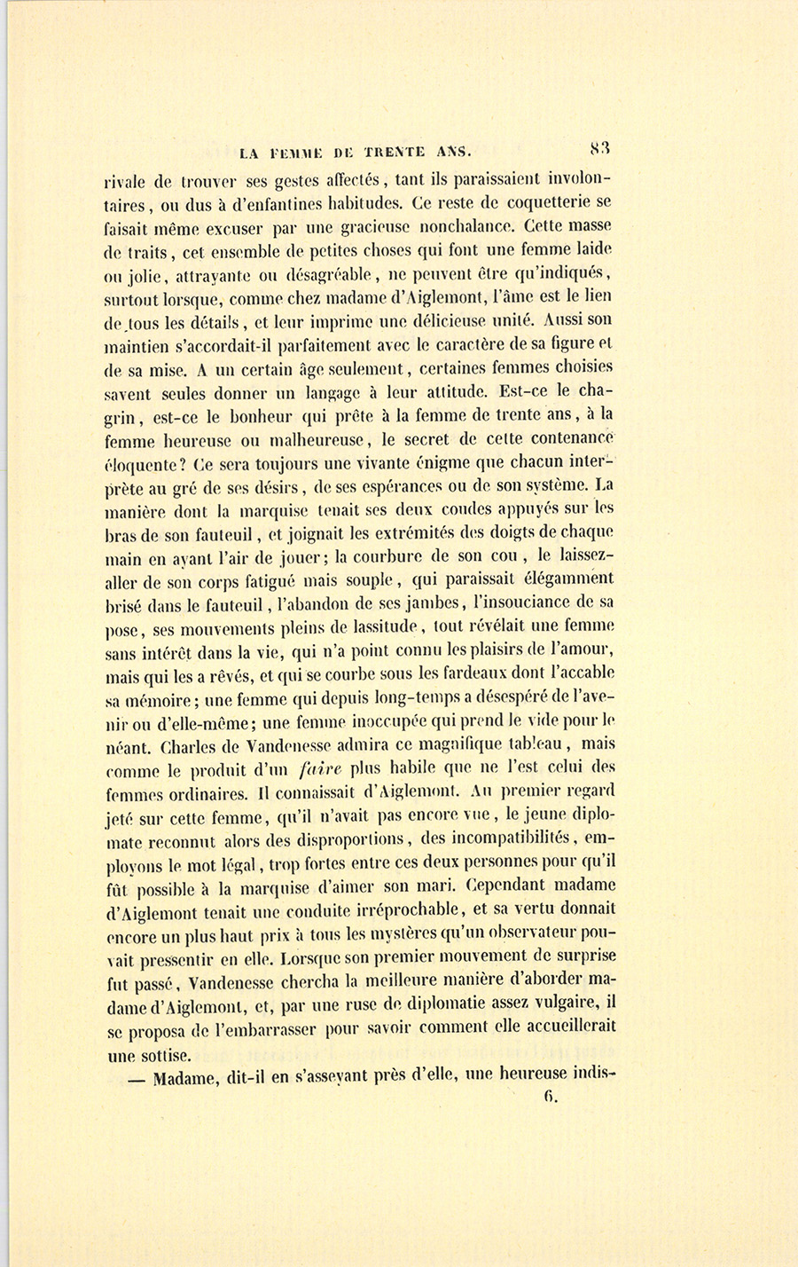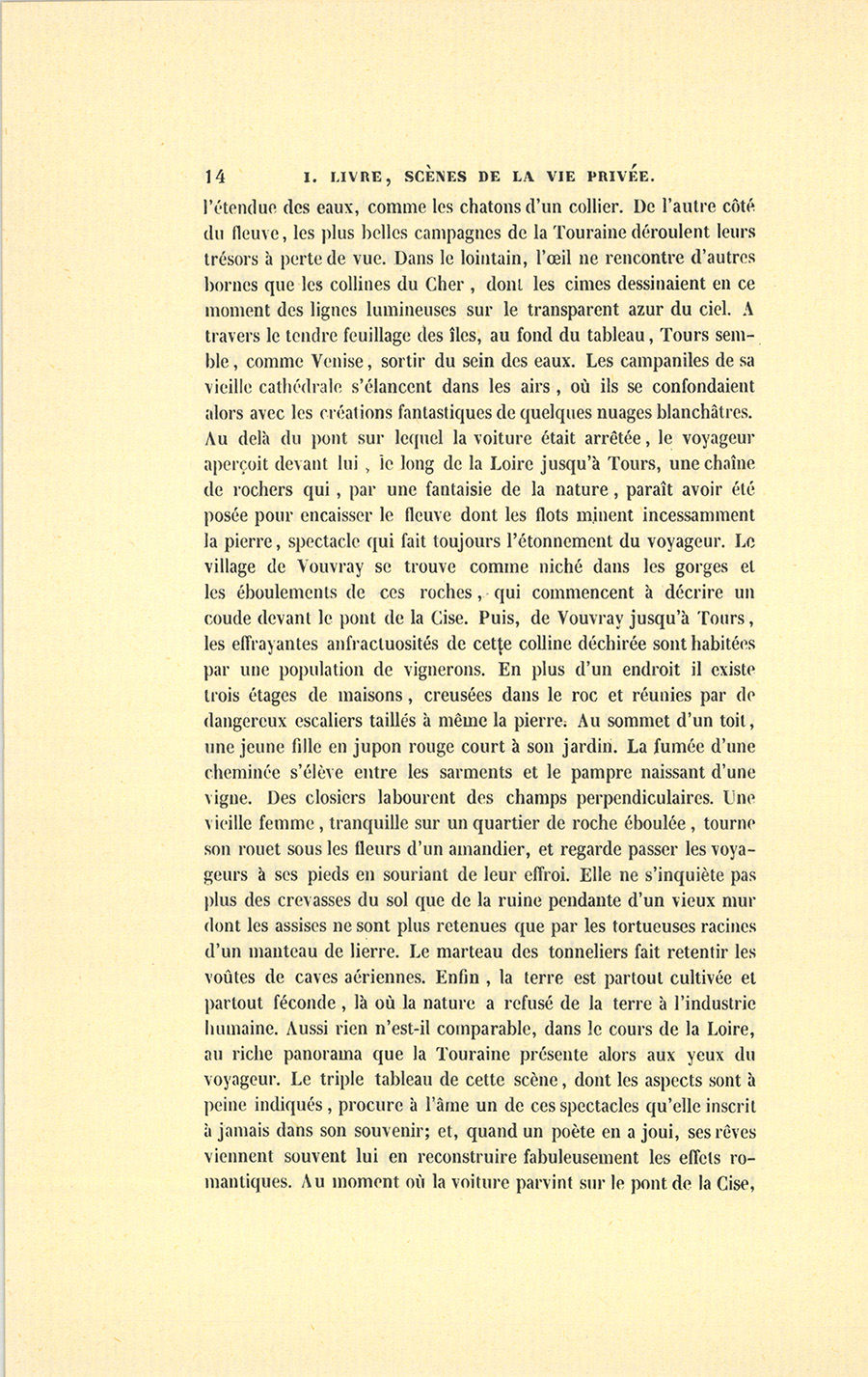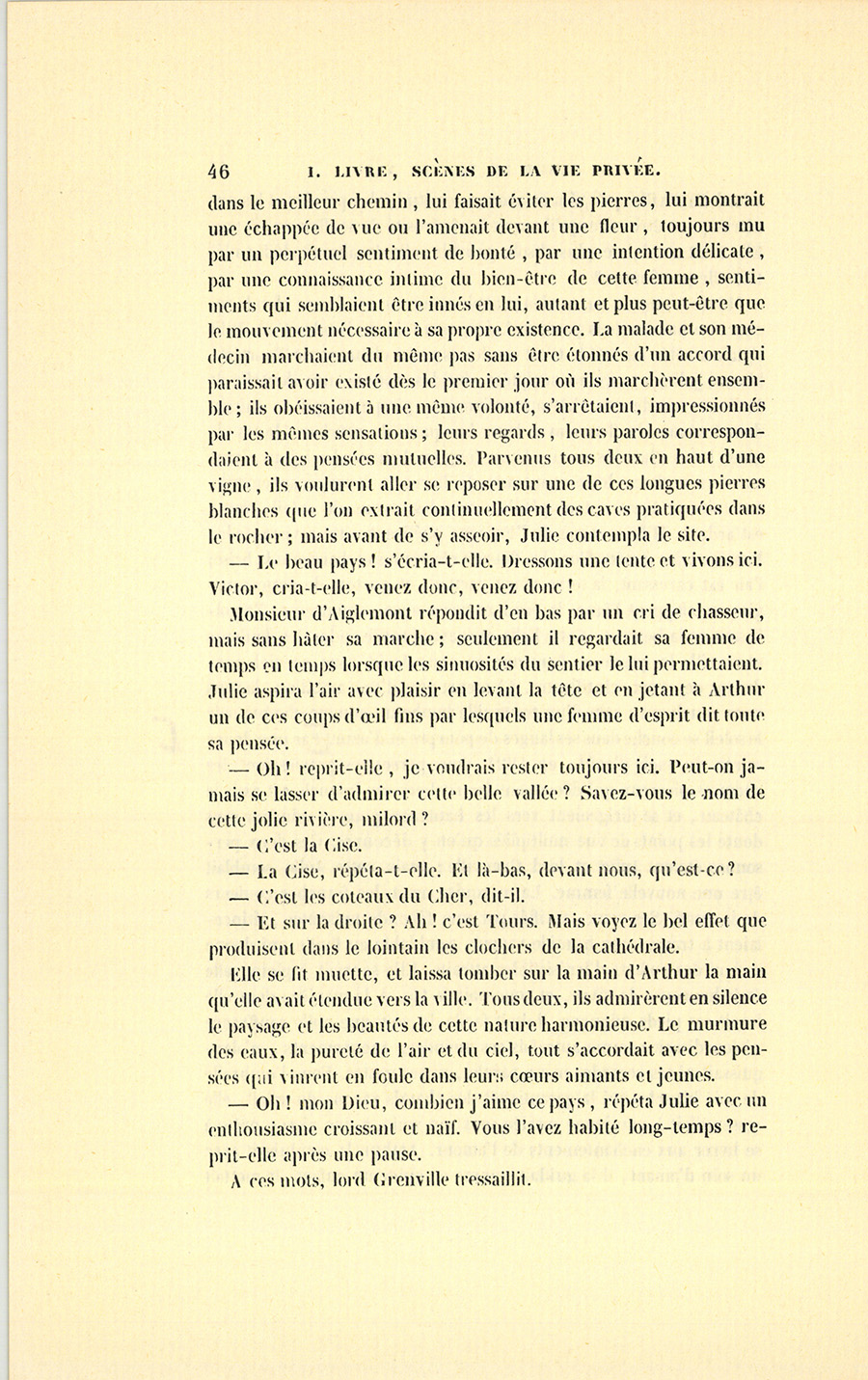 Julie avança la tête hors de la calèche. Un bonnet de martre lui servait de coiffure, et les plis du manteau fourré dans lequel elle était enveloppée déguisaient si bien ses formes qu’on ne pouvait plus voir que sa figure. Julie d’Aiglemont ne ressemblait déjà plus à la jeune fille qui courait naguère avec joie et bonheur à la revue des Tuileries. Son visage, toujours délicat, était privé des couleurs roses qui jadis lui donnaient un si riche éclat. Les touffes noires de quelques cheveux défrisés par l’humidité de la nuit faisaient ressortir la blancheur mate de sa tête, dont la vivacité semblait engourdie. Cependant ses yeux brillaient d’un feu surnaturel ; mais au-dessous de leurs paupières, quelques teintes violettes se dessinaient sur les joues fatiguées. Elle examina d’un œil indifférent les campagnes du Cher, la Loire et ses îles, Tours et les longs rochers de Vouvray ; puis, sans vouloir regarder la ravissante vallée de la Cise, elle se rejeta promptement dans le fond de la calèche, et dit {p. 16} d’une voix qui en plein air paraissait d’une extrême faiblesse : – Oui, c’est admirable. Elle avait, comme on le voit, pour son malheur, triomphé de son père.