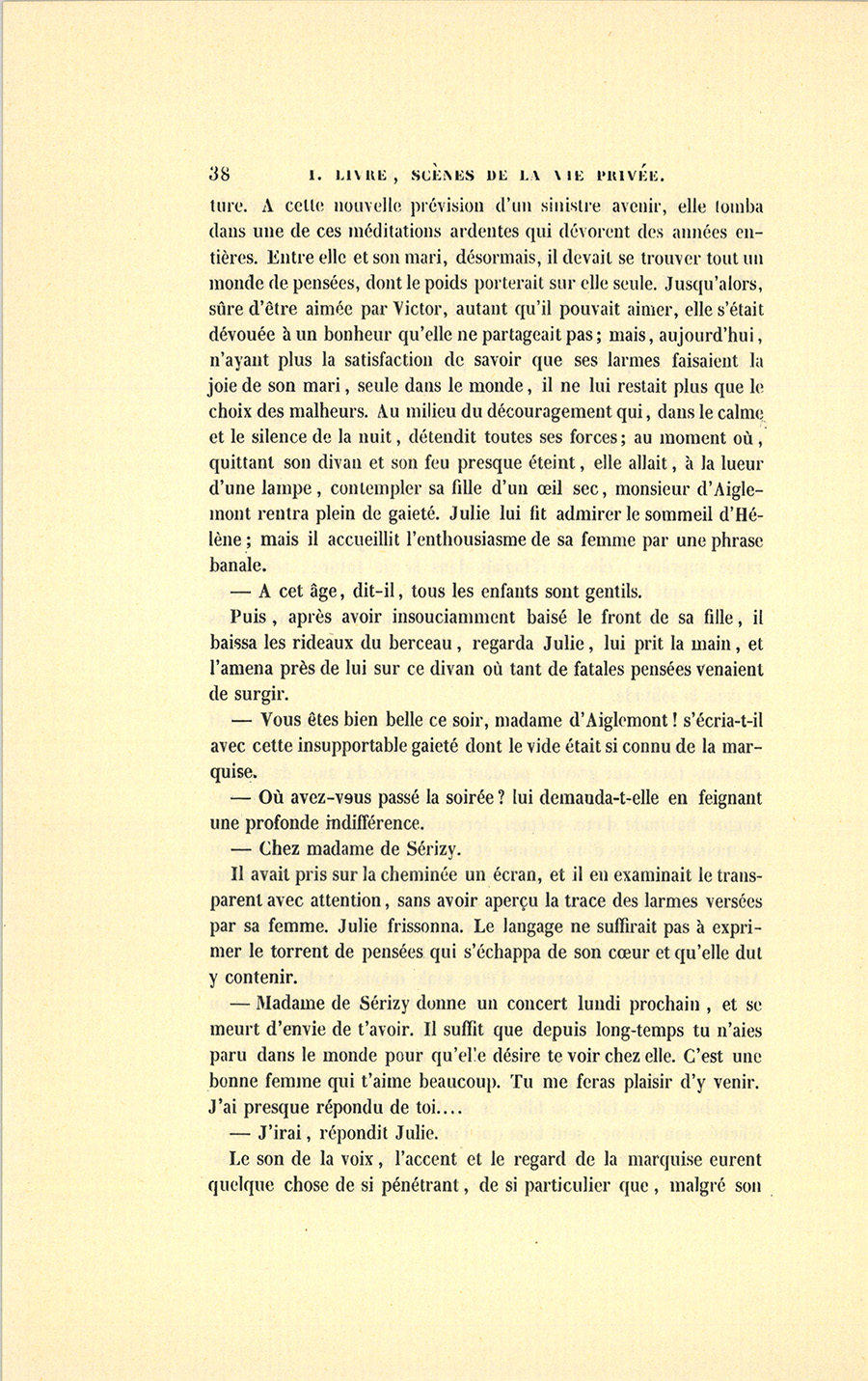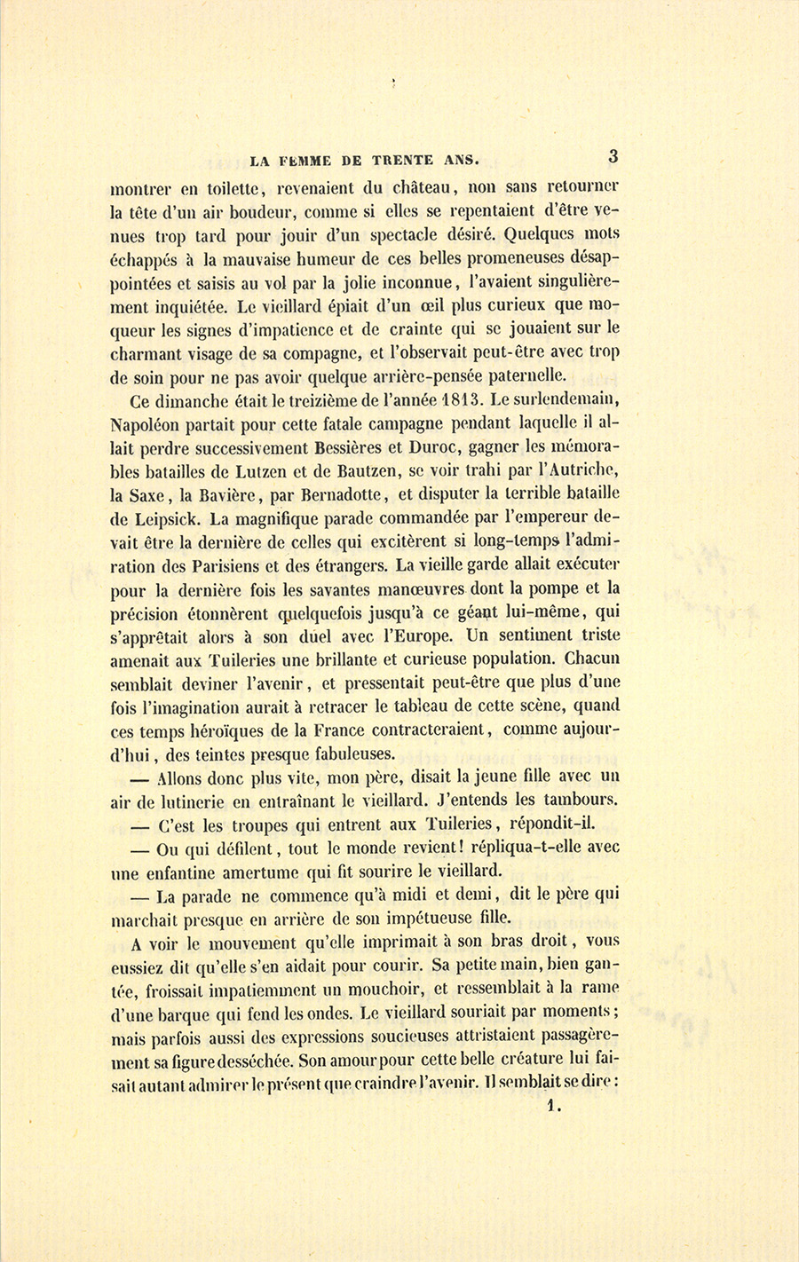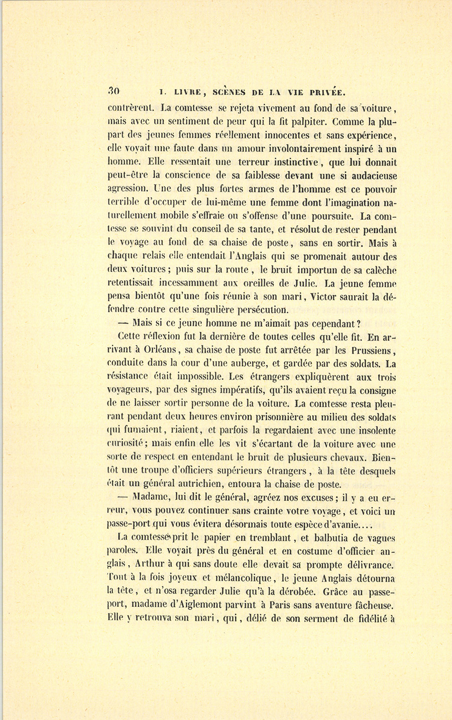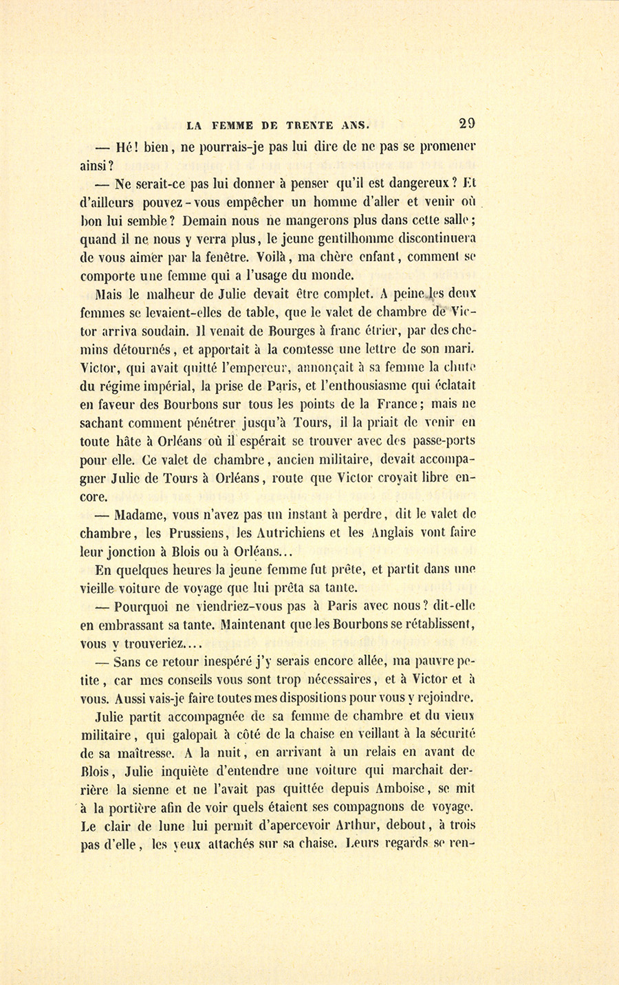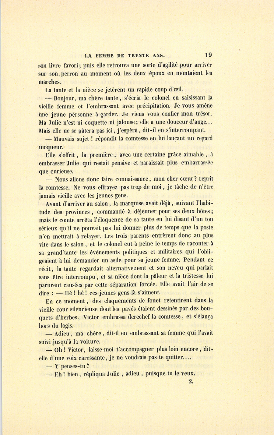 Julie avança la tête hors de la calèche. Un bonnet de martre lui servait de coiffure, et les plis du manteau fourré dans lequel elle était enveloppée déguisaient si bien ses formes qu’on ne pouvait plus voir que sa figure. Julie d’Aiglemont ne ressemblait déjà plus à la jeune fille qui courait naguère avec joie et bonheur à la revue des Tuileries. Son visage, toujours délicat, était privé des couleurs roses qui jadis lui donnaient un si riche éclat. Les touffes noires de quelques cheveux défrisés par l’humidité de la nuit faisaient ressortir la blancheur mate de sa tête, dont la vivacité semblait engourdie. Cependant ses yeux brillaient d’un feu surnaturel ; mais au-dessous de leurs paupières, quelques teintes violettes se dessinaient sur les joues fatiguées. Elle examina d’un œil indifférent les campagnes du Cher, la Loire et ses îles, Tours et les longs rochers de Vouvray ; puis, sans vouloir regarder la ravissante vallée de la Cise, elle se rejeta promptement dans le fond de la calèche, et dit {p. 16} d’une voix qui en plein air paraissait d’une extrême faiblesse : – Oui, c’est admirable. Elle avait, comme on le voit, pour son malheur, triomphé de son père.