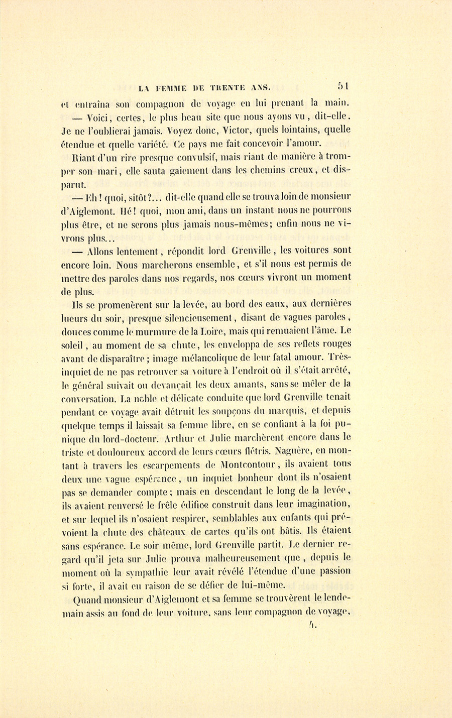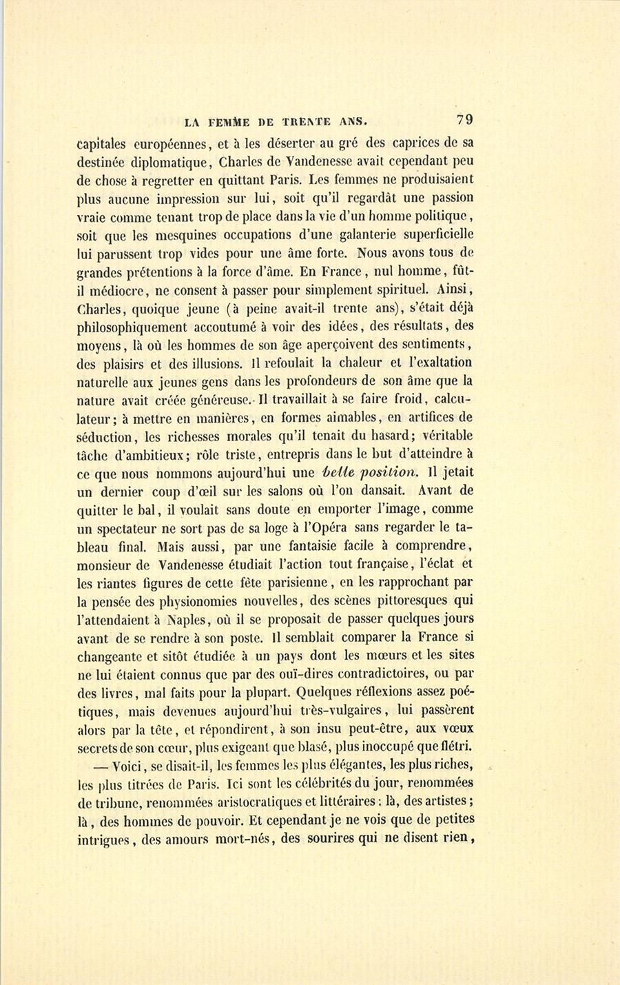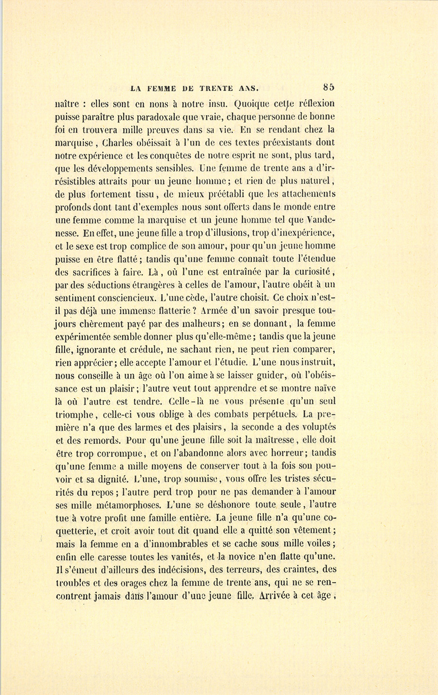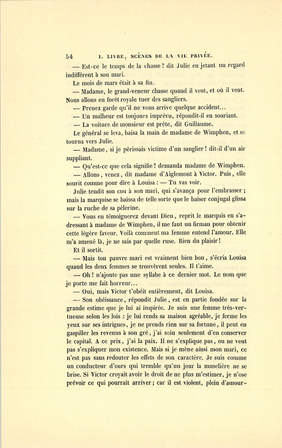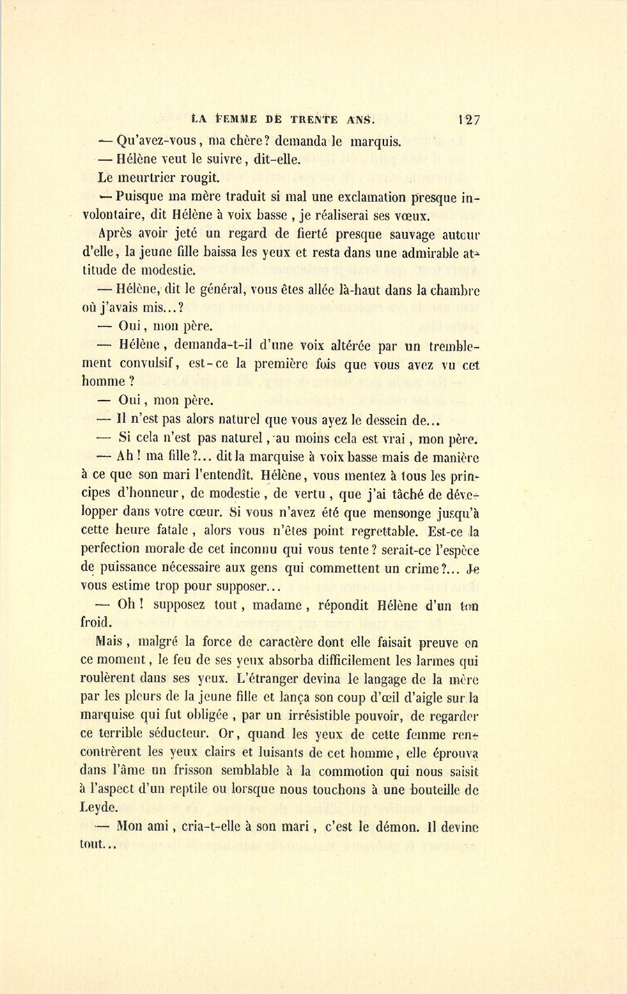 Julie avança la tête hors de la calèche. Un bonnet de martre lui servait de coiffure, et les plis du manteau fourré dans lequel elle était enveloppée déguisaient si bien ses formes qu’on ne pouvait plus voir que sa figure. Julie d’Aiglemont ne ressemblait déjà plus à la jeune fille qui courait naguère avec joie et bonheur à la revue des Tuileries. Son visage, toujours délicat, était privé des couleurs roses qui jadis lui donnaient un si riche éclat. Les touffes noires de quelques cheveux défrisés par l’humidité de la nuit faisaient ressortir la blancheur mate de sa tête, dont la vivacité semblait engourdie. Cependant ses yeux brillaient d’un feu surnaturel ; mais au-dessous de leurs paupières, quelques teintes violettes se dessinaient sur les joues fatiguées. Elle examina d’un œil indifférent les campagnes du Cher, la Loire et ses îles, Tours et les longs rochers de Vouvray ; puis, sans vouloir regarder la ravissante vallée de la Cise, elle se rejeta promptement dans le fond de la calèche, et dit {p. 16} d’une voix qui en plein air paraissait d’une extrême faiblesse : – Oui, c’est admirable. Elle avait, comme on le voit, pour son malheur, triomphé de son père.
