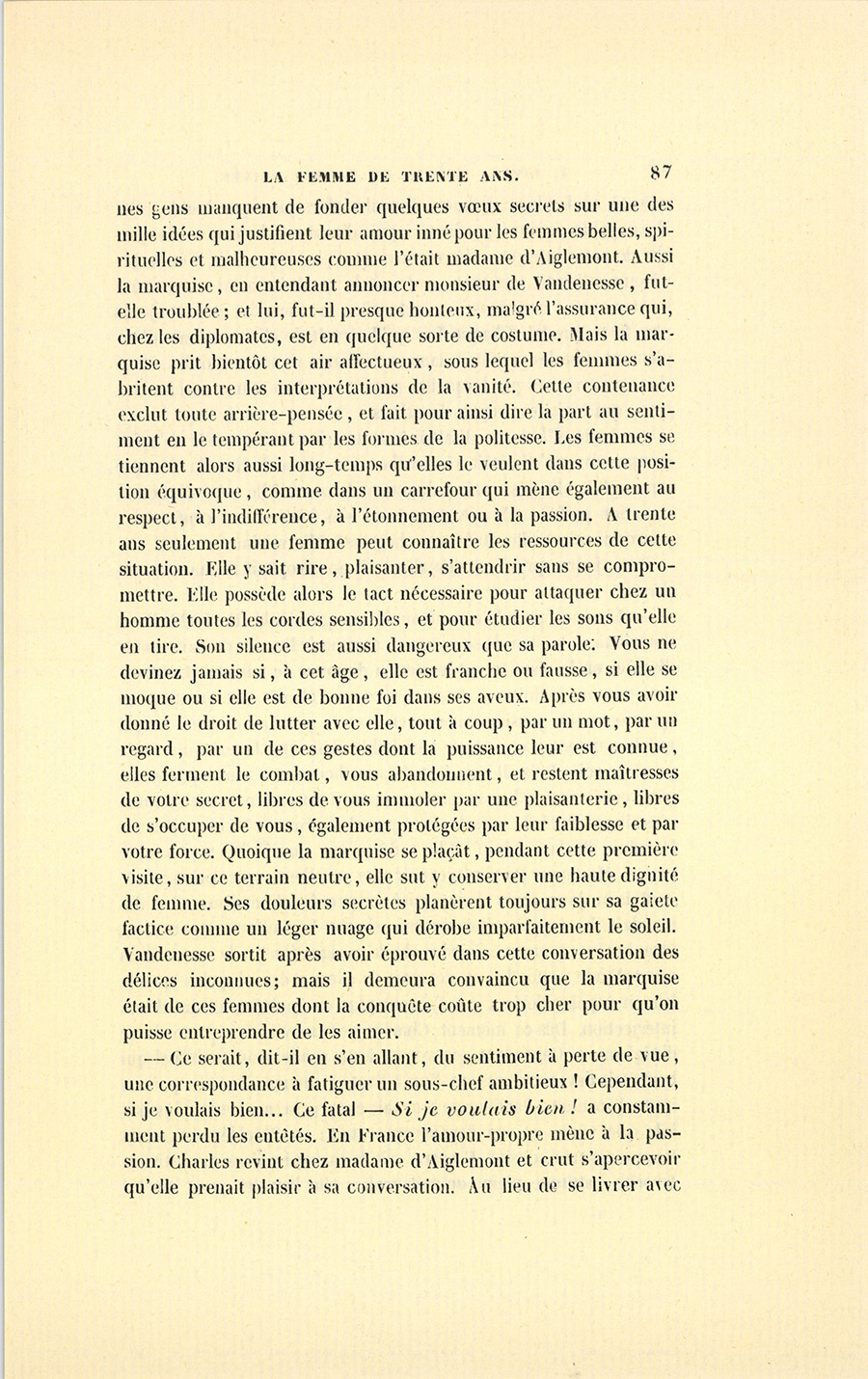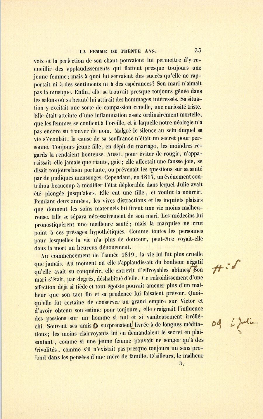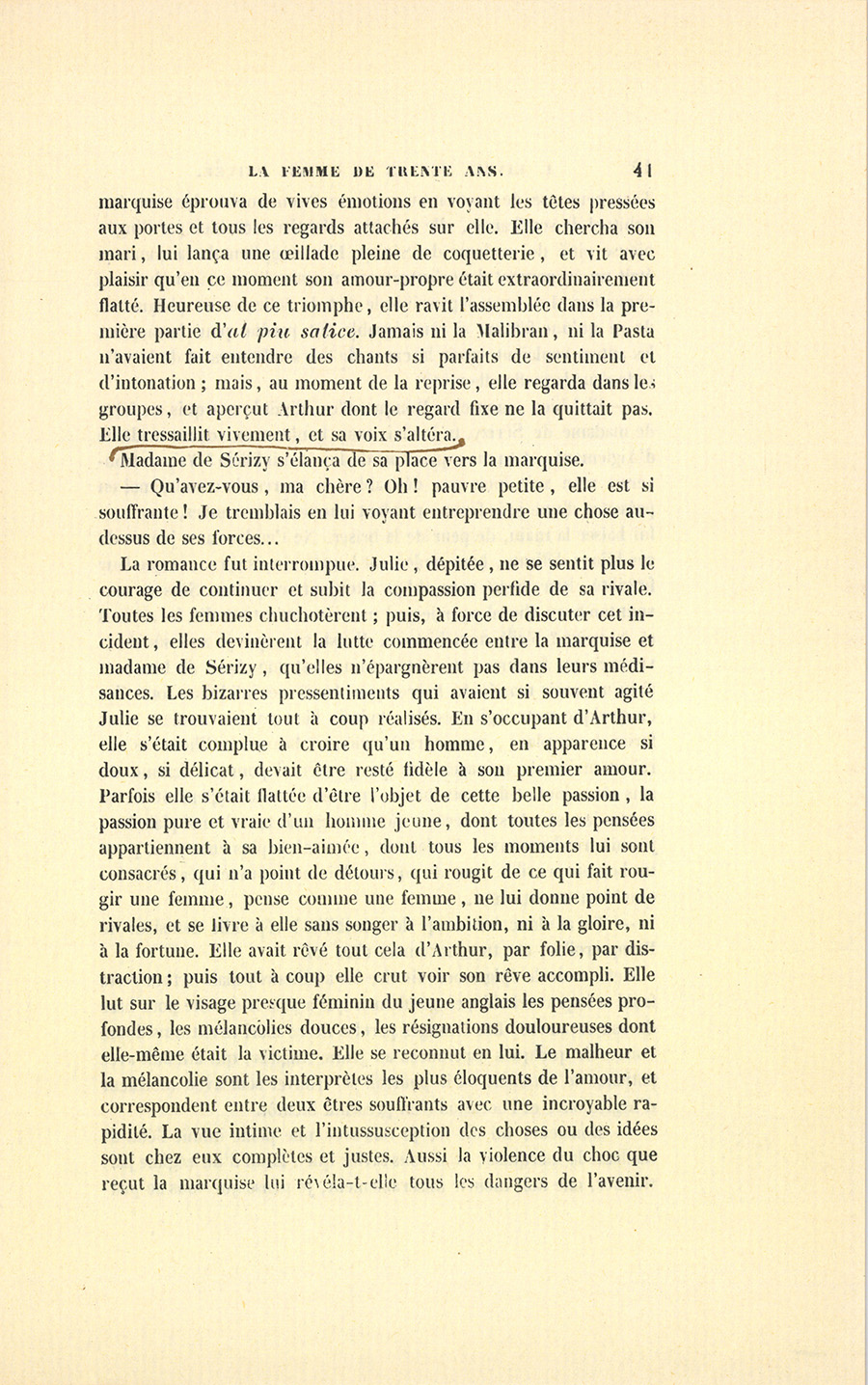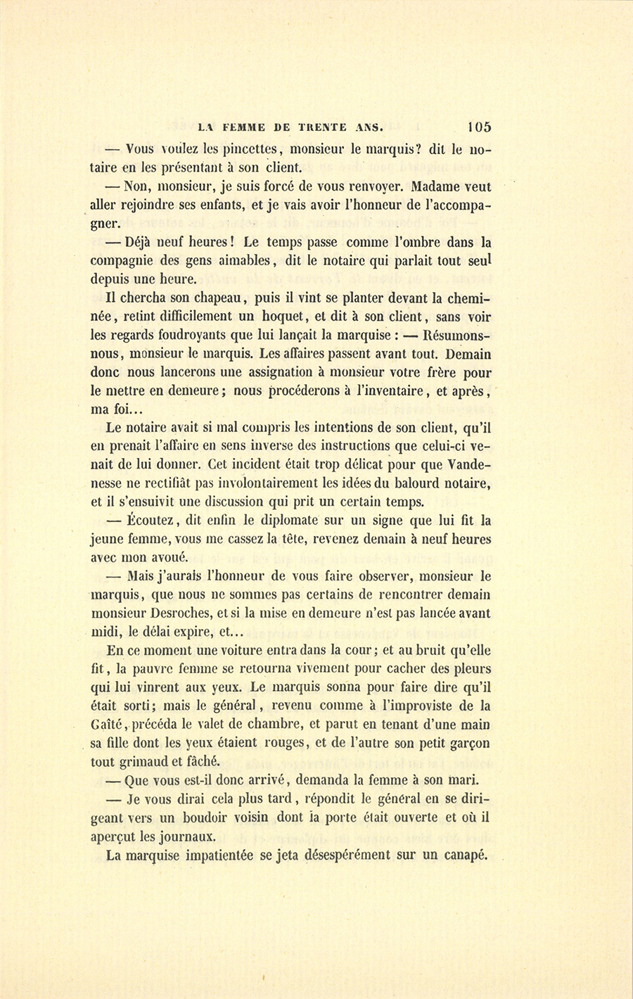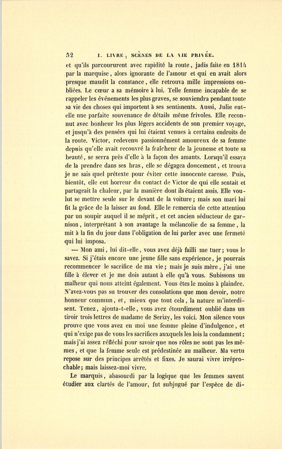 Julie avança la tête hors de la calèche. Un bonnet de martre lui servait de coiffure, et les plis du manteau fourré dans lequel elle était enveloppée déguisaient si bien ses formes qu’on ne pouvait plus voir que sa figure. Julie d’Aiglemont ne ressemblait déjà plus à la jeune fille qui courait naguère avec joie et bonheur à la revue des Tuileries. Son visage, toujours délicat, était privé des couleurs roses qui jadis lui donnaient un si riche éclat. Les touffes noires de quelques cheveux défrisés par l’humidité de la nuit faisaient ressortir la blancheur mate de sa tête, dont la vivacité semblait engourdie. Cependant ses yeux brillaient d’un feu surnaturel ; mais au-dessous de leurs paupières, quelques teintes violettes se dessinaient sur les joues fatiguées. Elle examina d’un œil indifférent les campagnes du Cher, la Loire et ses îles, Tours et les longs rochers de Vouvray ; puis, sans vouloir regarder la ravissante vallée de la Cise, elle se rejeta promptement dans le fond de la calèche, et dit {p. 16} d’une voix qui en plein air paraissait d’une extrême faiblesse : – Oui, c’est admirable. Elle avait, comme on le voit, pour son malheur, triomphé de son père.