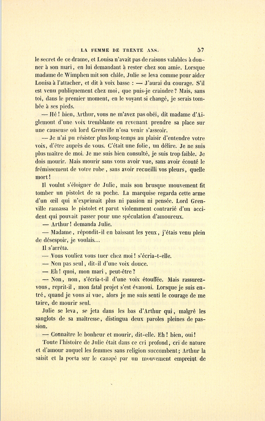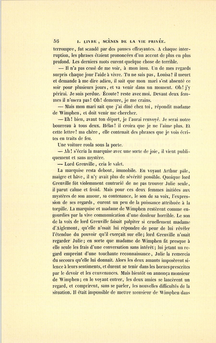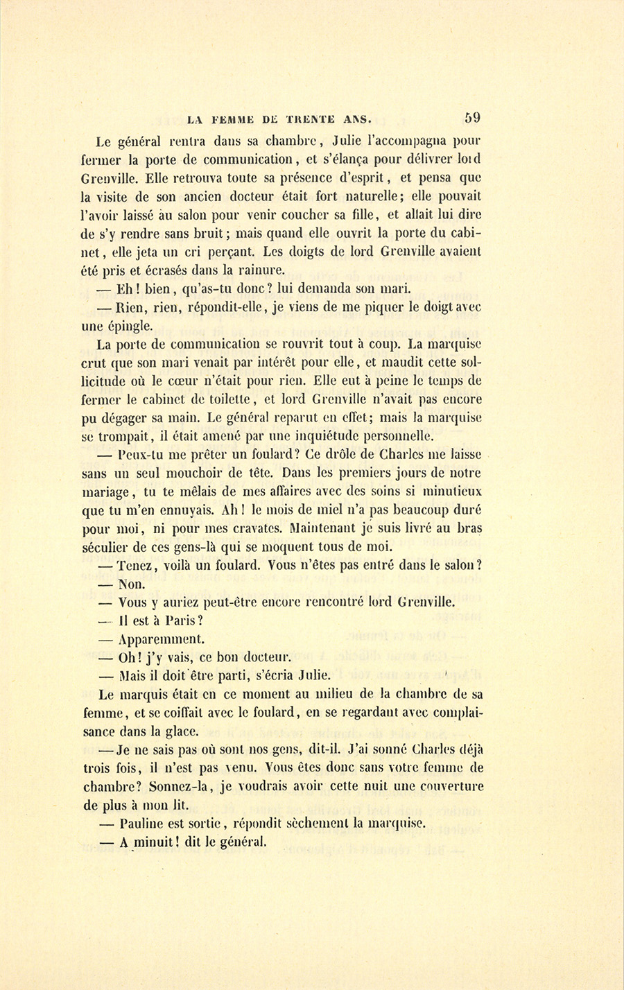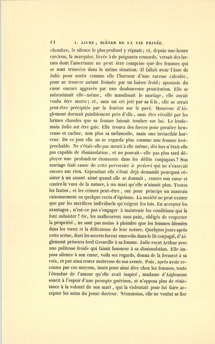 Julie avança la tête hors de la calèche. Un bonnet de martre lui servait de coiffure, et les plis du manteau fourré dans lequel elle était enveloppée déguisaient si bien ses formes qu’on ne pouvait plus voir que sa figure. Julie d’Aiglemont ne ressemblait déjà plus à la jeune fille qui courait naguère avec joie et bonheur à la revue des Tuileries. Son visage, toujours délicat, était privé des couleurs roses qui jadis lui donnaient un si riche éclat. Les touffes noires de quelques cheveux défrisés par l’humidité de la nuit faisaient ressortir la blancheur mate de sa tête, dont la vivacité semblait engourdie. Cependant ses yeux brillaient d’un feu surnaturel ; mais au-dessous de leurs paupières, quelques teintes violettes se dessinaient sur les joues fatiguées. Elle examina d’un œil indifférent les campagnes du Cher, la Loire et ses îles, Tours et les longs rochers de Vouvray ; puis, sans vouloir regarder la ravissante vallée de la Cise, elle se rejeta promptement dans le fond de la calèche, et dit {p. 16} d’une voix qui en plein air paraissait d’une extrême faiblesse : – Oui, c’est admirable. Elle avait, comme on le voit, pour son malheur, triomphé de son père.