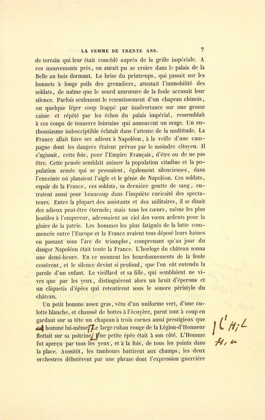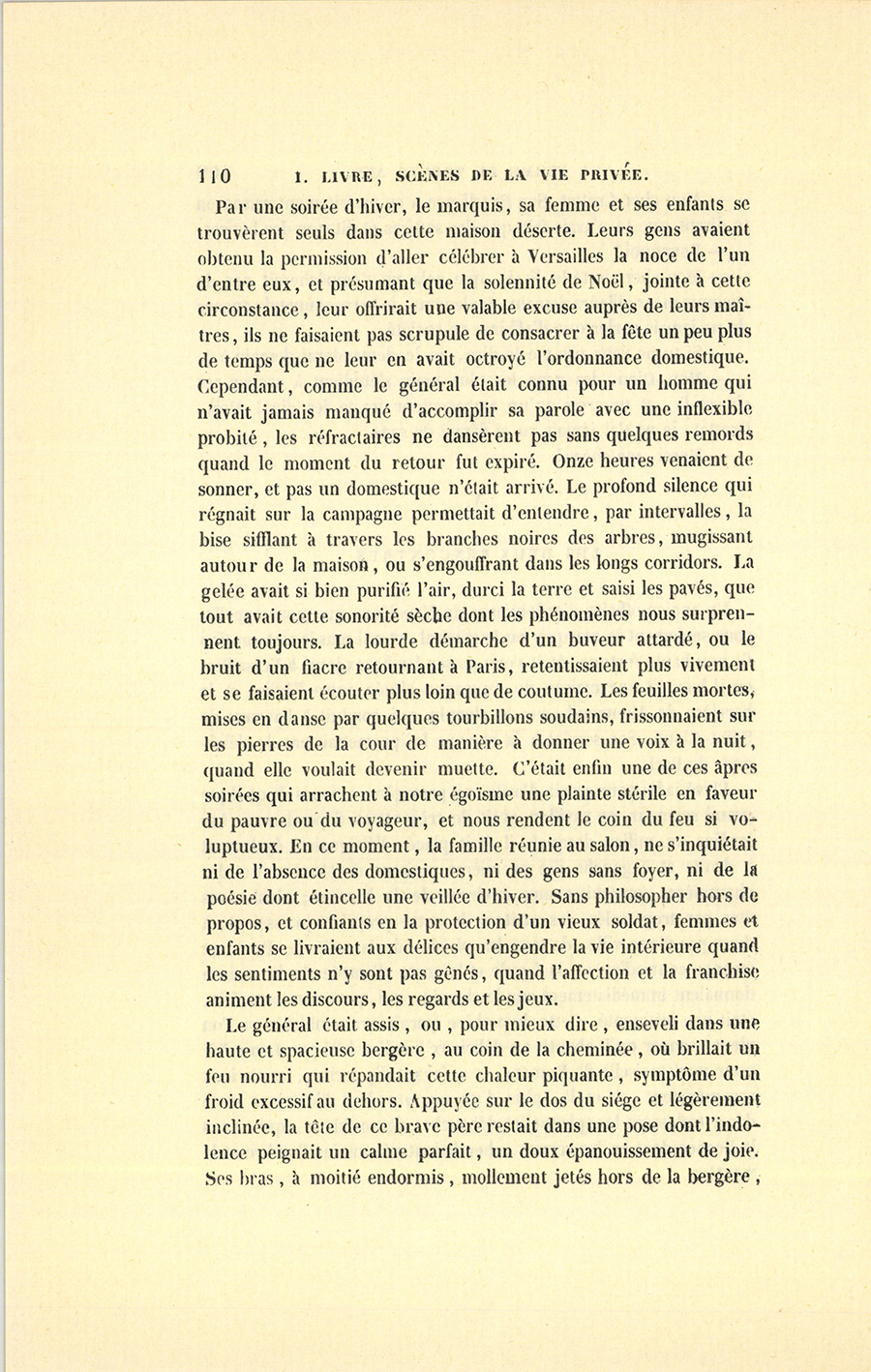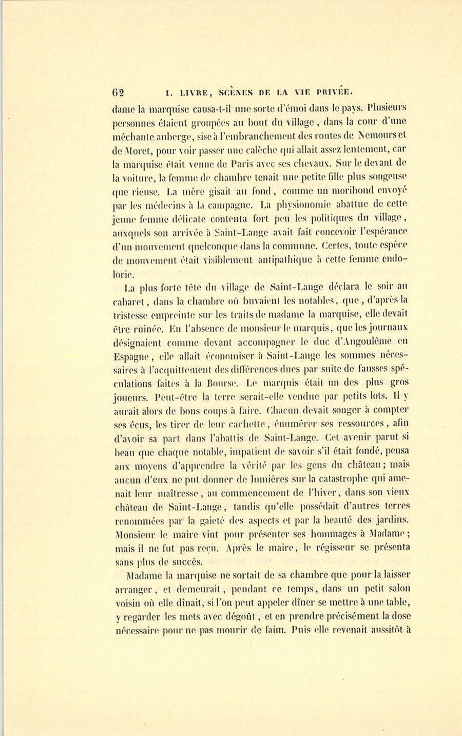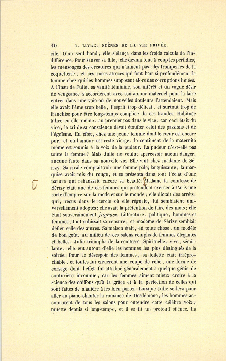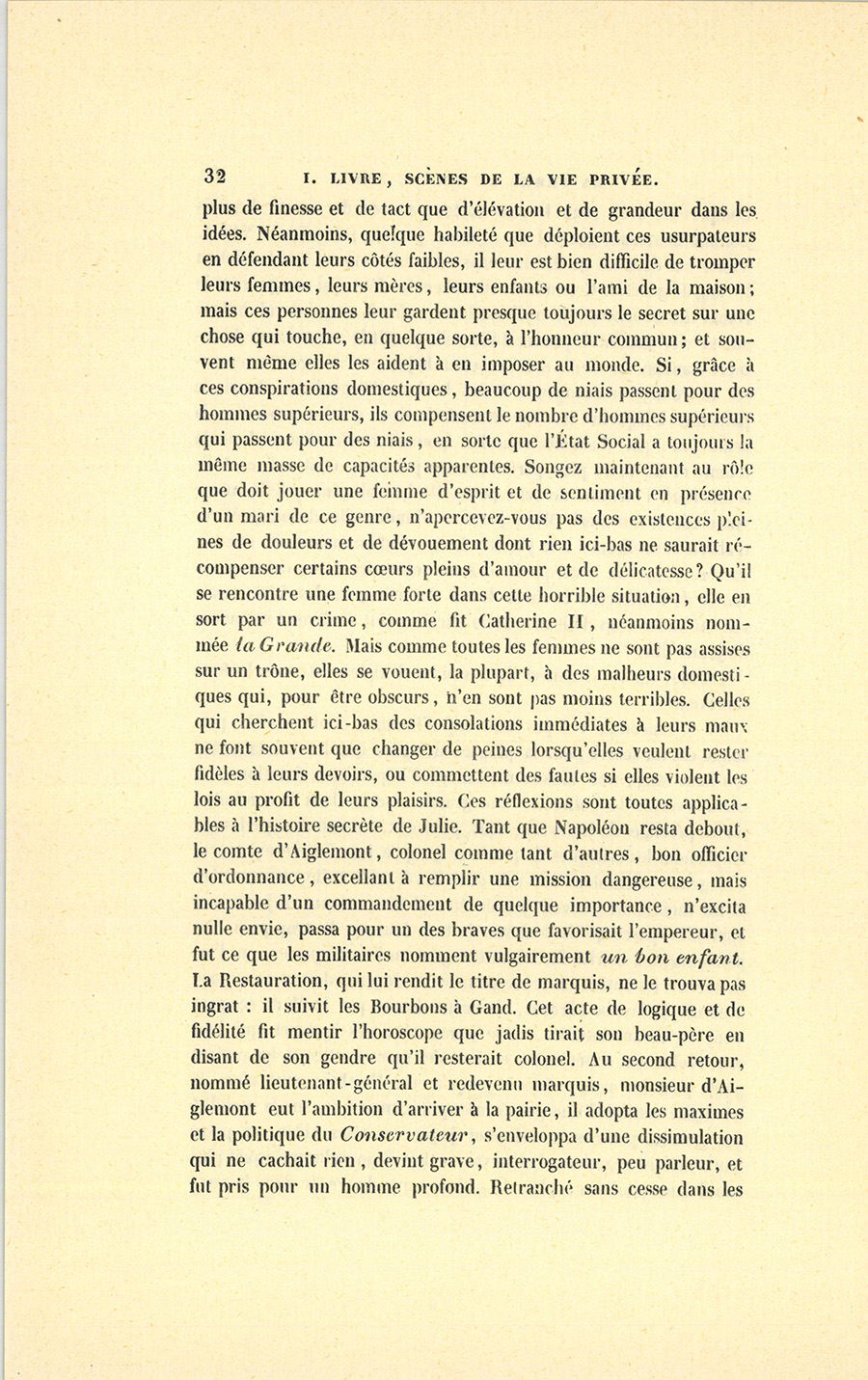 Julie avança la tête hors de la calèche. Un bonnet de martre lui servait de coiffure, et les plis du manteau fourré dans lequel elle était enveloppée déguisaient si bien ses formes qu’on ne pouvait plus voir que sa figure. Julie d’Aiglemont ne ressemblait déjà plus à la jeune fille qui courait naguère avec joie et bonheur à la revue des Tuileries. Son visage, toujours délicat, était privé des couleurs roses qui jadis lui donnaient un si riche éclat. Les touffes noires de quelques cheveux défrisés par l’humidité de la nuit faisaient ressortir la blancheur mate de sa tête, dont la vivacité semblait engourdie. Cependant ses yeux brillaient d’un feu surnaturel ; mais au-dessous de leurs paupières, quelques teintes violettes se dessinaient sur les joues fatiguées. Elle examina d’un œil indifférent les campagnes du Cher, la Loire et ses îles, Tours et les longs rochers de Vouvray ; puis, sans vouloir regarder la ravissante vallée de la Cise, elle se rejeta promptement dans le fond de la calèche, et dit {p. 16} d’une voix qui en plein air paraissait d’une extrême faiblesse : – Oui, c’est admirable. Elle avait, comme on le voit, pour son malheur, triomphé de son père.