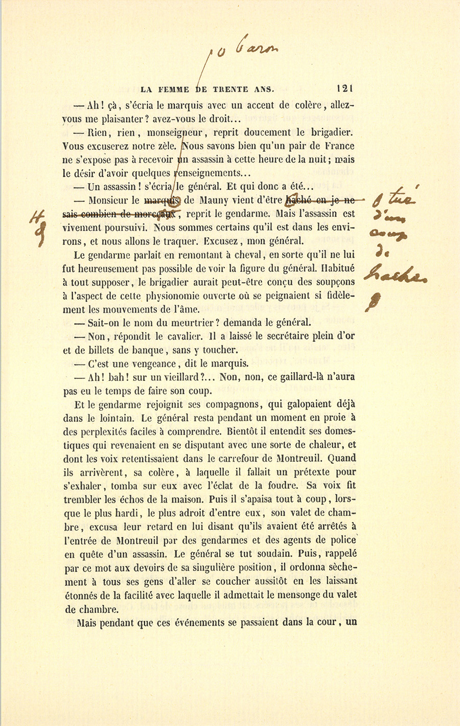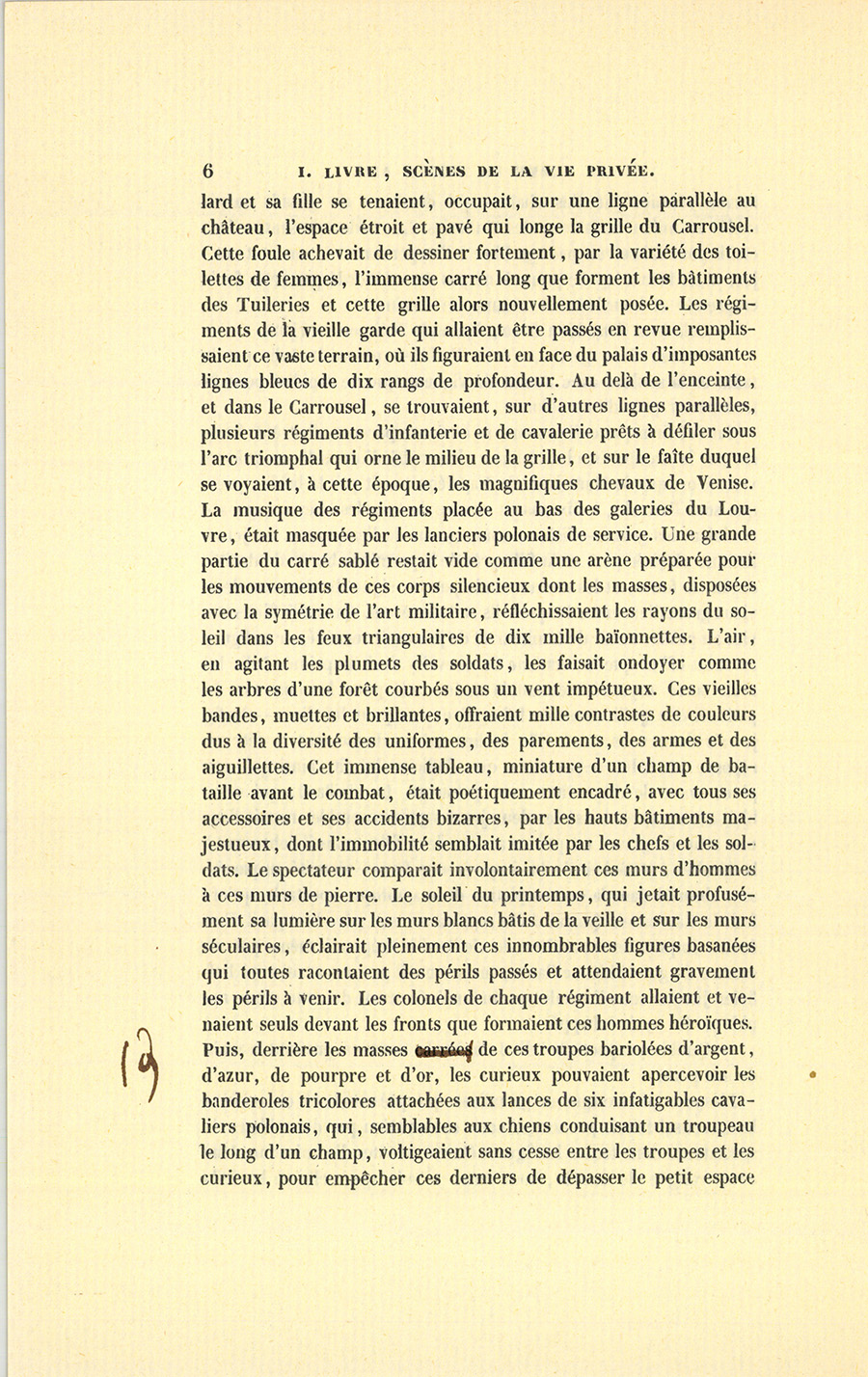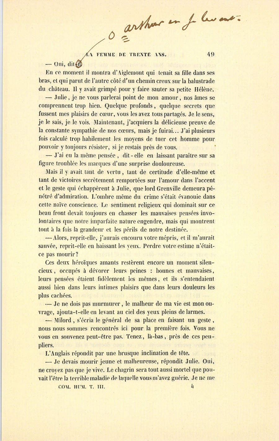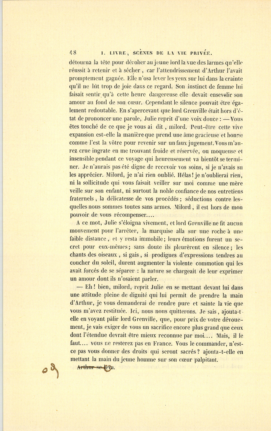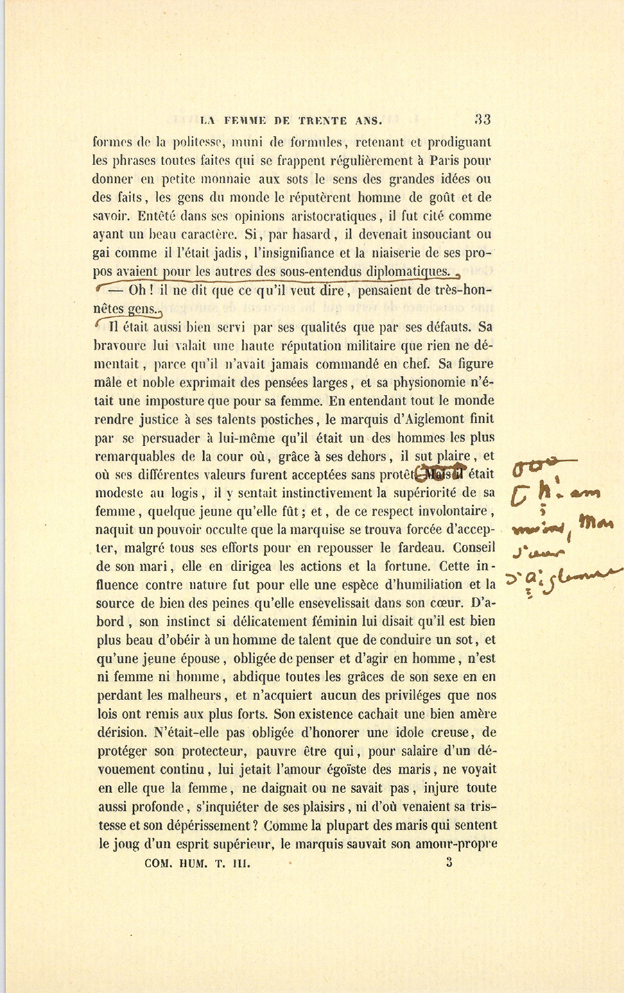 Julie avança la tête hors de la calèche. Un bonnet de martre lui servait de coiffure, et les plis du manteau fourré dans lequel elle était enveloppée déguisaient si bien ses formes qu’on ne pouvait plus voir que sa figure. Julie d’Aiglemont ne ressemblait déjà plus à la jeune fille qui courait naguère avec joie et bonheur à la revue des Tuileries. Son visage, toujours délicat, était privé des couleurs roses qui jadis lui donnaient un si riche éclat. Les touffes noires de quelques cheveux défrisés par l’humidité de la nuit faisaient ressortir la blancheur mate de sa tête, dont la vivacité semblait engourdie. Cependant ses yeux brillaient d’un feu surnaturel ; mais au-dessous de leurs paupières, quelques teintes violettes se dessinaient sur les joues fatiguées. Elle examina d’un œil indifférent les campagnes du Cher, la Loire et ses îles, Tours et les longs rochers de Vouvray ; puis, sans vouloir regarder la ravissante vallée de la Cise, elle se rejeta promptement dans le fond de la calèche, et dit {p. 16} d’une voix qui en plein air paraissait d’une extrême faiblesse : – Oui, c’est admirable. Elle avait, comme on le voit, pour son malheur, triomphé de son père.