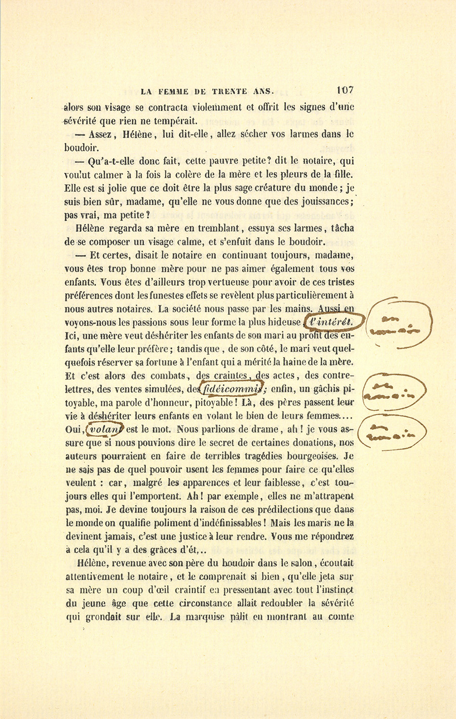 – Le matin, répondait le vieil observateur à voix basse, le matin, la chère Moïna dort. À quatre heures, la chère Moïna est au bois. Le soir, la chère Moïna va au bal ou aux Bouffes… Mais il est vrai que madame d’Aiglemont a la ressource de voir sa chère fille pendant qu’elle s’habille, ou durant le dîner lorsque la chère Moïna dîne par hasard avec sa chère mère. – Il n’y a pas encore huit jours, monsieur, dit le parasite en prenant par le bras un timide précepteur, nouveau-venu dans la maison où il se trouvait, que je vis cette pauvre mère triste et seule au coin de son feu. – Qu’avez-vous ? lui demandai-je. La marquise me regarda en souriant, mais elle avait certes pleuré. – Je pensais, me disait-elle, qu’il est bien singulier de me trouver seule, après avoir eu cinq enfants ; mais cela est dans notre destinée ! Et puis, je suis heureuse quand je sais que Moïna s’amuse ! Elle pouvait se confier à moi, qui, jadis, ai connu son mari. C’était un pauvre homme, et il a été bien heureux de l’avoir pour femme ; il lui devait certes sa pairie et sa charge à la cour de Charles X.